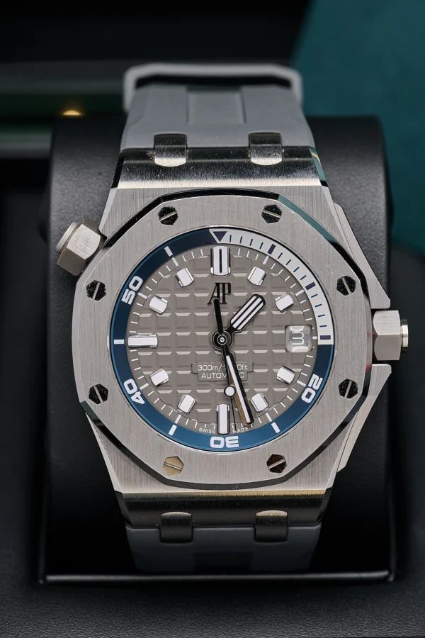This 2024 Audemars Piguet Royal Oak Diver 15720ST is a 42mm stainless steel professional dive watch with a grey “Méga Tapisserie” dial and rotating inner bezel for elapsed dive time. Powered by the automatic Calibre 4308, it provides a 60-hour power reserve and is water-resistant to 300 meters. This 2024 model comes with a stainless steel bracelet and offers the combination of sporty functionality and the signature Royal Oak aesthetic.