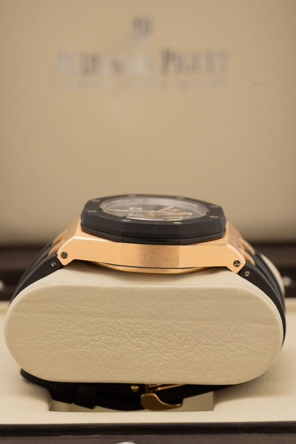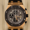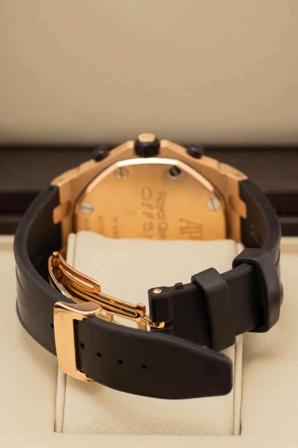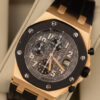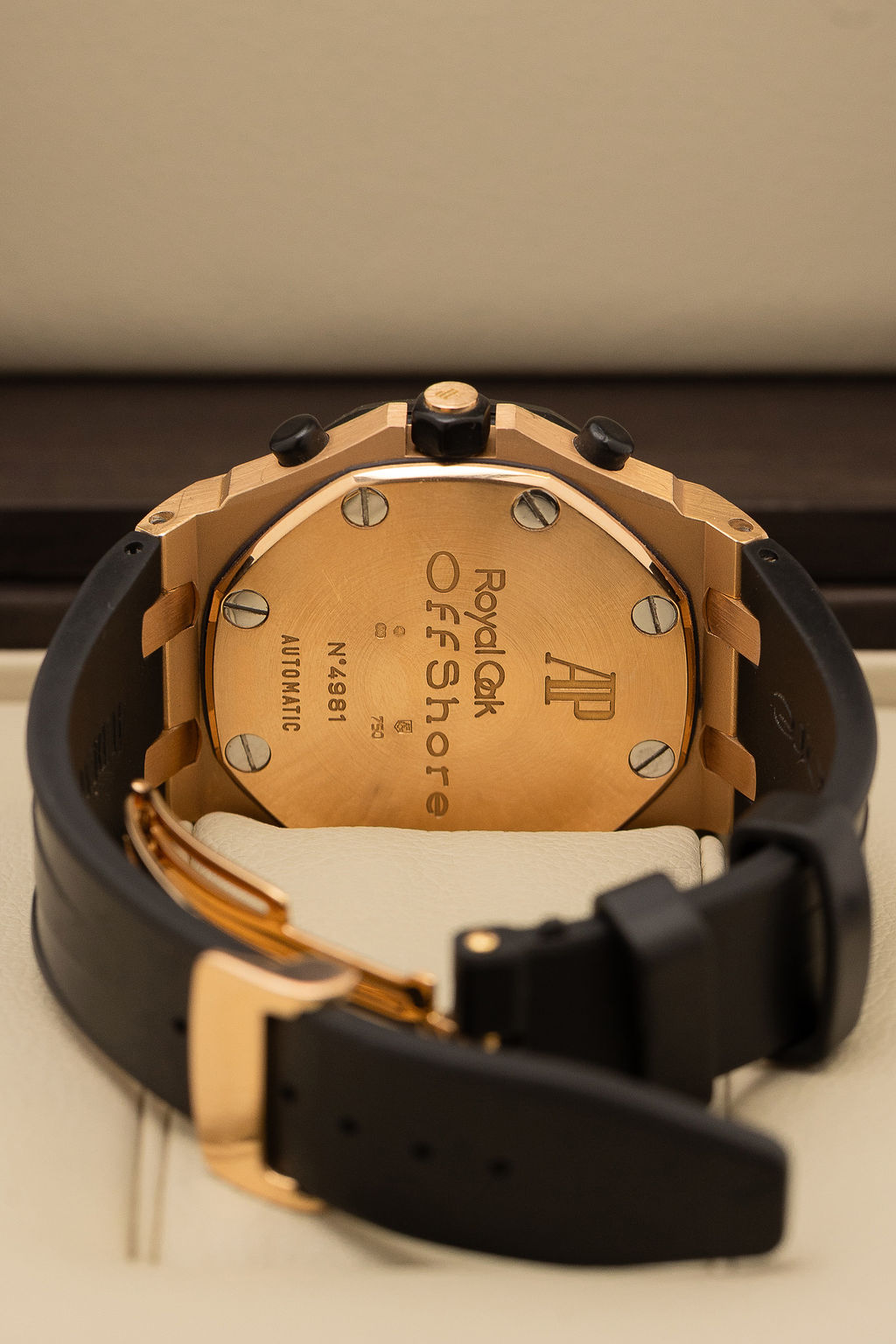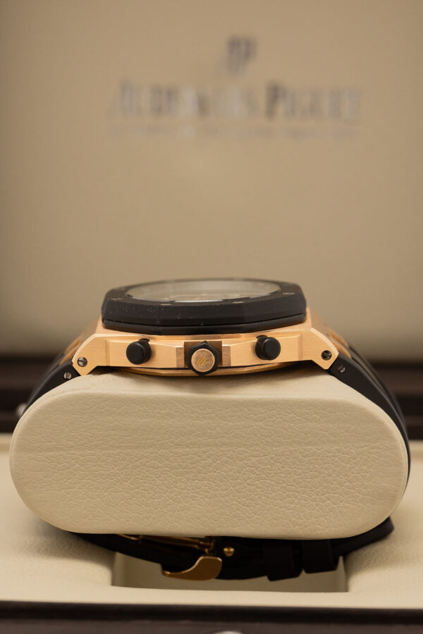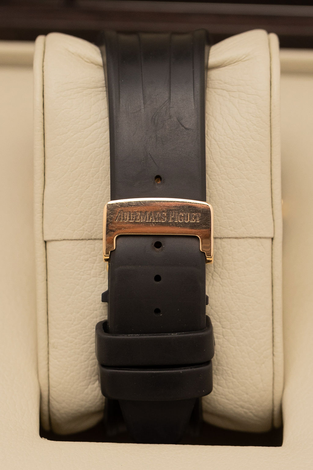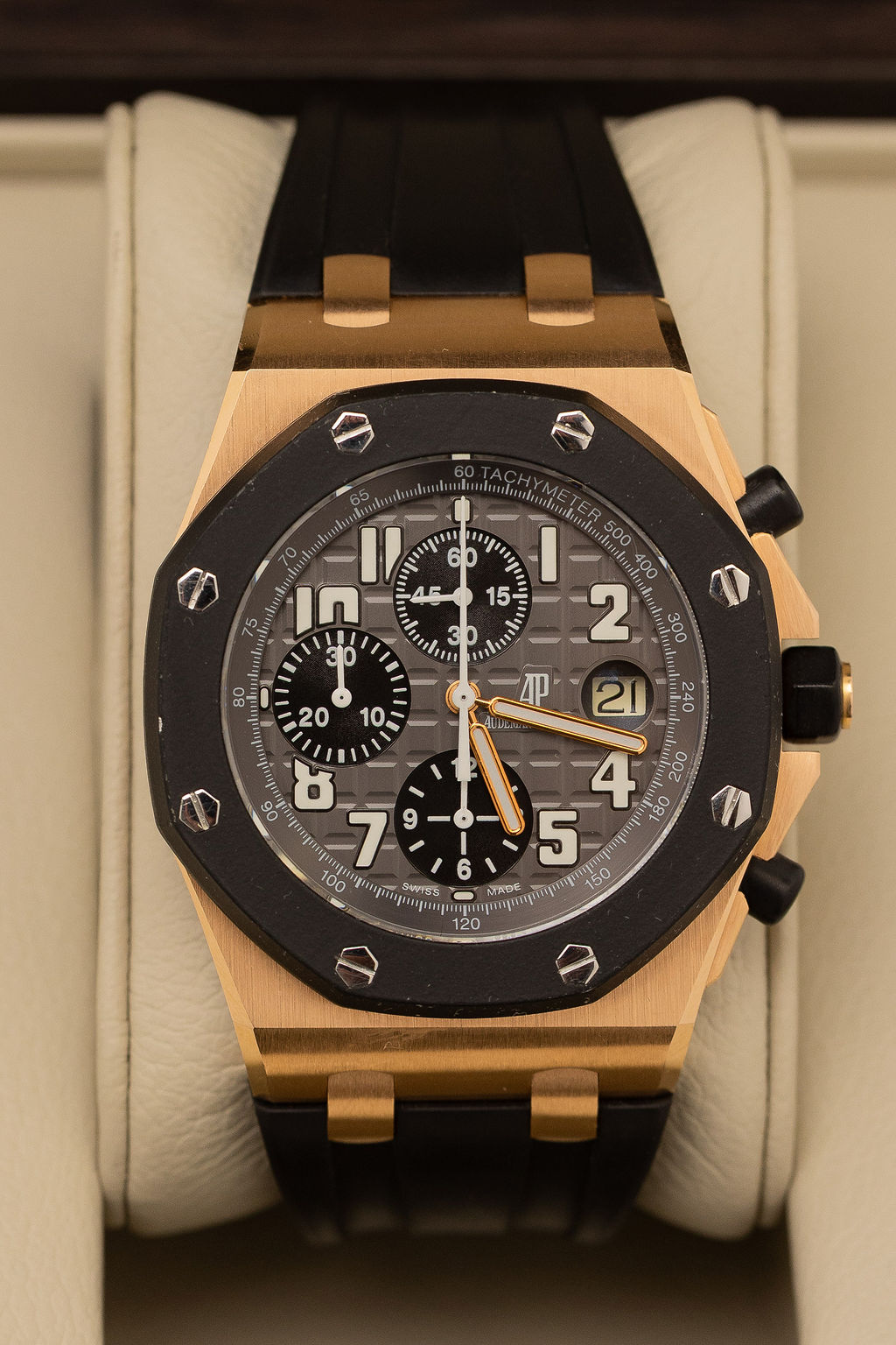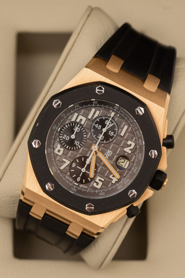 This Audemars Piguet Royal Oak Offshore 25940OK is a bold 42mm chronograph that seamlessly fuses luxury and sport. This watch is currently fitted with the distinctive original 18K rose gold case with black rubber-clad bezel and the classic grey Méga Tapisserie dial, we also have a half-brick dial and rose gold bezel as shown in the last two photos (£2,950).