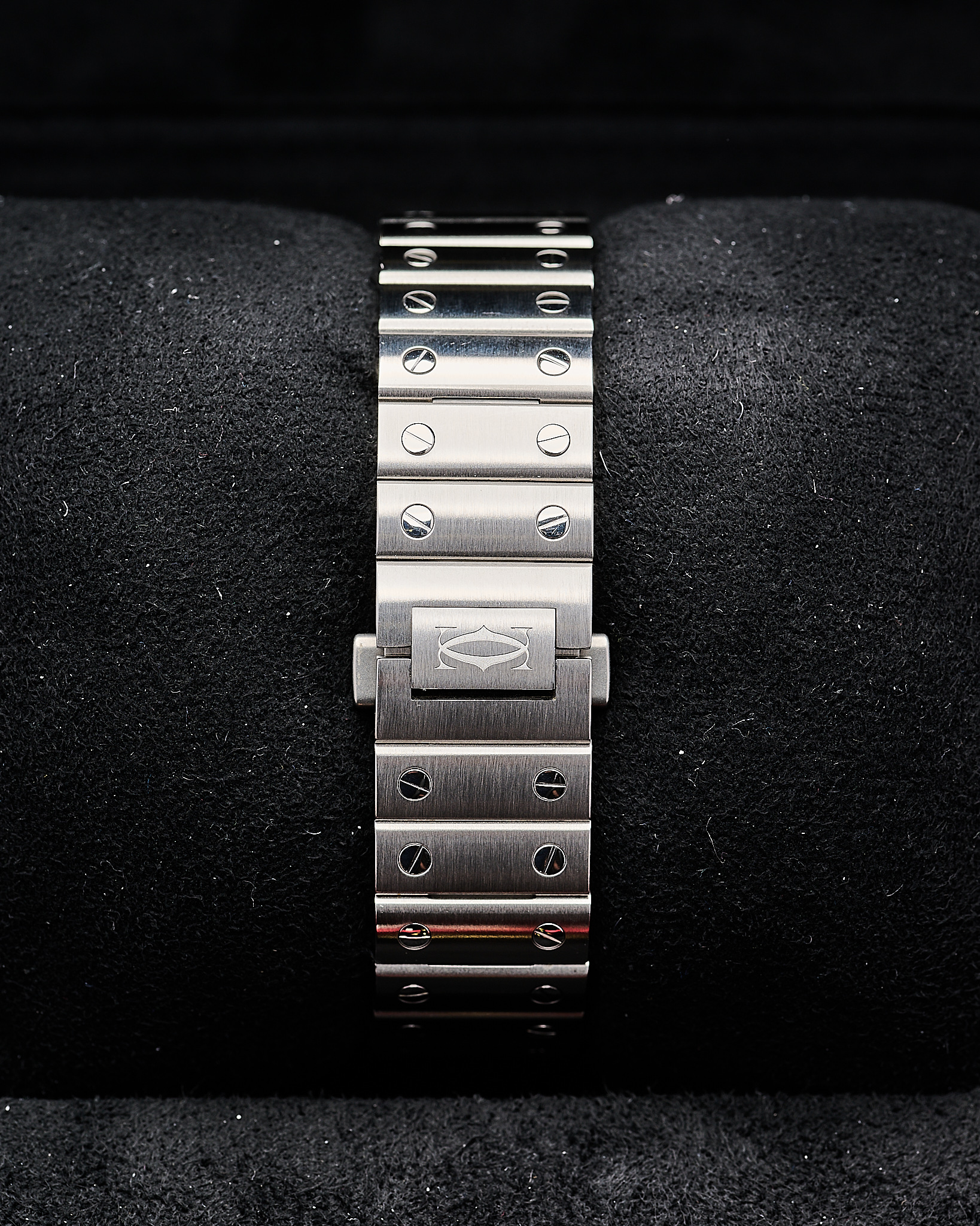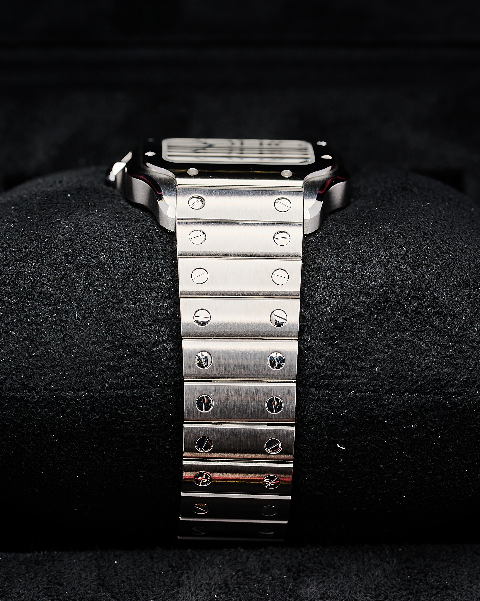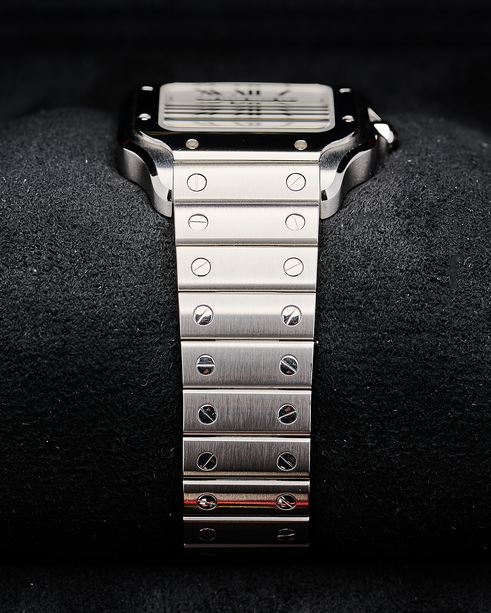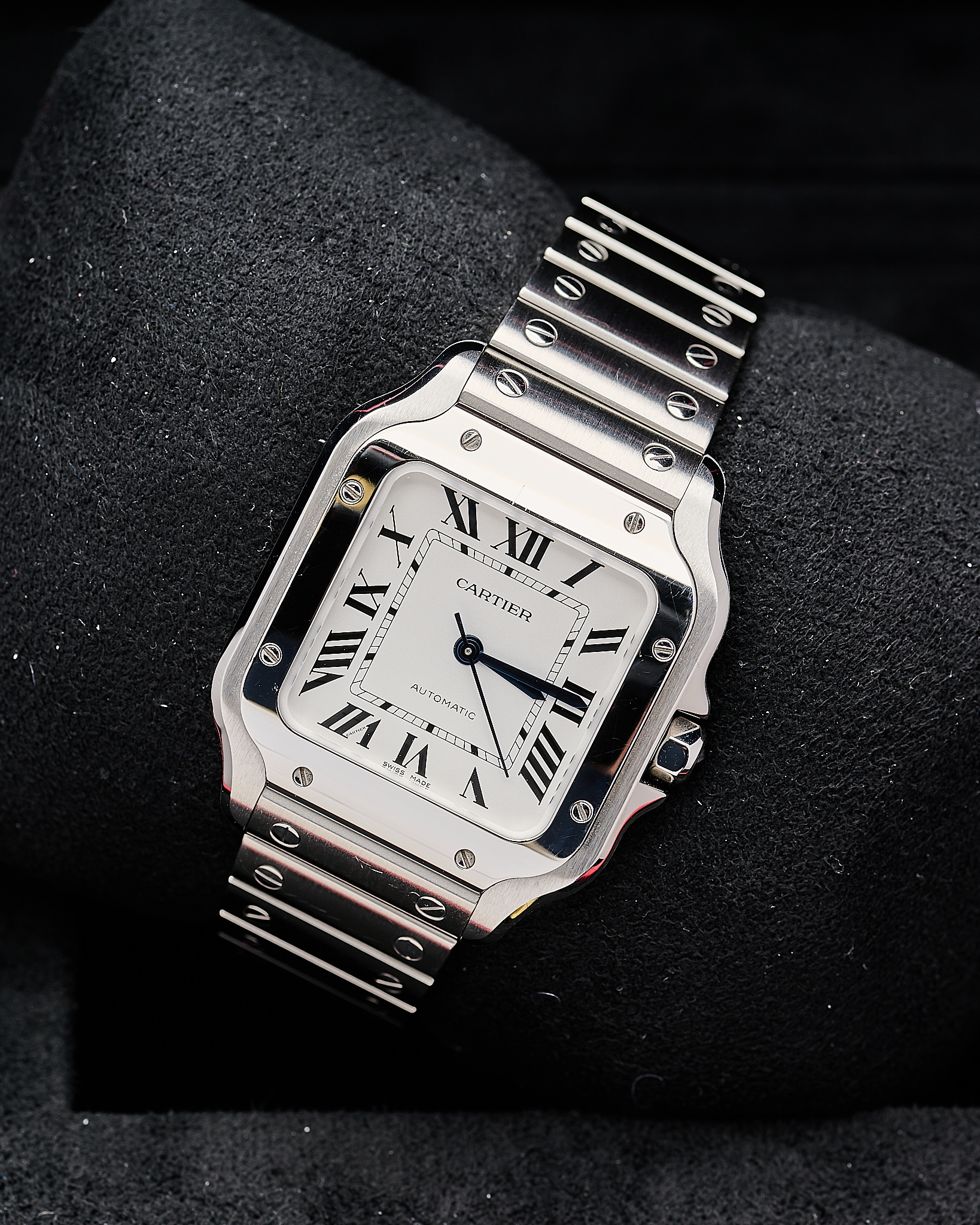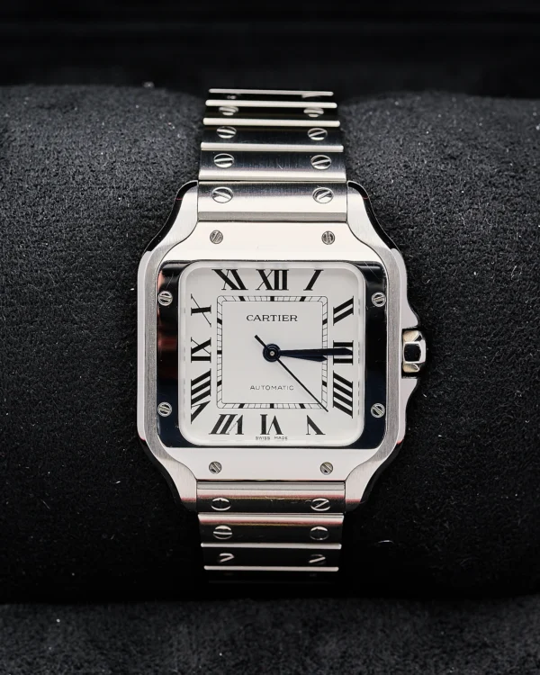 The Stainless steel medium 35mm version of Cartier’s Santos with the sort after white dial.