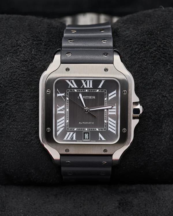 The Stainless steel large version of Cartier’s Santos with the most sought-after black dial.