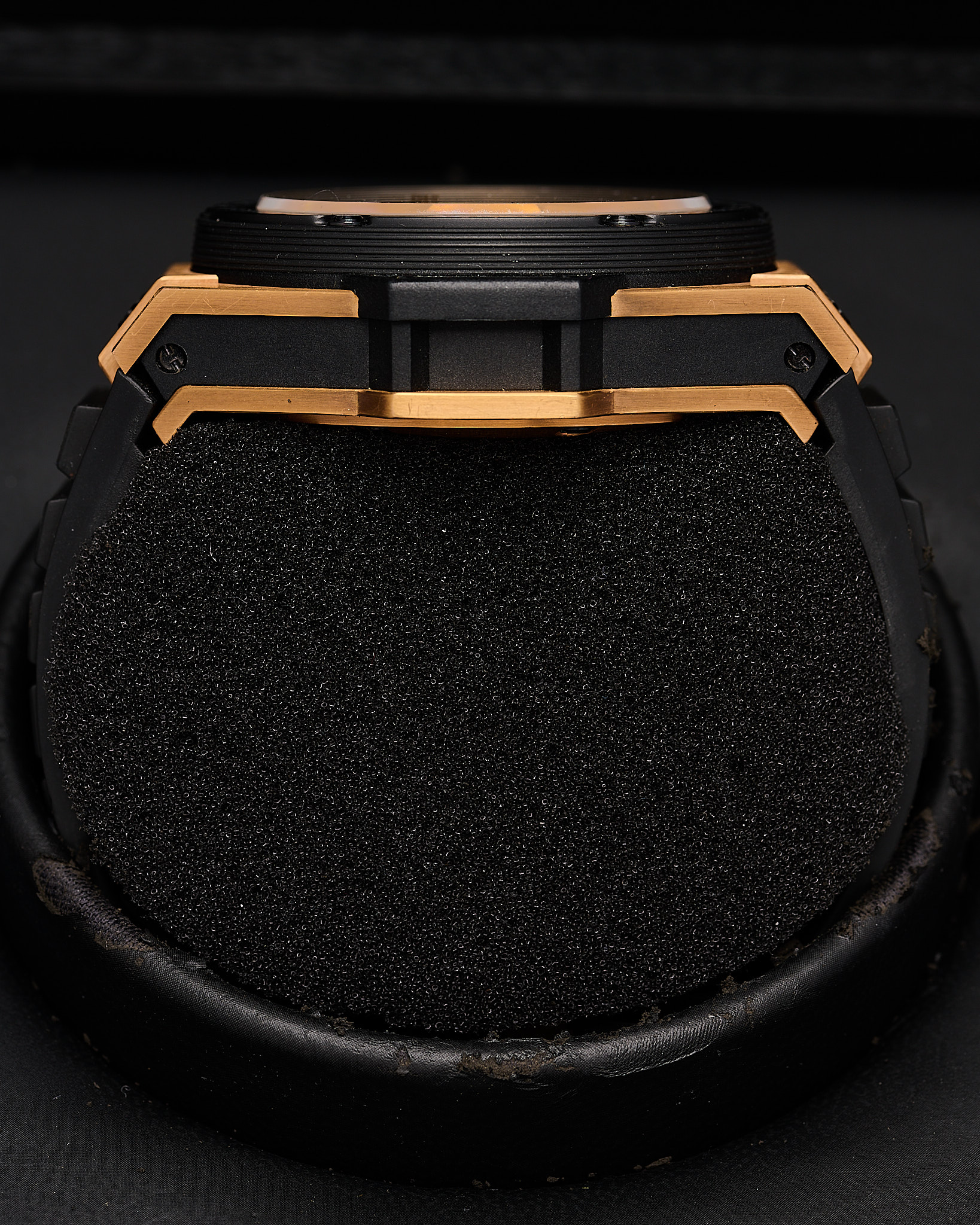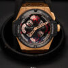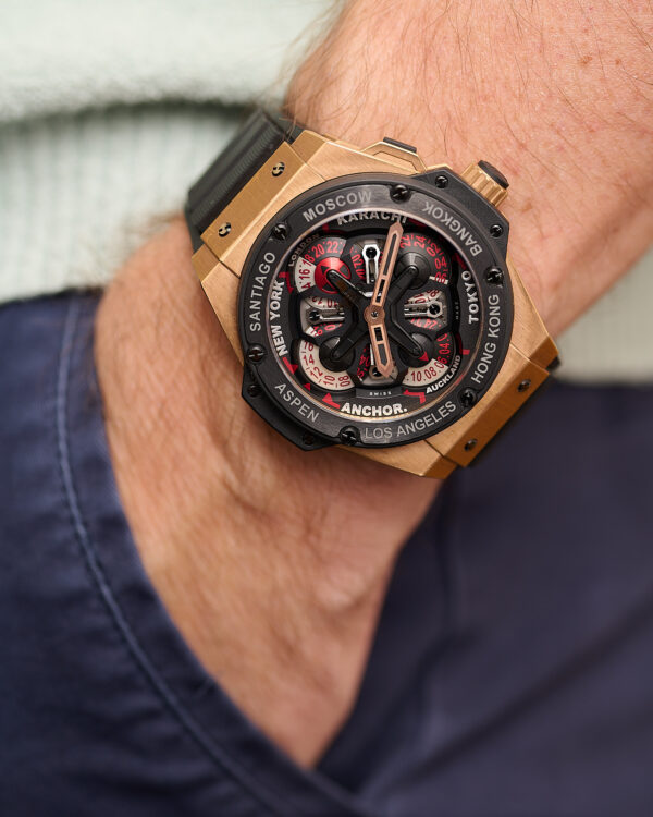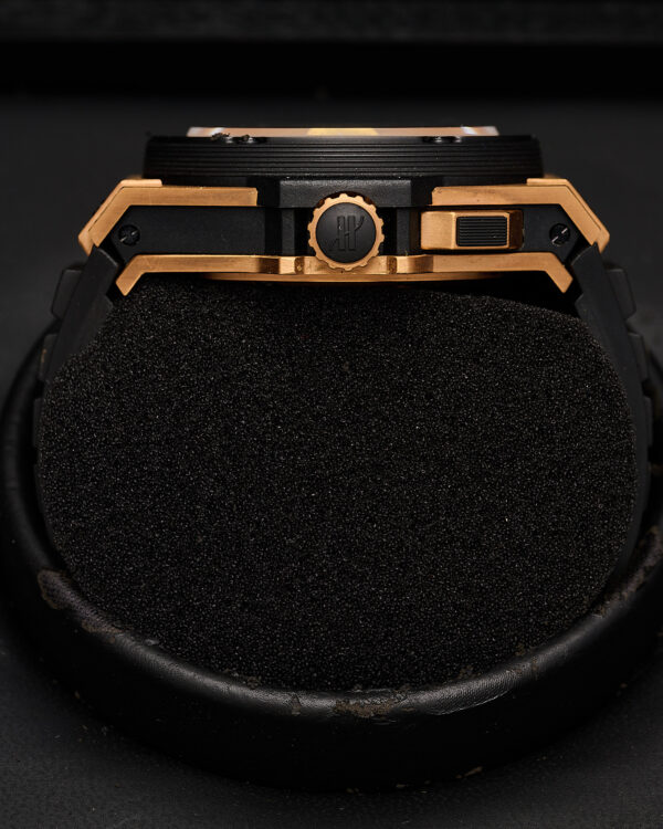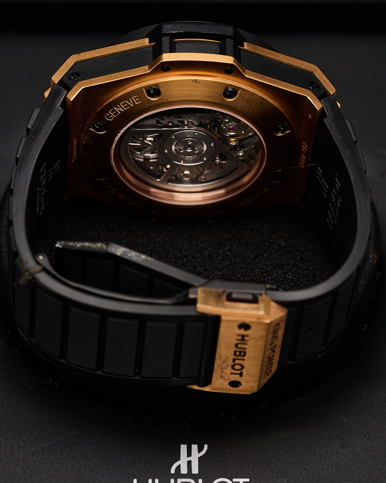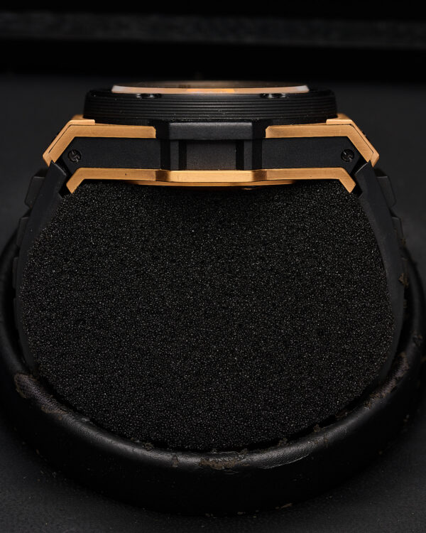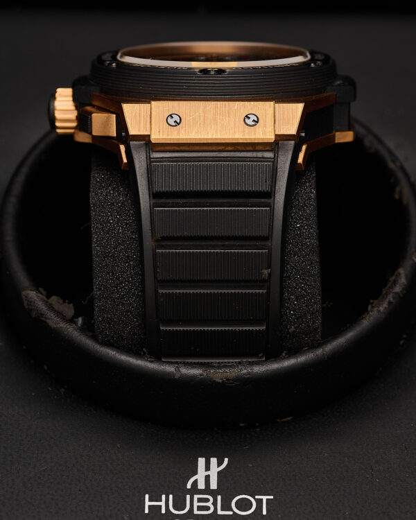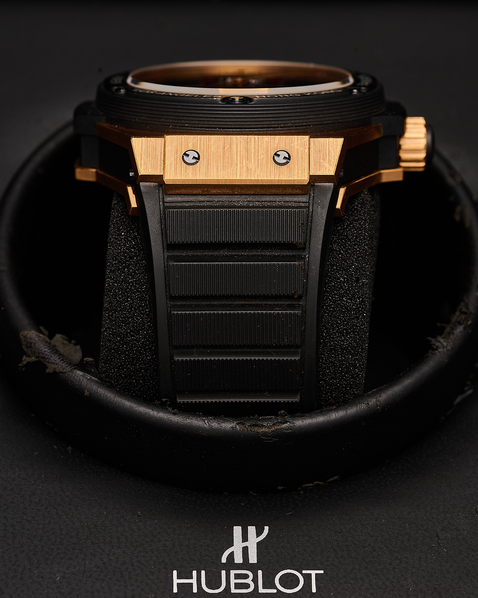 Encased in 18k King Gold, the 48mm case houses the in-house UNICO automatic movement, offering dual time zones with effortless control and mechanical brilliance. The skeleton dial reveals the heartbeat of innovation, while the black rubber strap ensures strength, comfort, and unmistakable Hublot style.