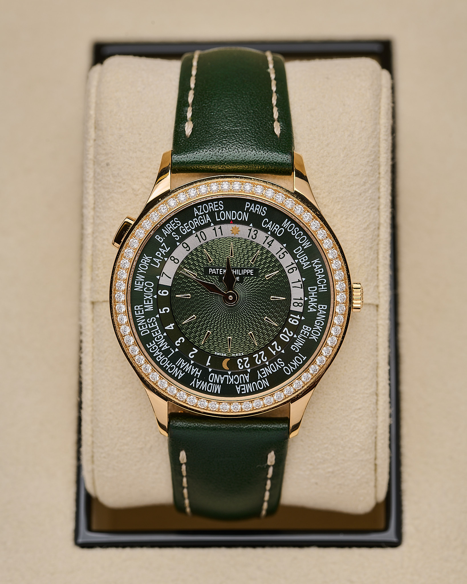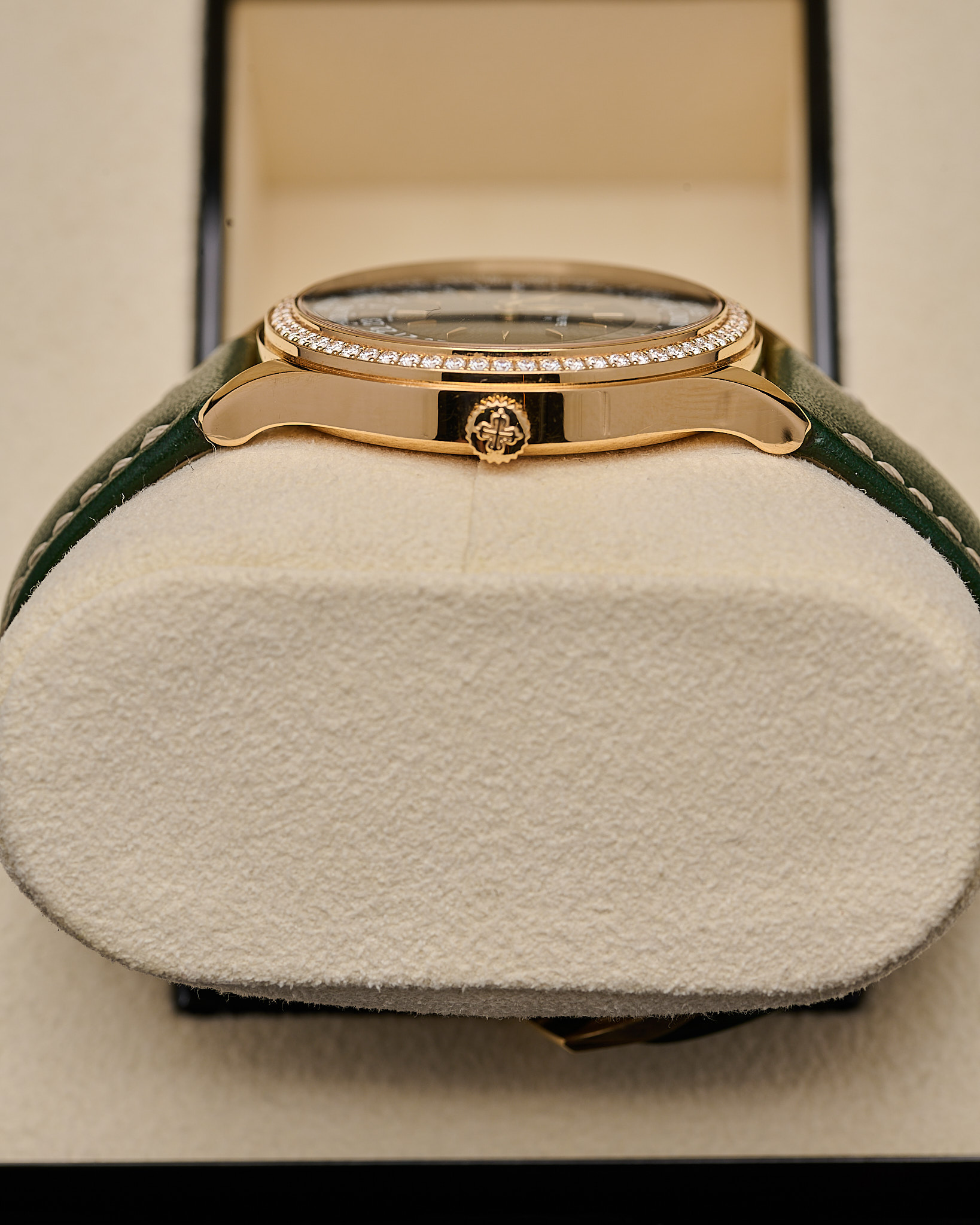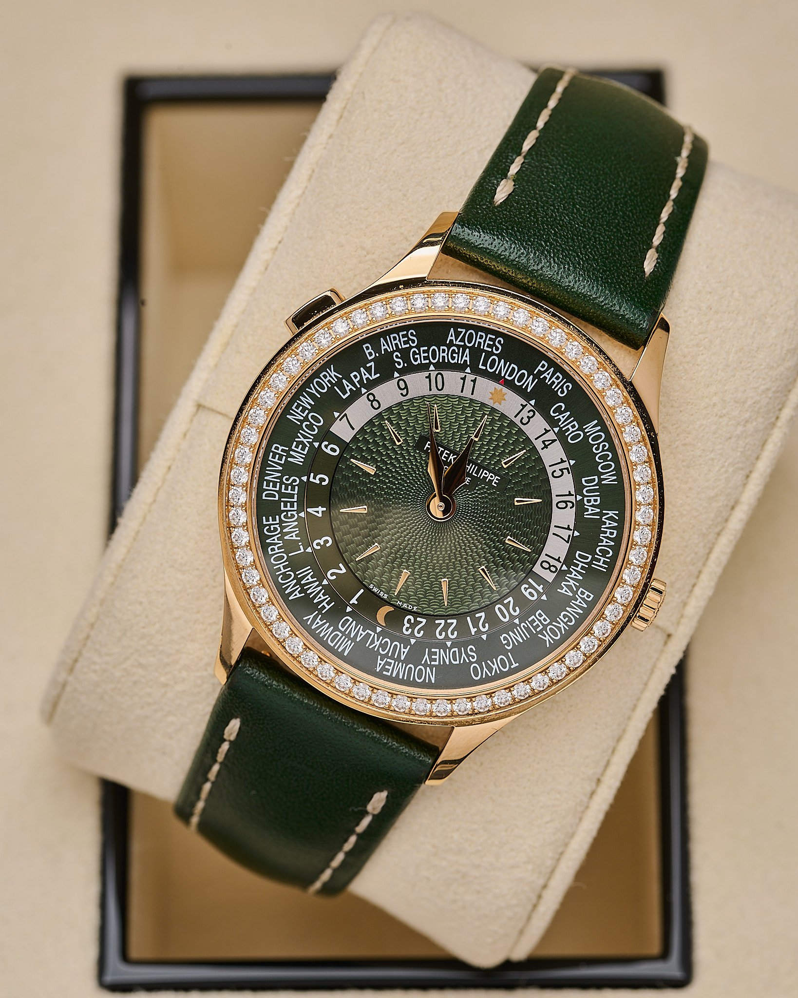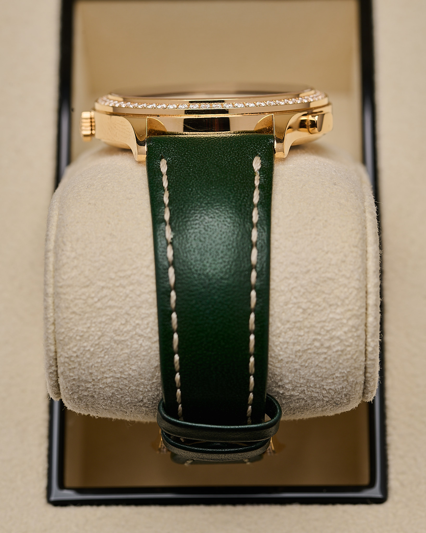The 36mm rose-gold case is complemented by a diamond-set bezel that adds refined brilliance without overwhelming the watch’s balanced design. Powered by Patek Philippe’s ultra-thin automatic Calibre 240 HU, the watch delivers world-time functionality across 24 cities with exceptional mechanical finesse.
