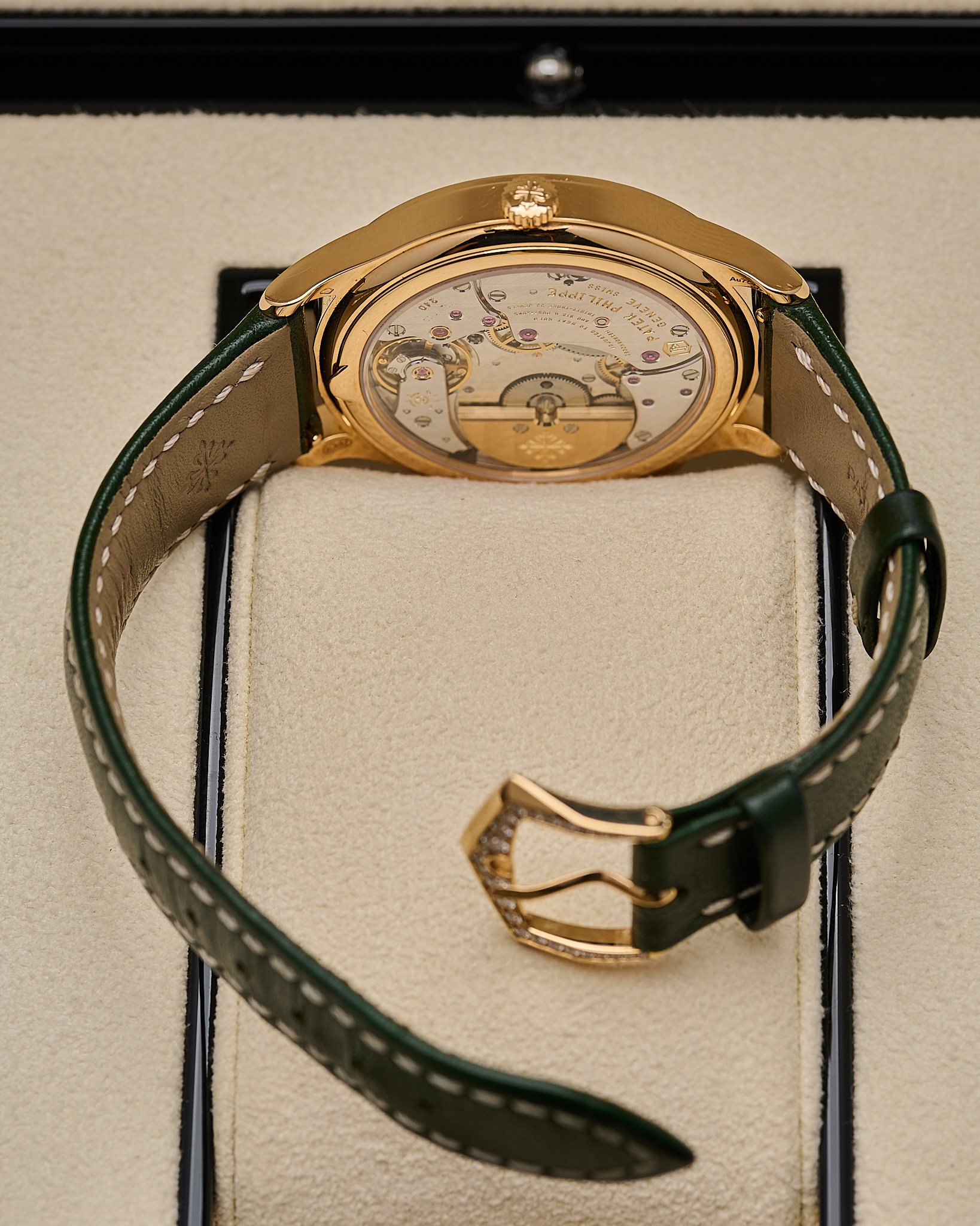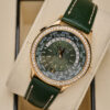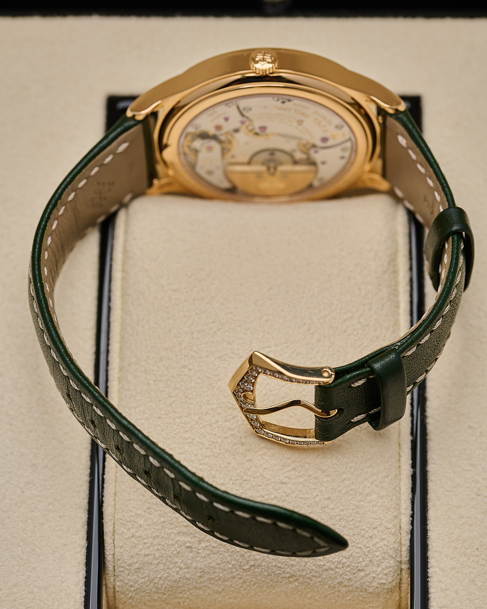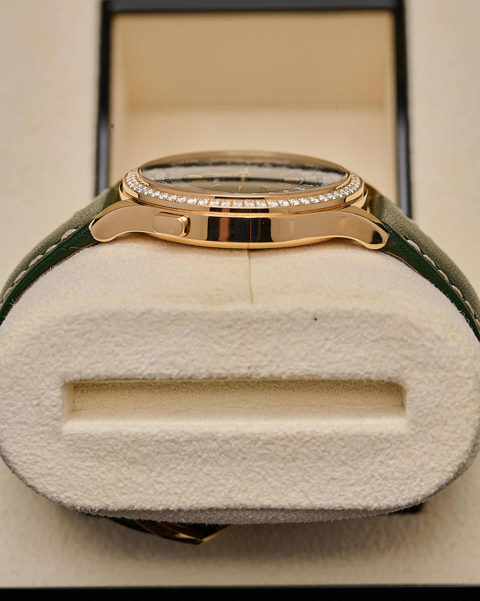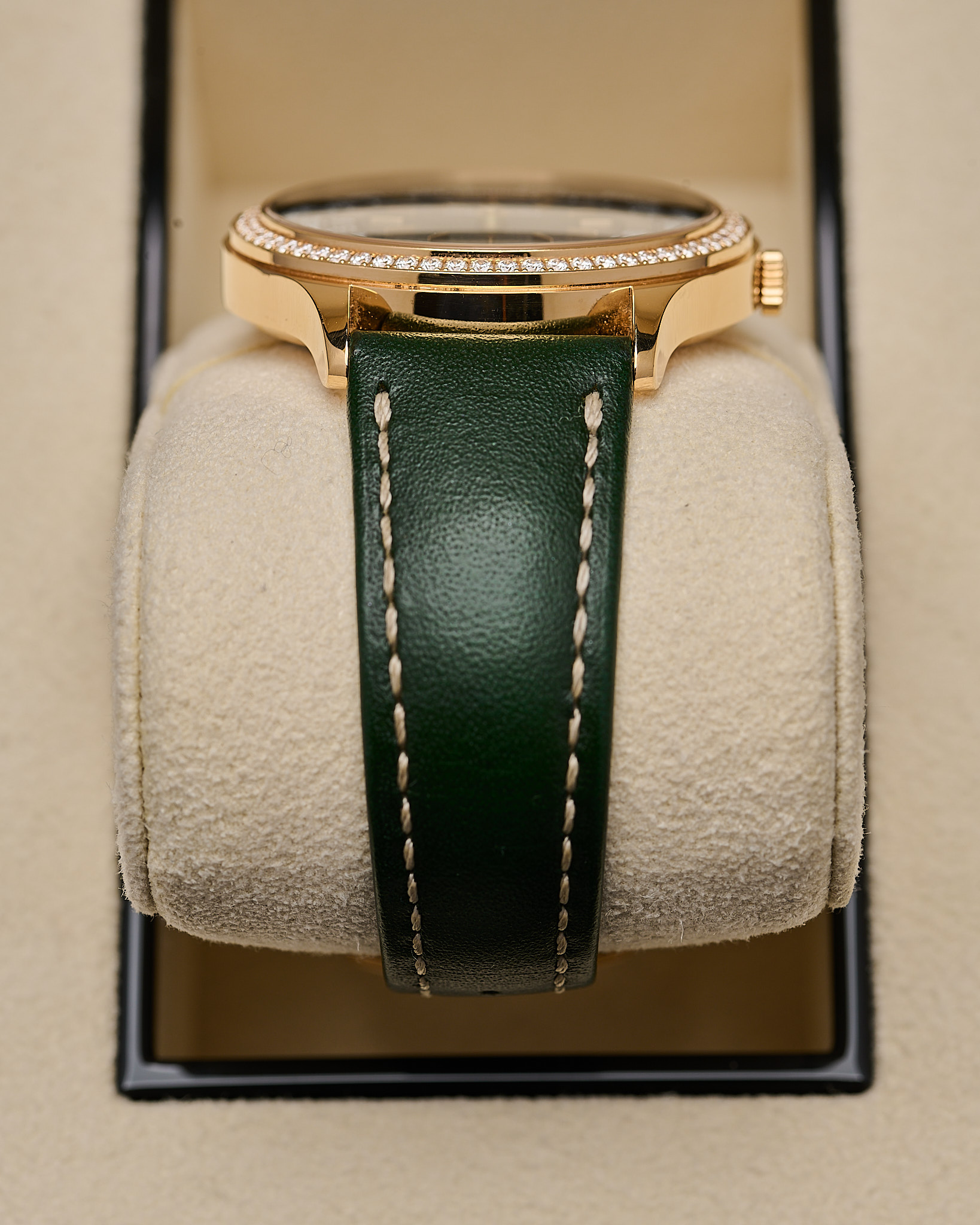The 36mm rose-gold case is complemented by a diamond-set bezel that adds refined brilliance without overwhelming the watch’s balanced design. Powered by Patek Philippe’s ultra-thin automatic Calibre 240 HU, the watch delivers world-time functionality across 24 cities with exceptional mechanical finesse.
