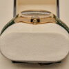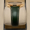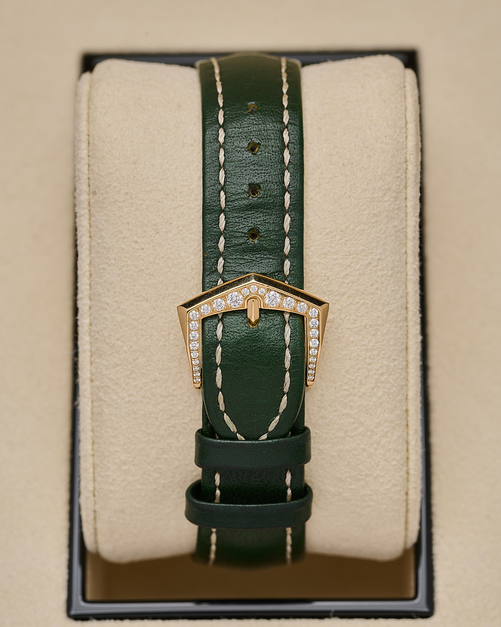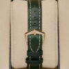 Paired with a matching olive-green leather strap and rose-gold buckle.