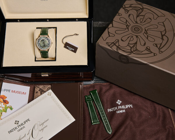 The 7130R-014 showcases a beautifully textured olive-green dial with contrasting world-time city ring, creating a sophisticated and contemporary aesthetic while preserving the timeless Patek World Time identity.