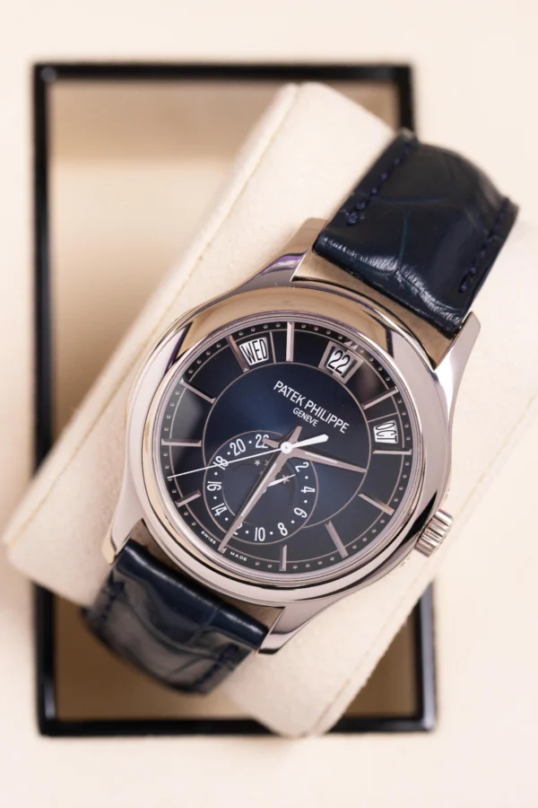 Patek Philippe Annual Calendar 5205G, presented in elegant white gold with the coveted blue sunburst dial.