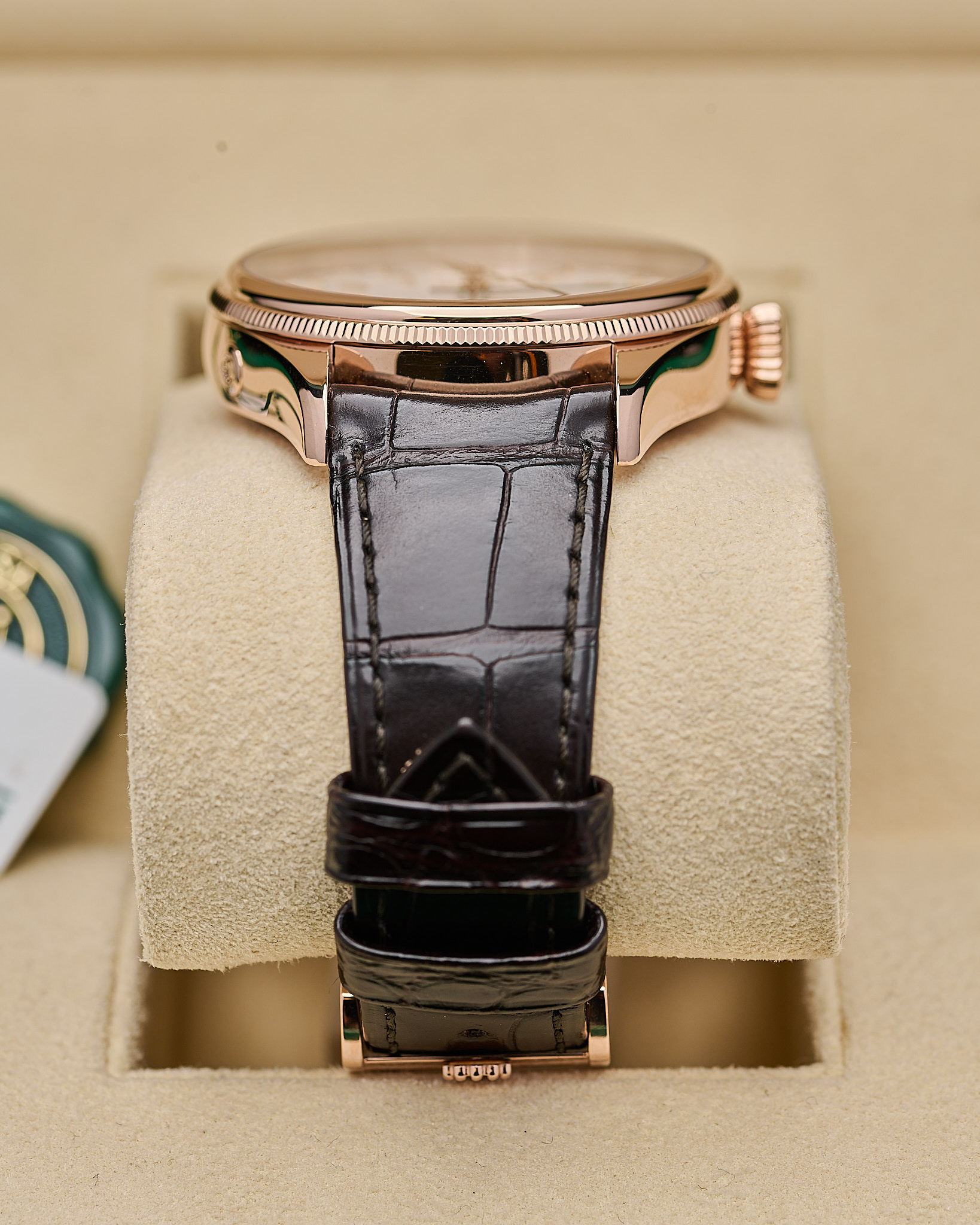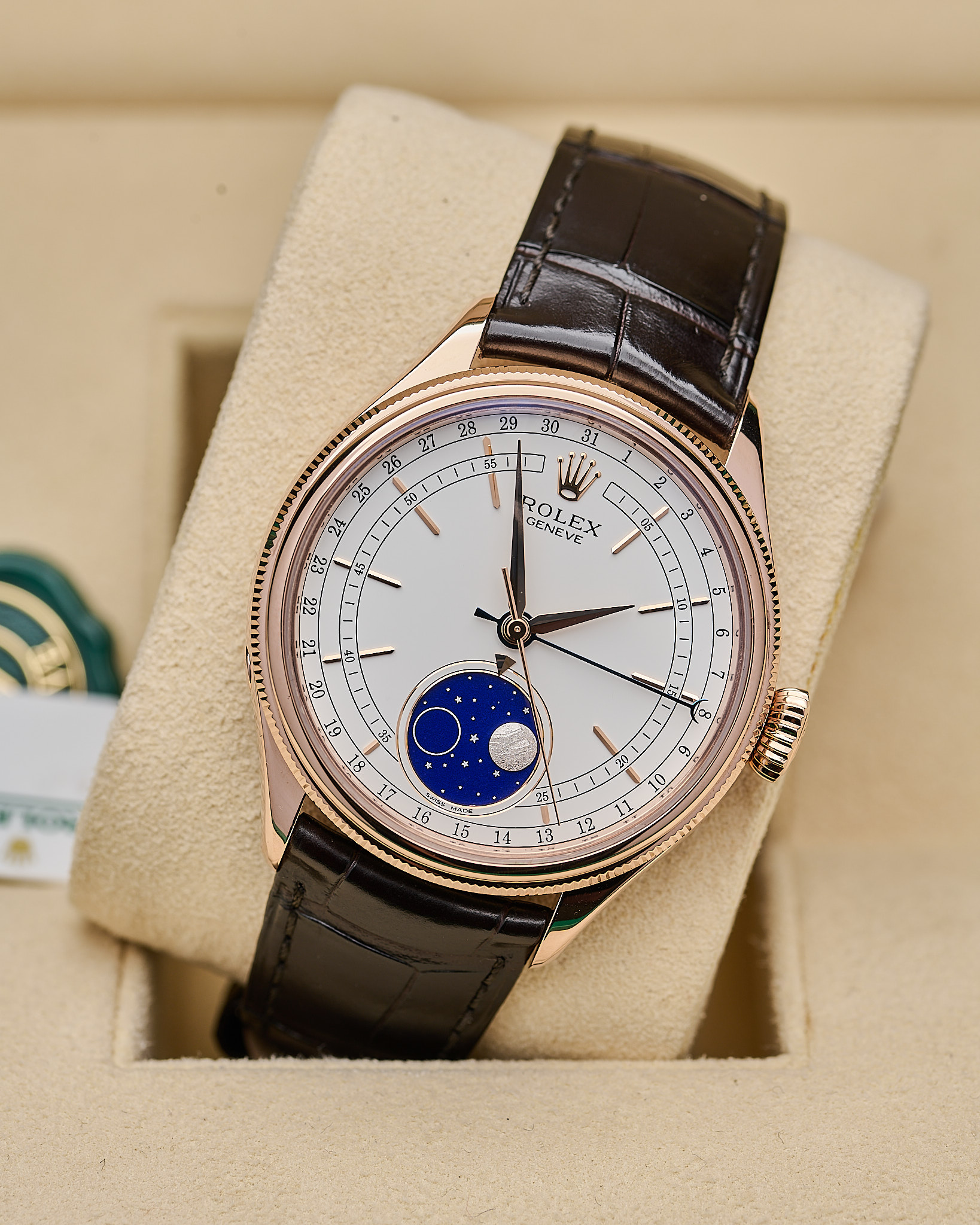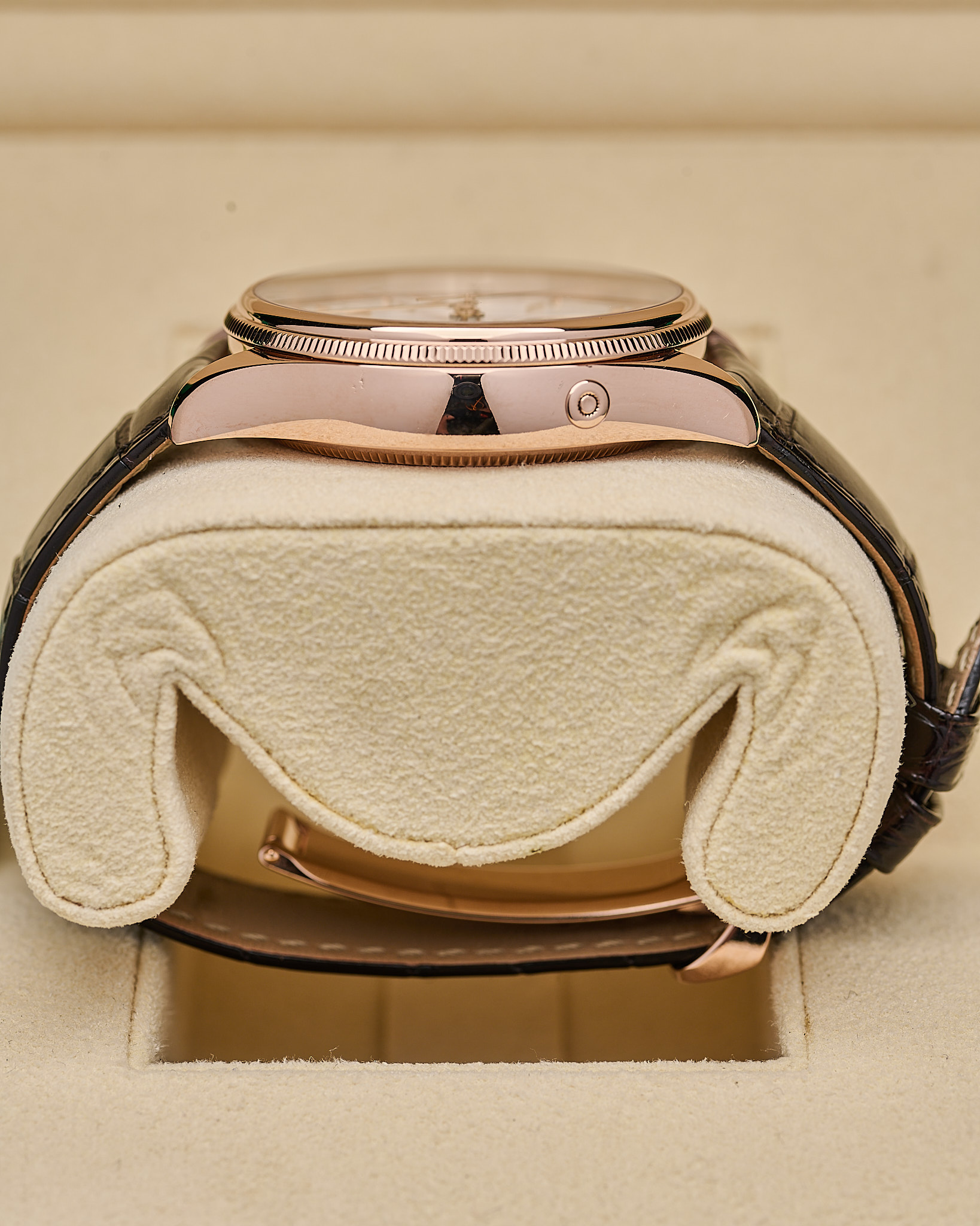 Dial: White lacquer dial with blue enamel moonphase disc and Everose gold meteorite moon