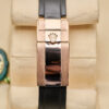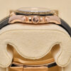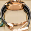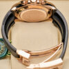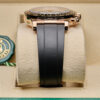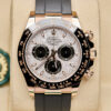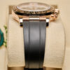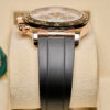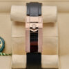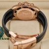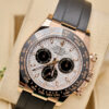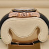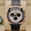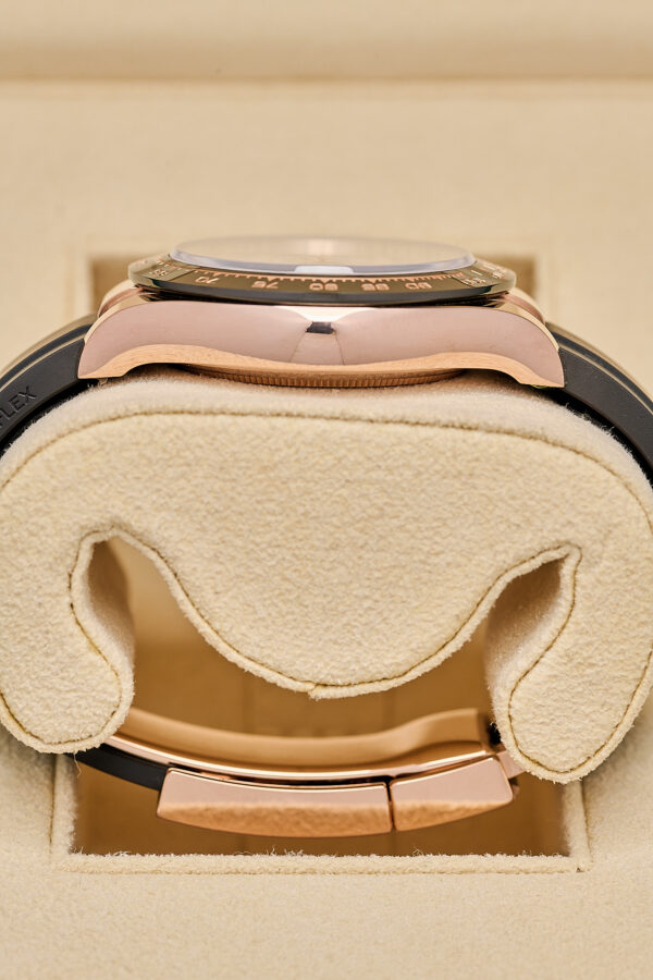 This 2024 Rolex Cosmograph Daytona is crafted from 18ct Everose gold with a 40mm case and black Cerachrom bezel featuring the engraved tachymetric scale. The dial is made from genuine meteorite with contrasting black sub-dials, making each piece visually unique. Powered by the updated calibre 4131 automatic chronograph movement and fitted to an Oysterflex rubber strap with Everose Oysterlock clasp.