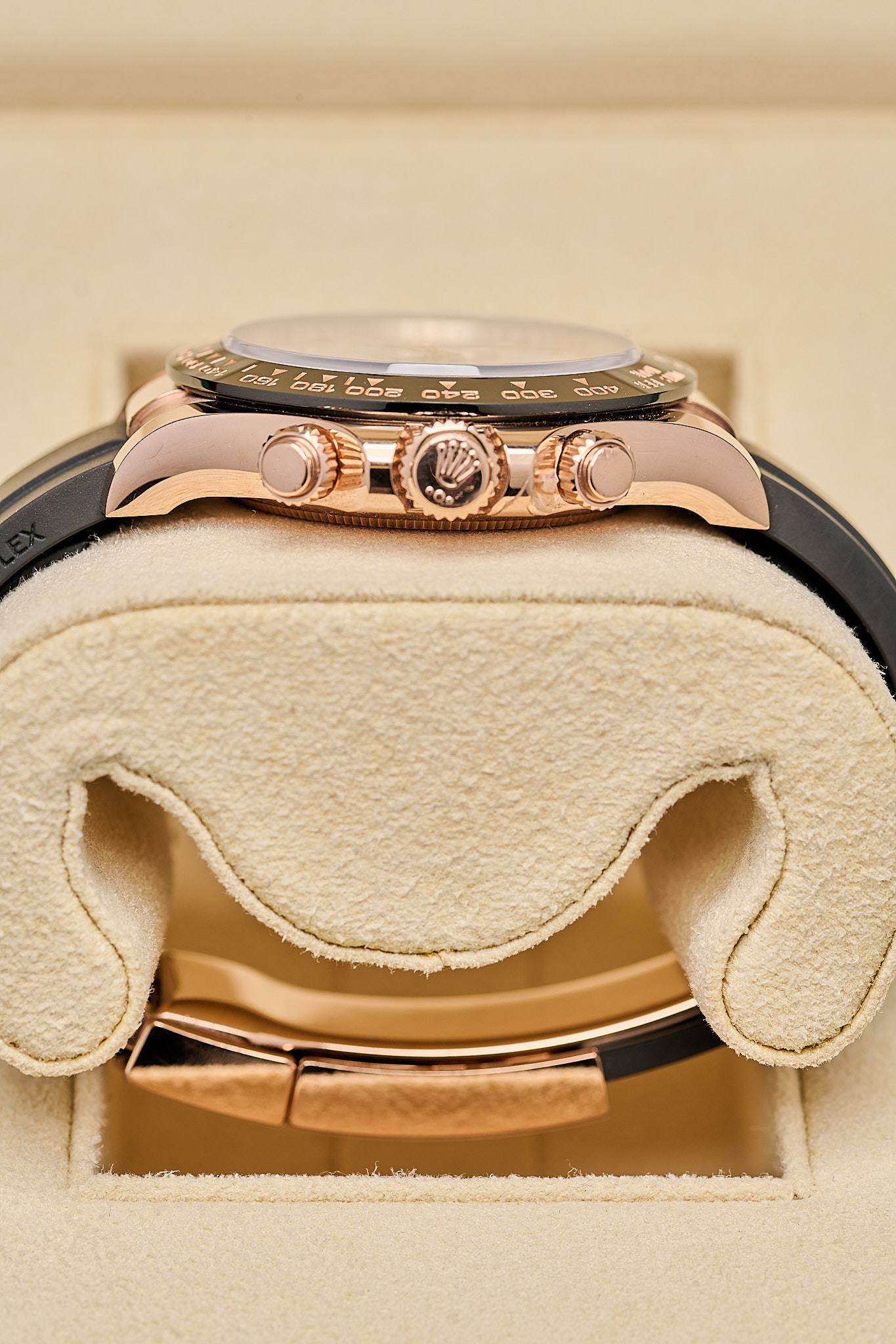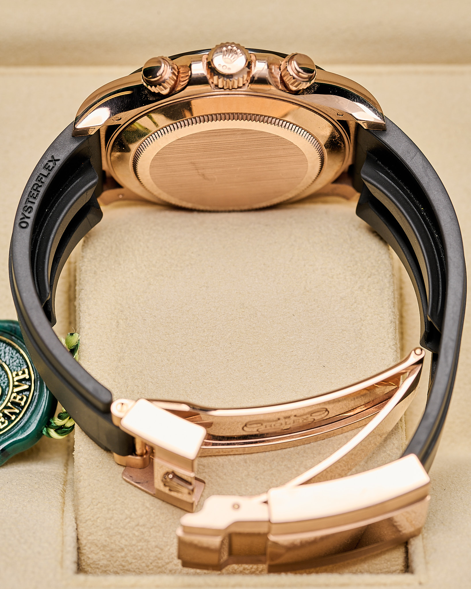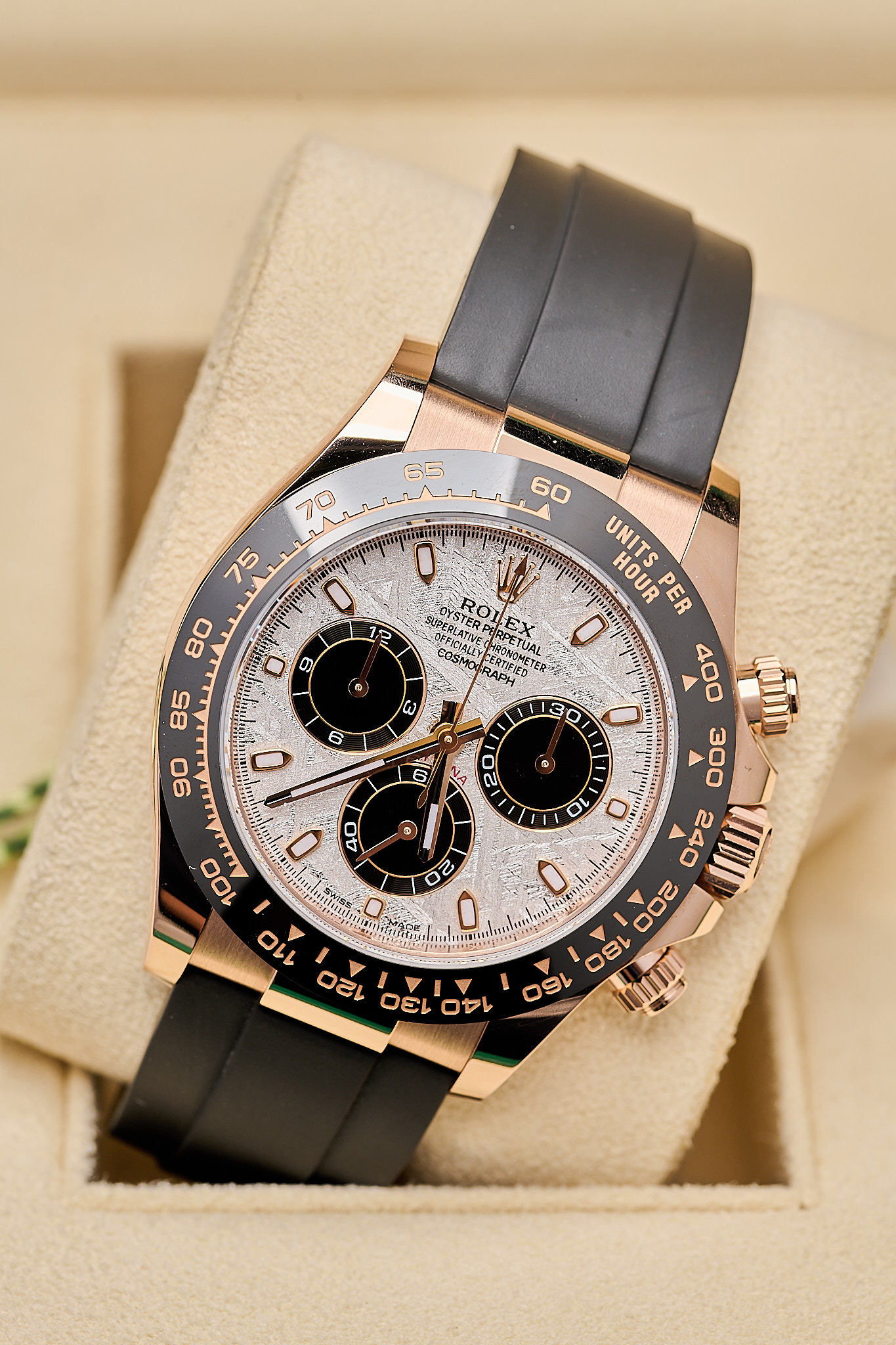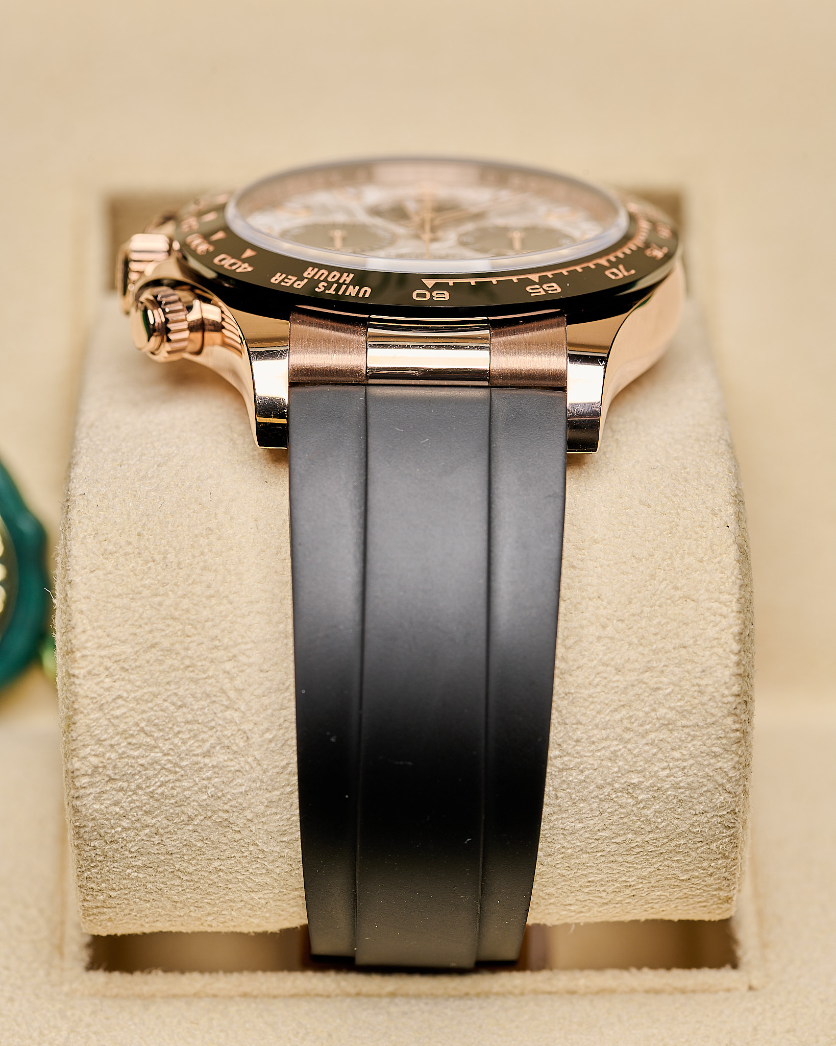 This 2024 Rolex Cosmograph Daytona is crafted from 18ct Everose gold with a 40mm case and black Cerachrom bezel featuring the engraved tachymetric scale. The dial is made from genuine meteorite with contrasting black sub-dials, making each piece visually unique. Powered by the updated calibre 4131 automatic chronograph movement and fitted to an Oysterflex rubber strap with Everose Oysterlock clasp.