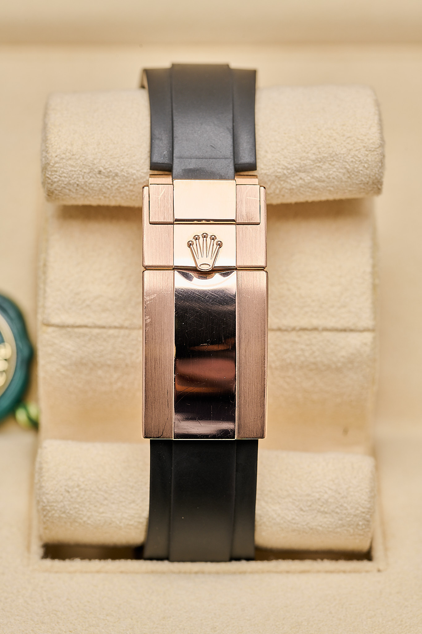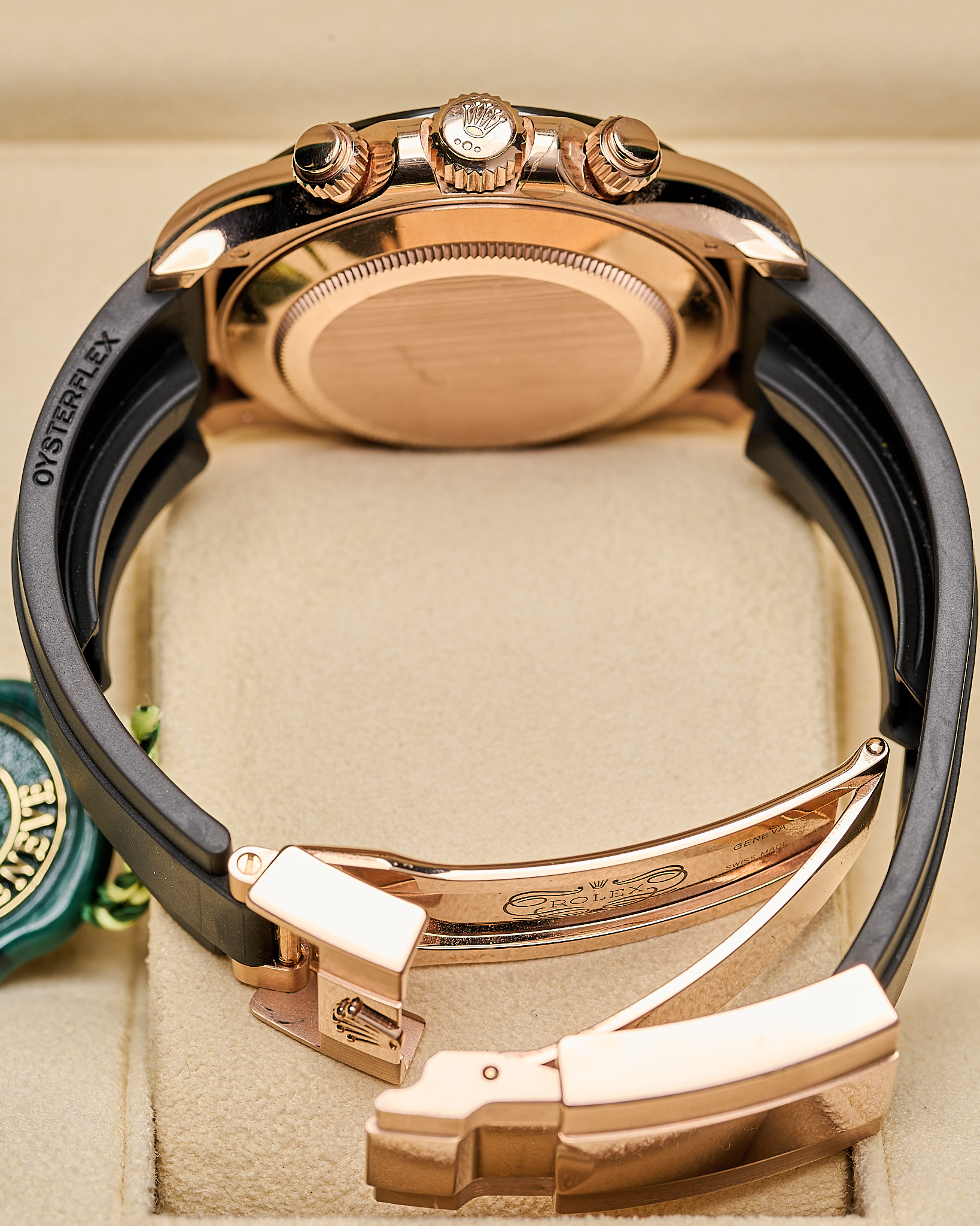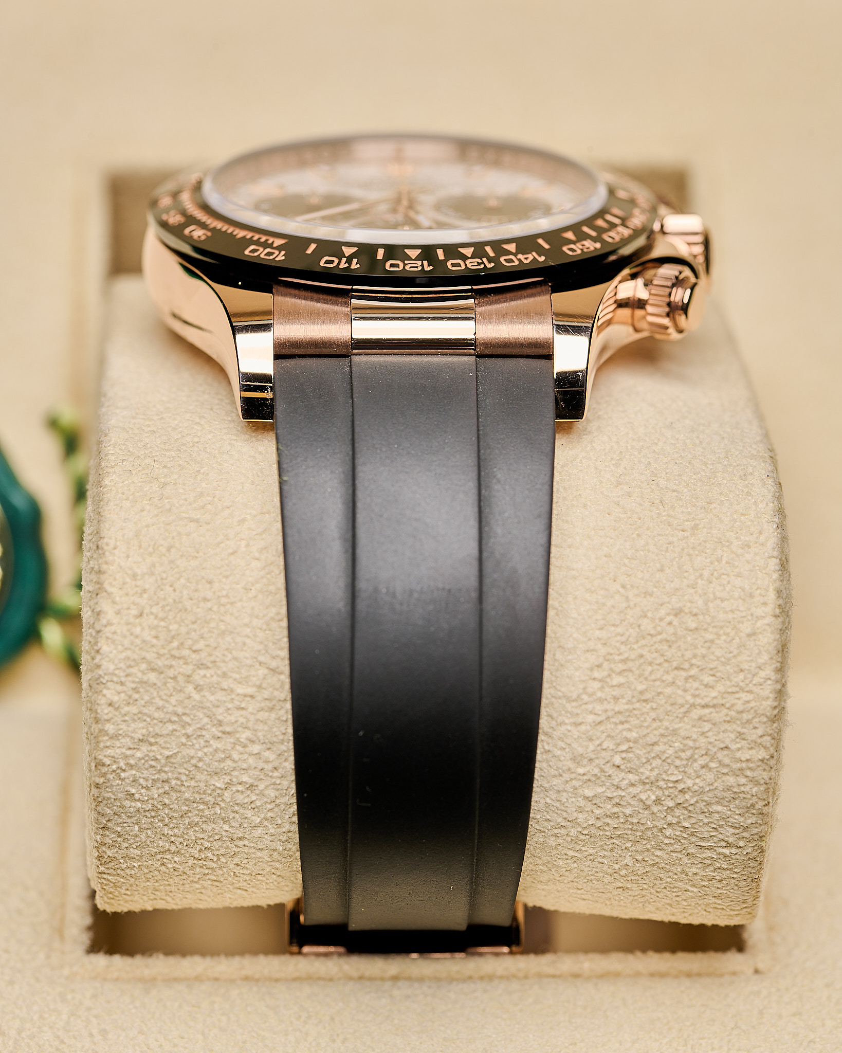 This 2024 Rolex Cosmograph Daytona is crafted from 18ct Everose gold with a 40mm case and black Cerachrom bezel featuring the engraved tachymetric scale. The dial is made from genuine meteorite with contrasting black sub-dials, making each piece visually unique. Powered by the updated calibre 4131 automatic chronograph movement and fitted to an Oysterflex rubber strap with Everose Oysterlock clasp.