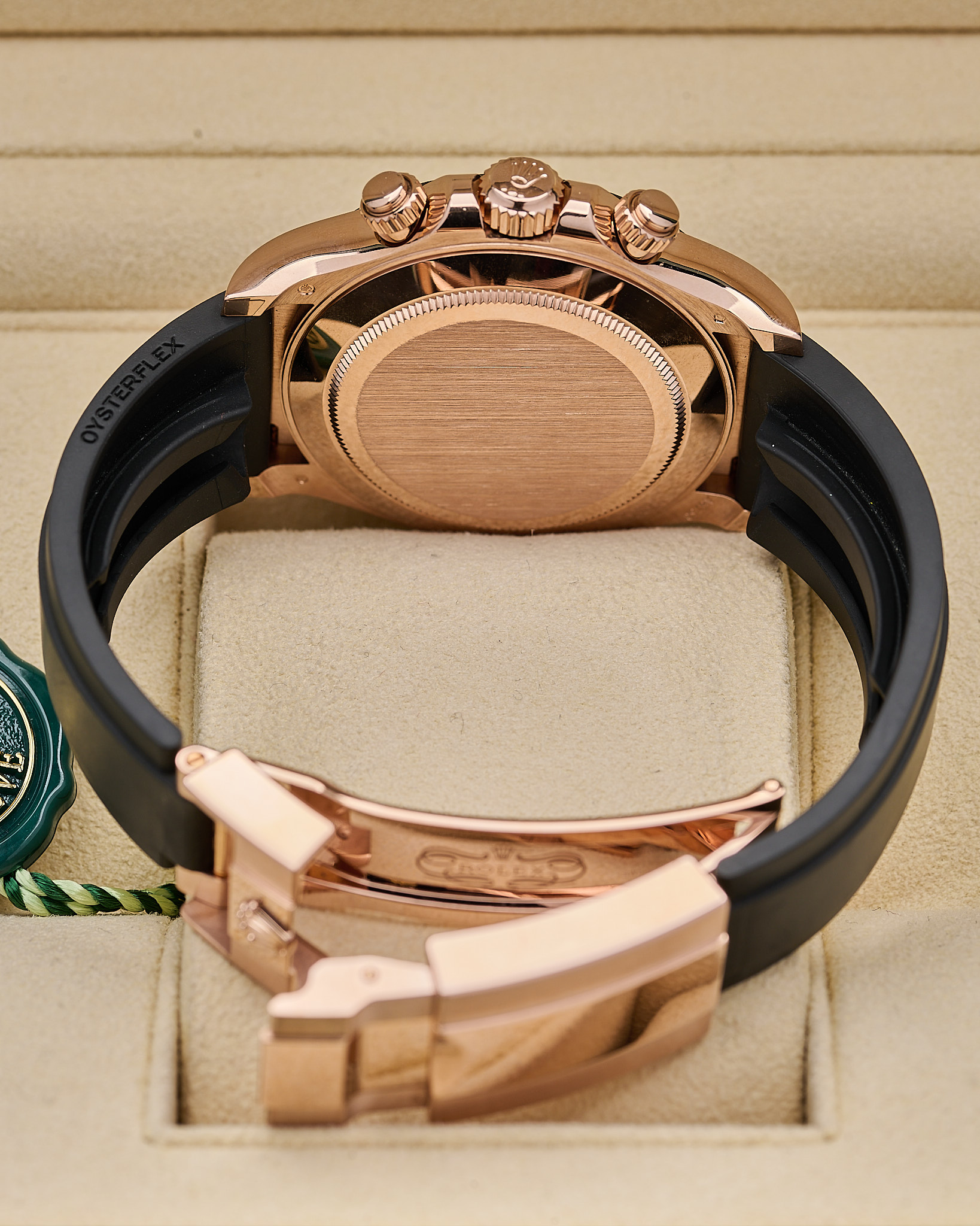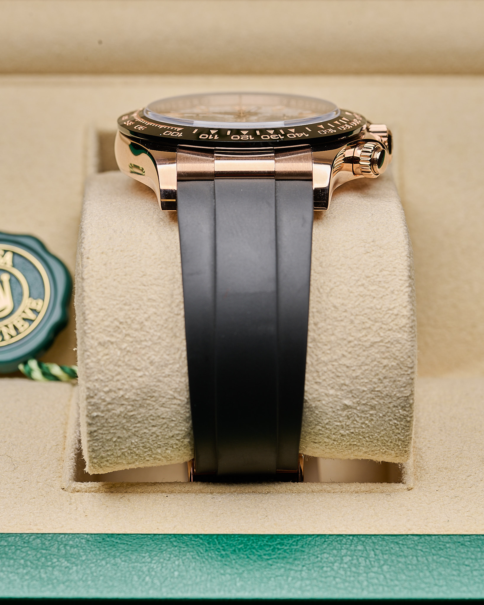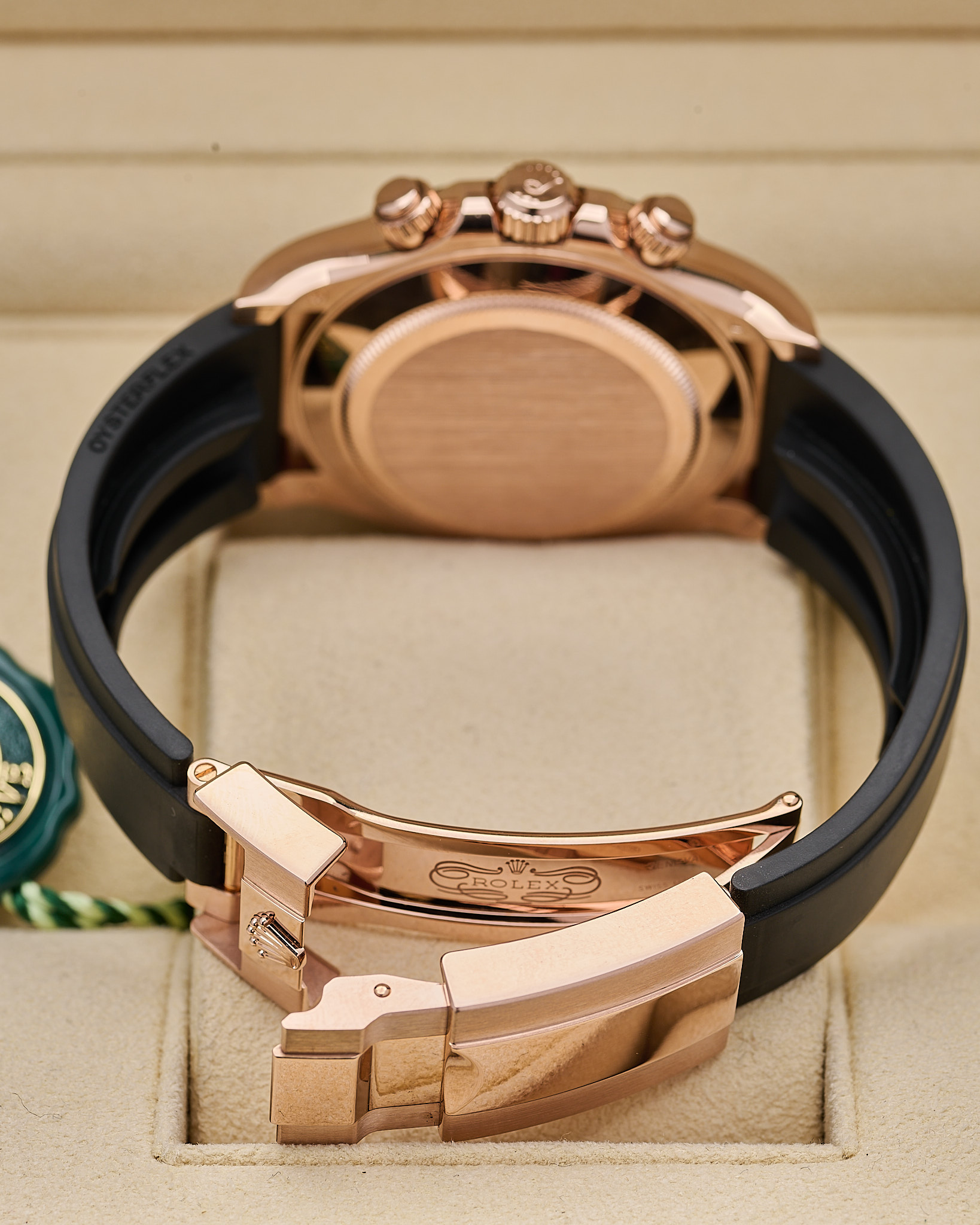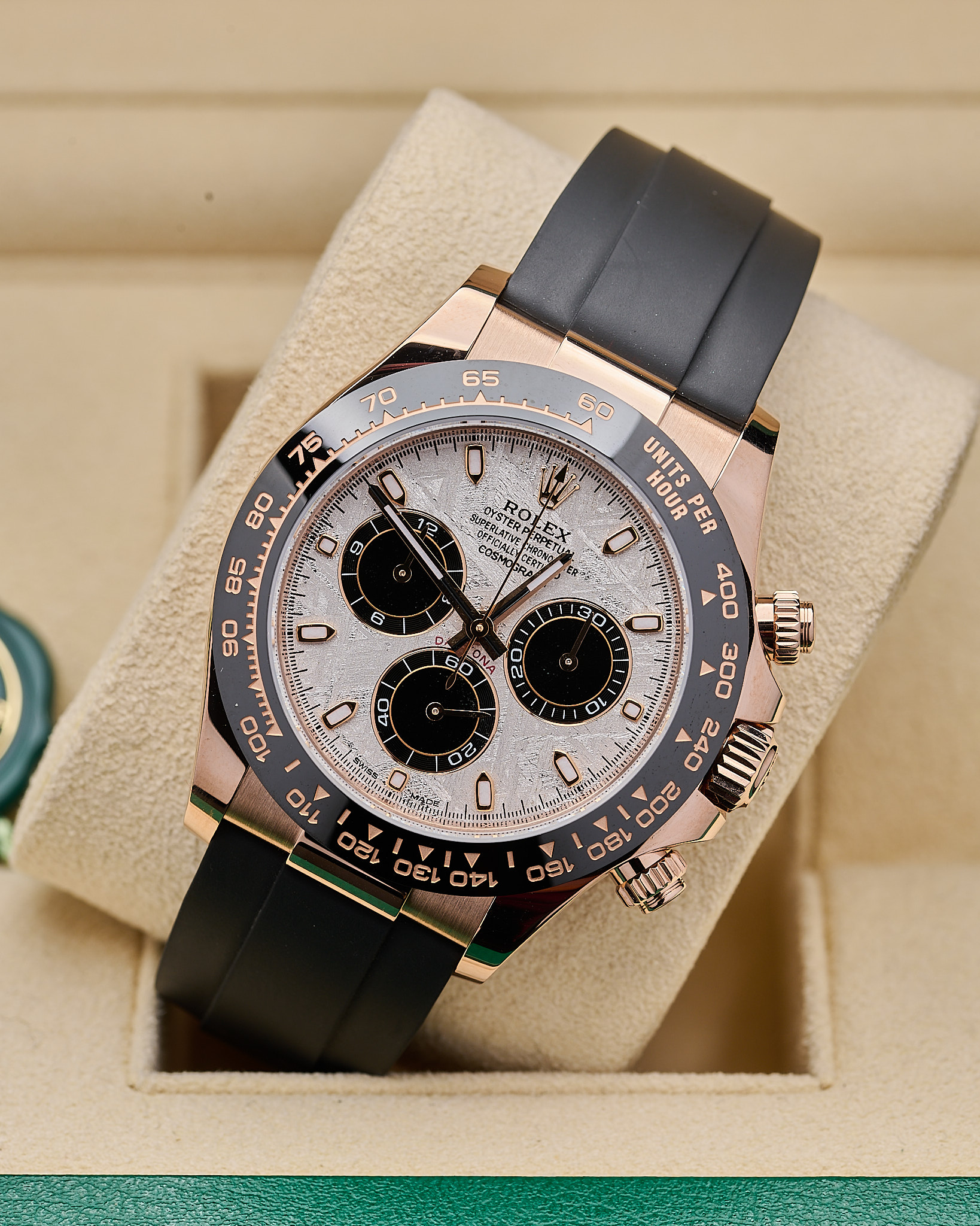 This 2024 Rolex Cosmograph Daytona is crafted from 18ct Everose gold with a 40mm case and black Cerachrom bezel featuring the engraved tachymetric scale. The dial is made from genuine meteorite with contrasting black sub-dials, making each piece visually unique. Powered by the updated calibre 4131 automatic chronograph movement and fitted to an Oysterflex rubber strap with Everose Oysterlock clasp.