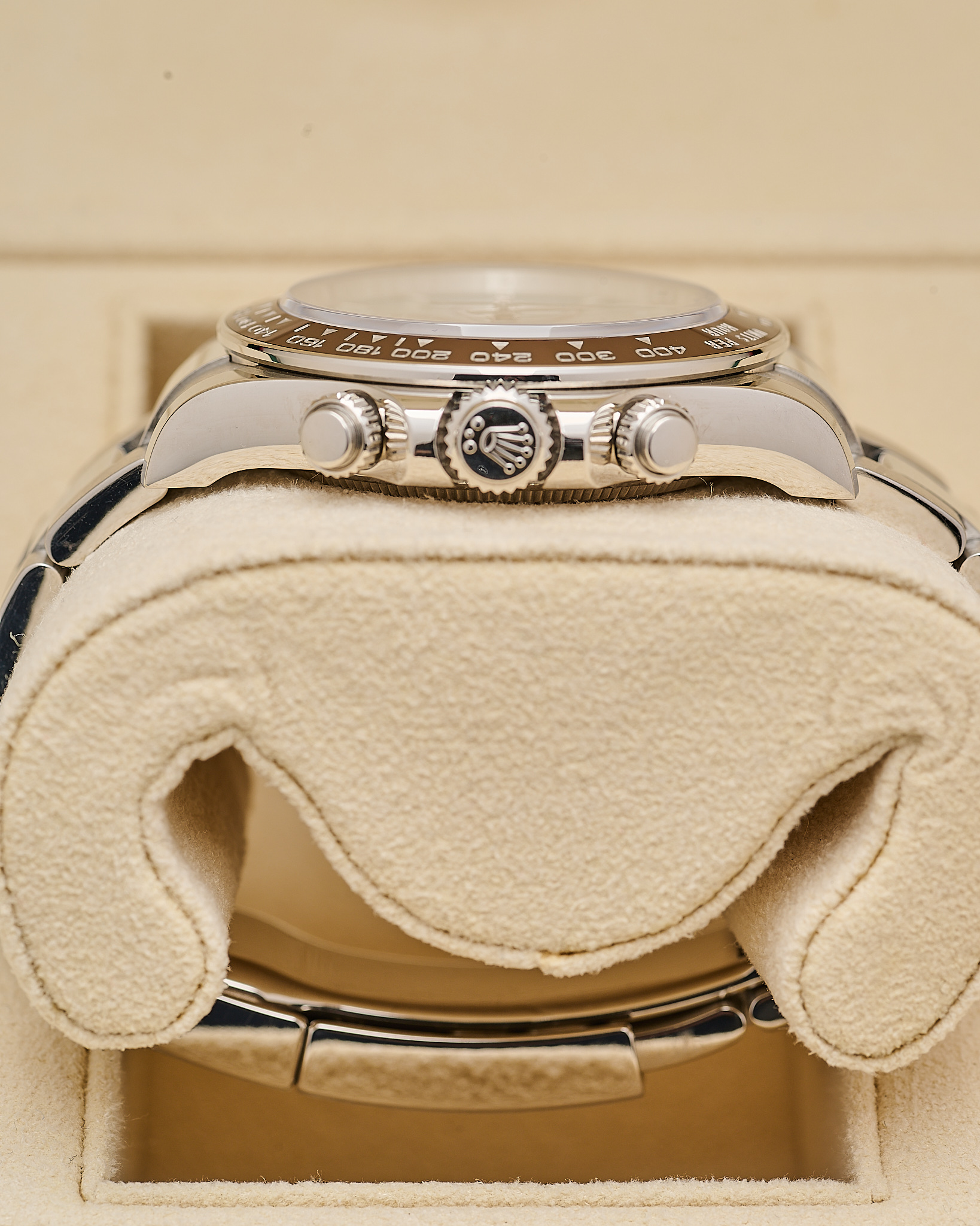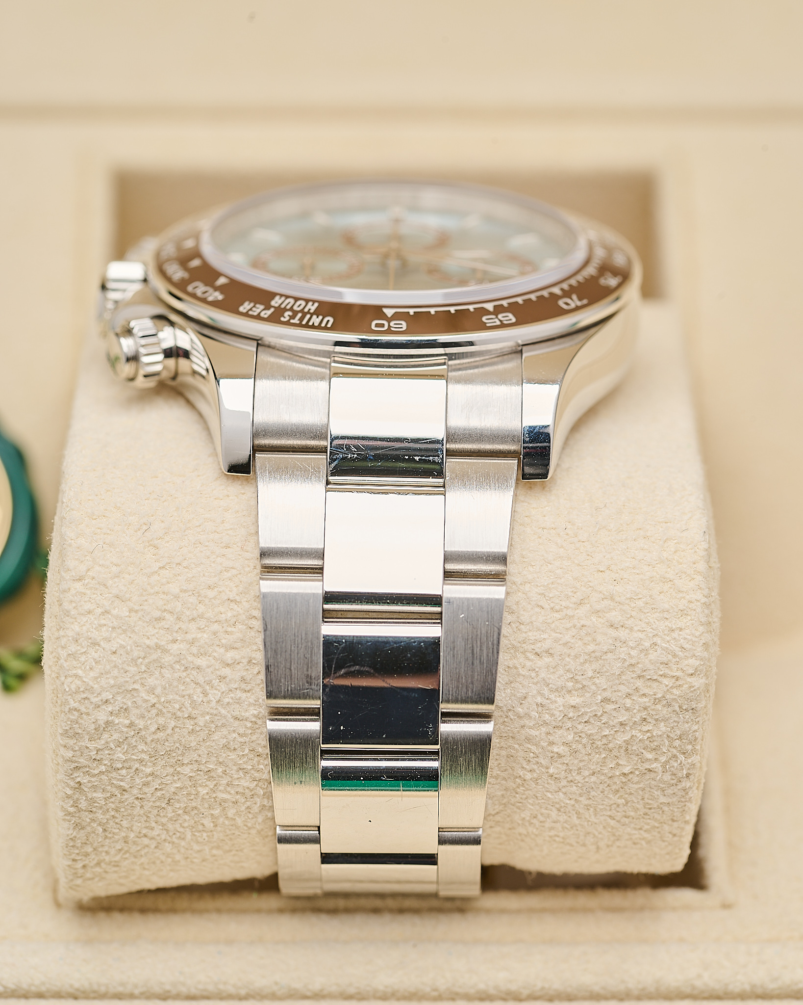 The Rolex 126506 is a platinum version of the Cosmograph Daytona, introduced in 2023 to mark the 60th anniversary of the Daytona collection. It features a 40mm case in 950 platinum, an ice blue sunburst dial, and a chestnut brown Cerachrom ceramic bezel with a tachymetric scale. Fitted on a platinum Oyster bracelet with Oysterlock safety clasp and Easylink extension.