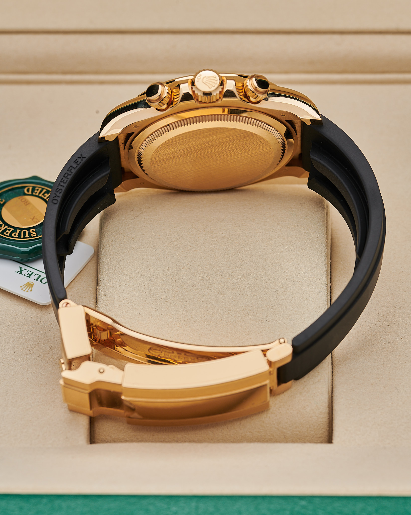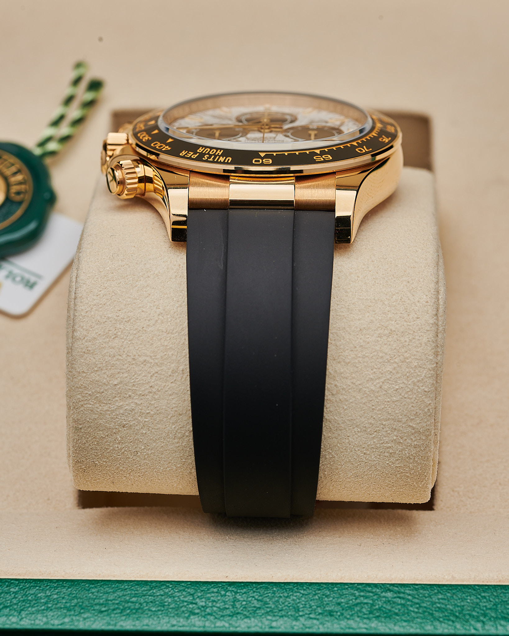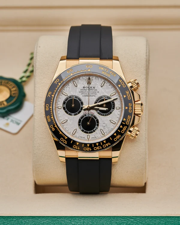 This Rolex 126518LN is a 40mm yellow gold Cosmograph Daytona, fitted with a black Cerachrom bezel engraved with a tachymetric scale. Its rare meteorite dial with contrasting black sub-dials gives each piece a unique natural pattern. The watch is paired with Rolex’s durable Oysterflex bracelet with an 18k yellow gold Oysterclasp, blending sportiness with luxury.