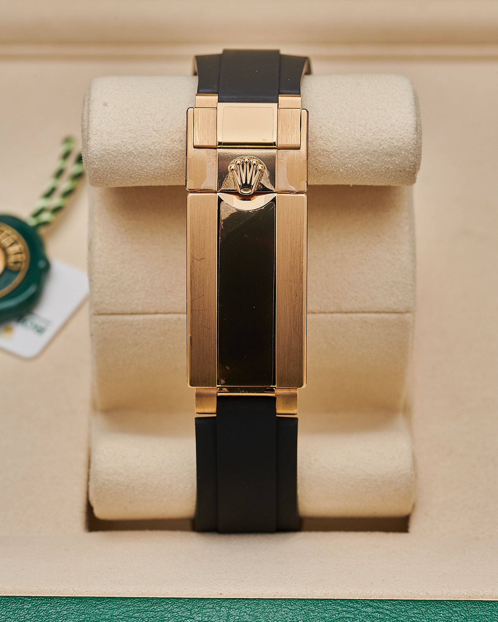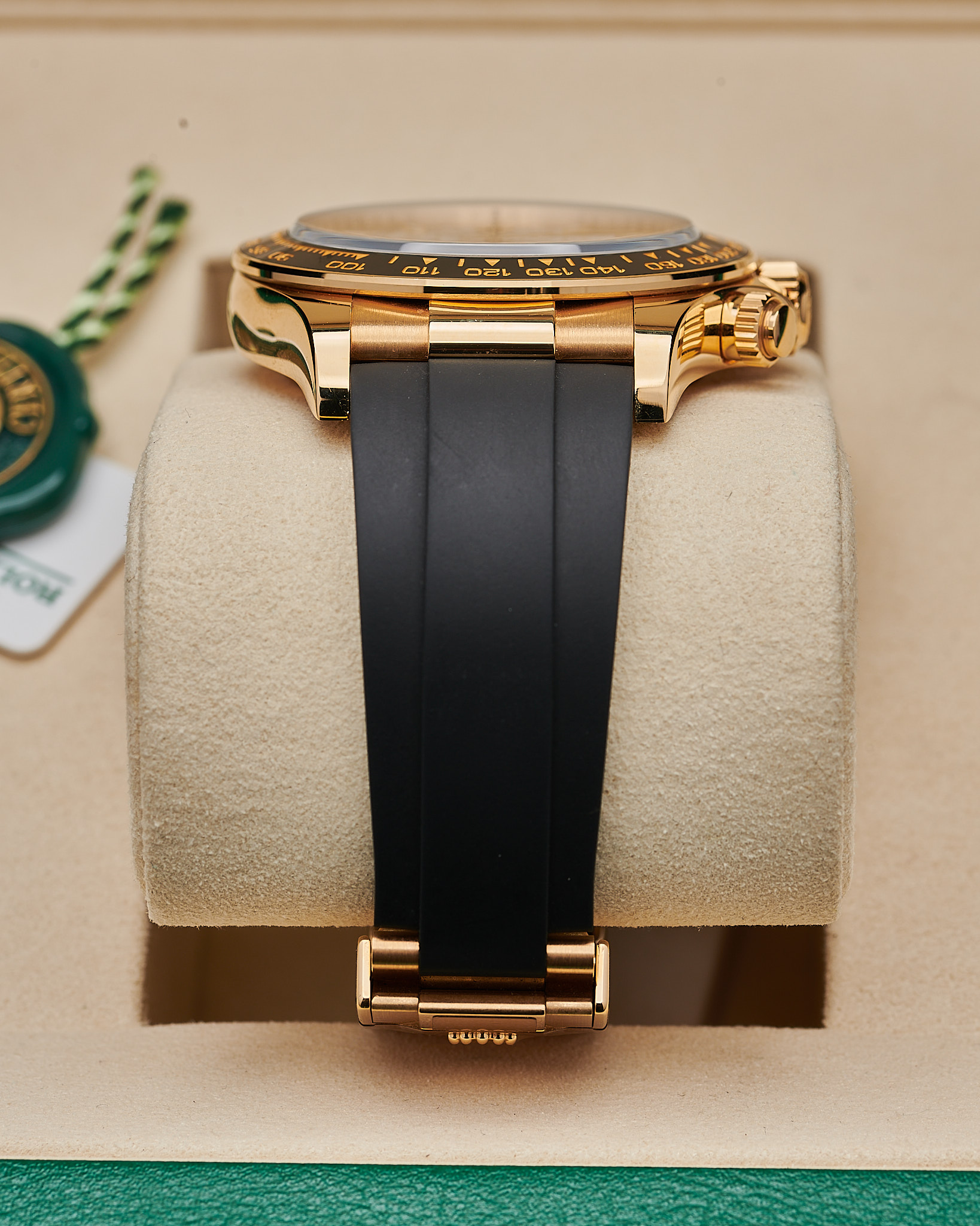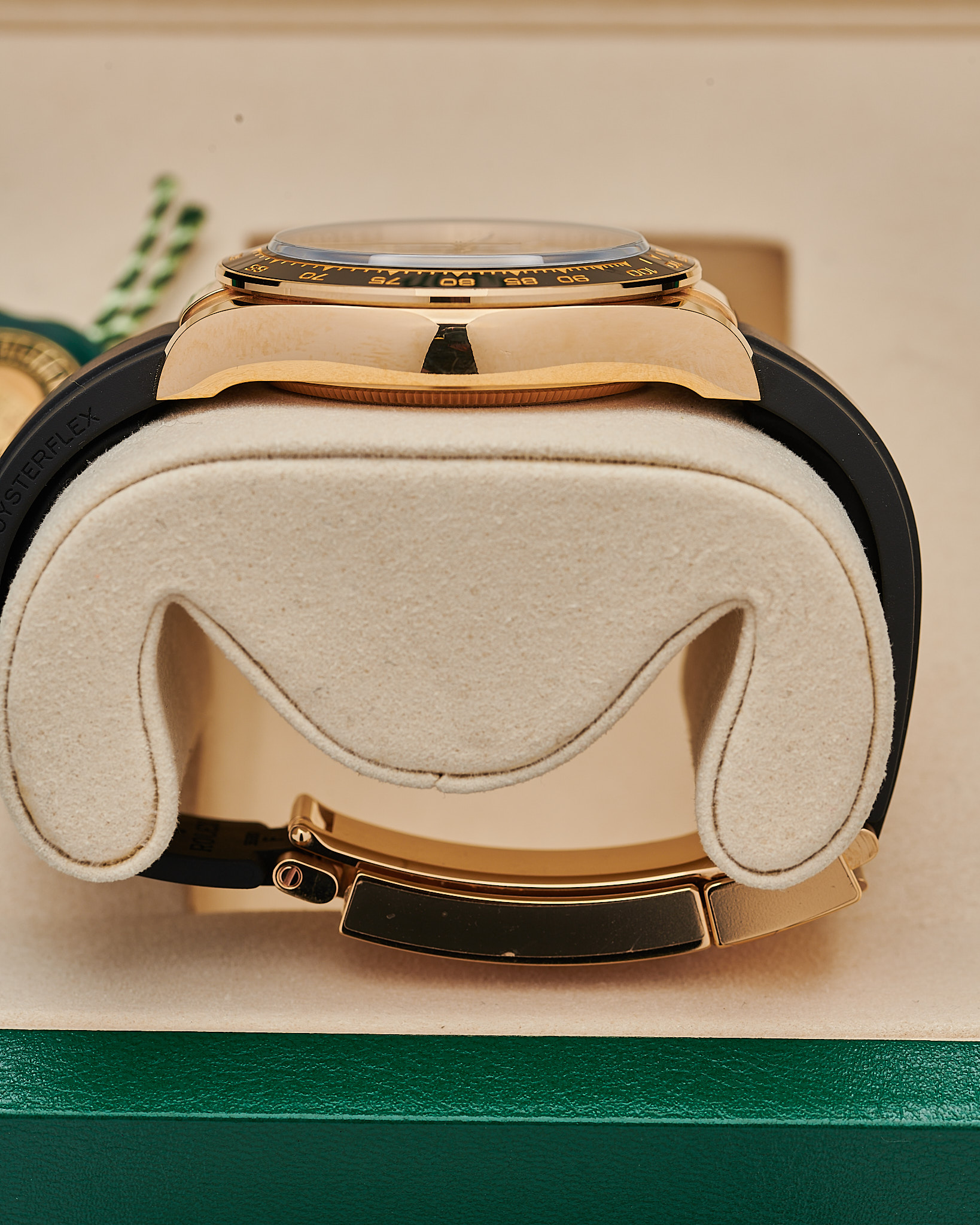 This Rolex 126518LN is a 40mm yellow gold Cosmograph Daytona, fitted with a black Cerachrom bezel engraved with a tachymetric scale. Its rare meteorite dial with contrasting black sub-dials gives each piece a unique natural pattern. The watch is paired with Rolex’s durable Oysterflex bracelet with an 18k yellow gold Oysterclasp, blending sportiness with luxury.