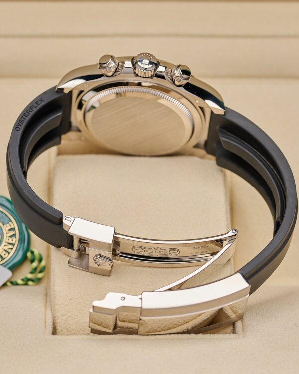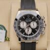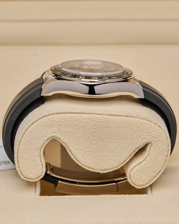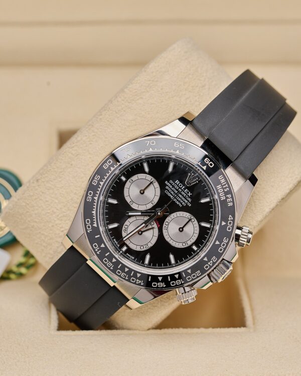 This 2024 Daytona is crafted from 18k white gold and features a sleek black Cerachrom bezel with black oyster flex two-piece strap. Commonly known as the ‘Baby Le Mans’.