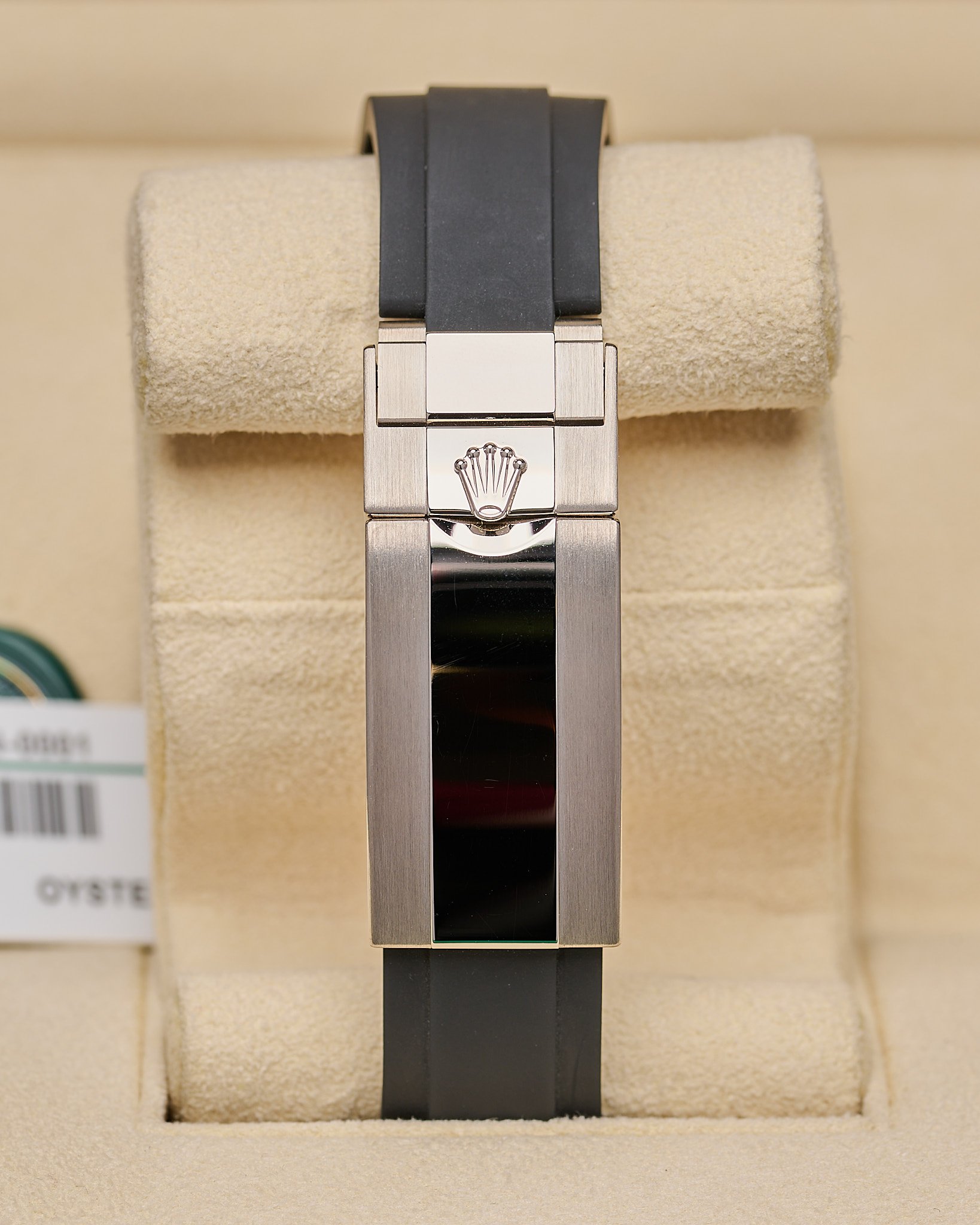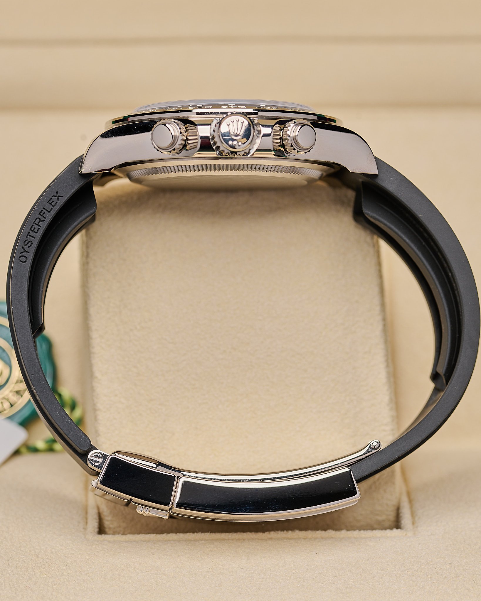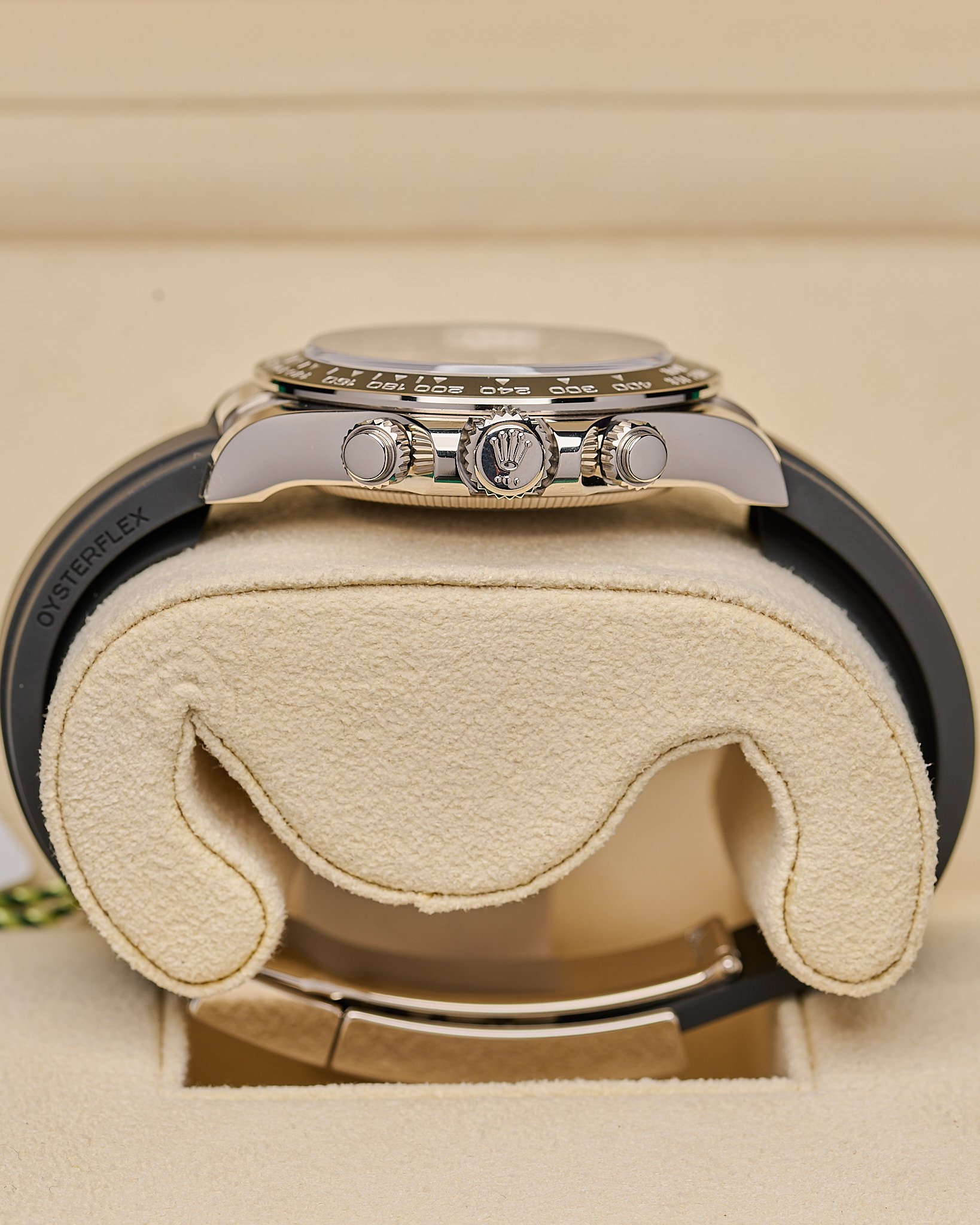 This 2024 Daytona is crafted from 18k white gold and features a sleek black Cerachrom bezel with black oyster flex two-piece strap. Commonly known as the ‘Baby Le Mans’.
