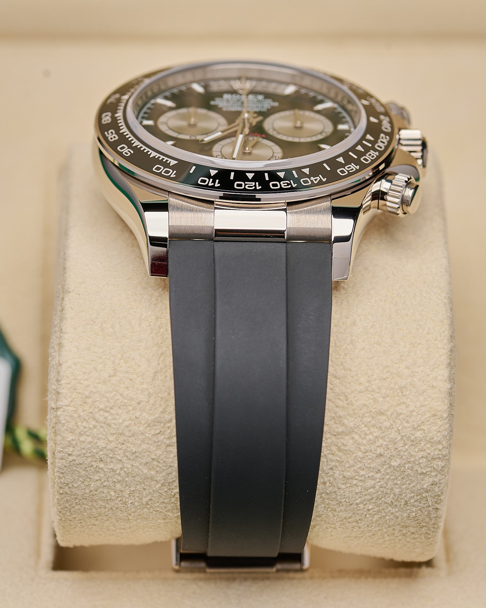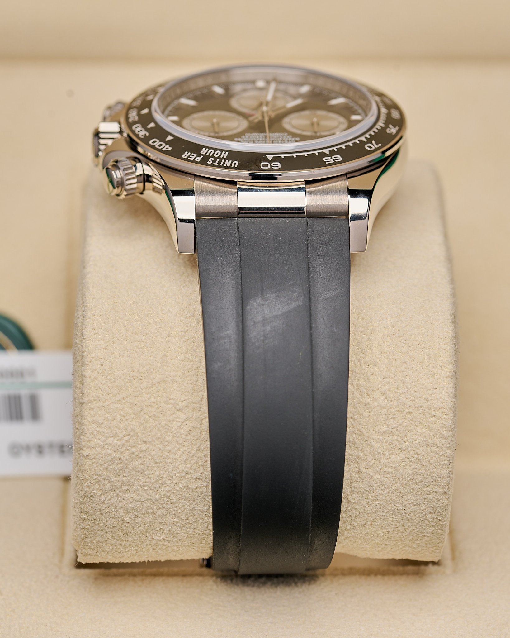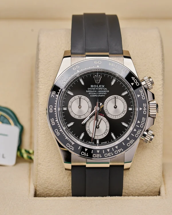 This 2024 Daytona is crafted from 18k white gold and features a sleek black Cerachrom bezel with black oyster flex two-piece strap. Commonly known as the ‘Baby Le Mans’.
