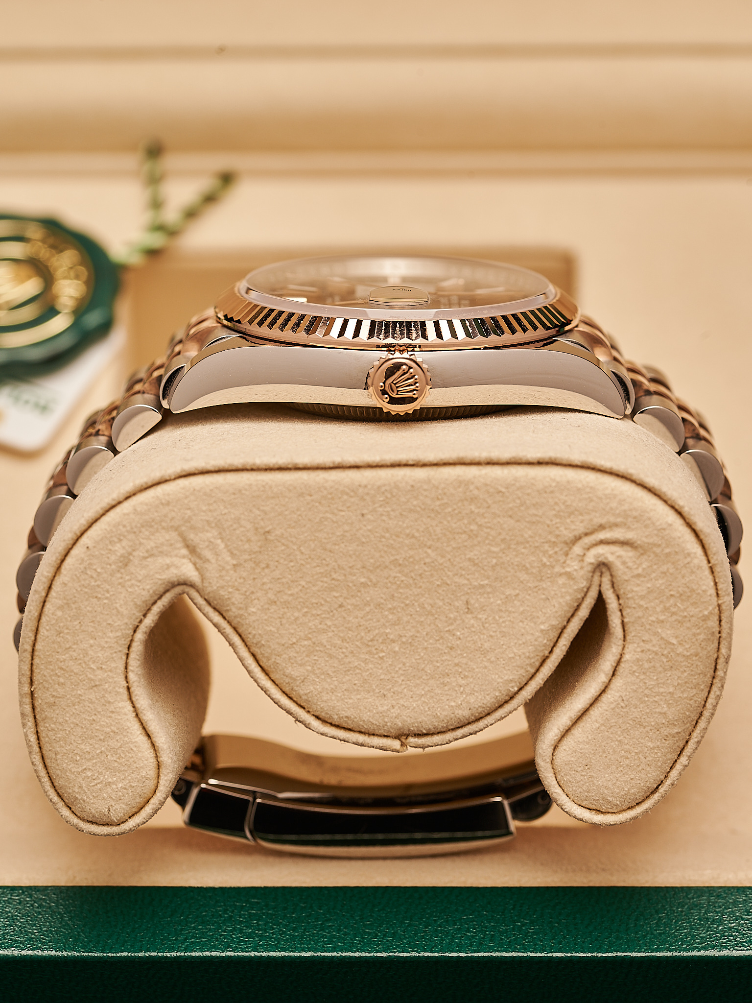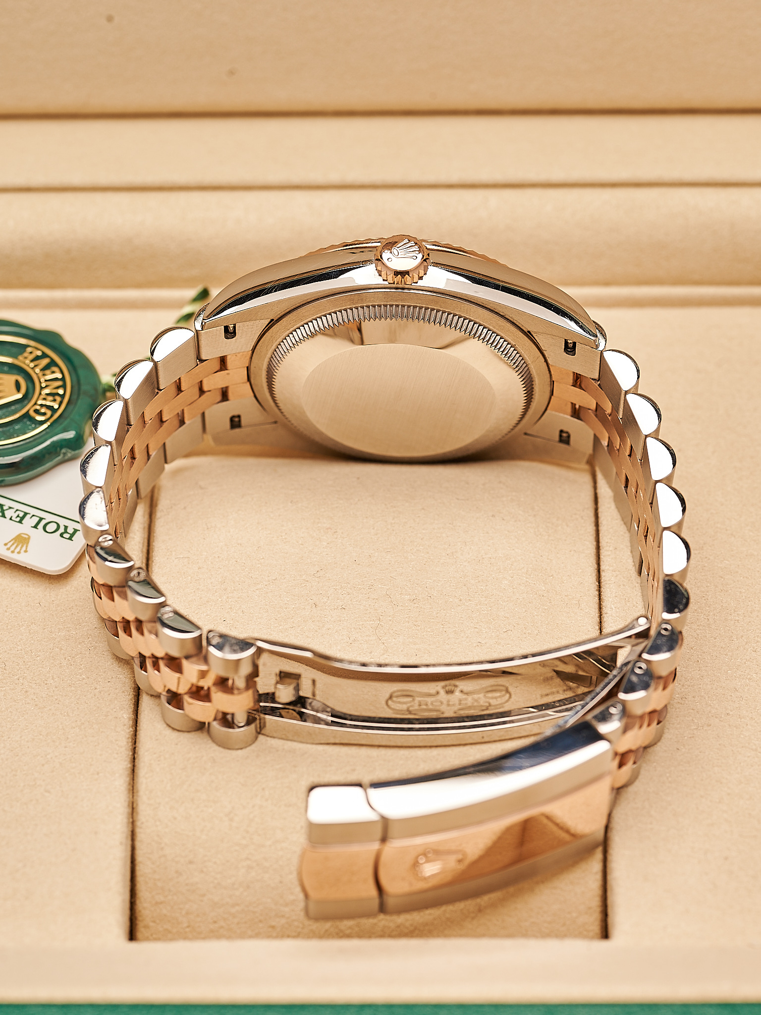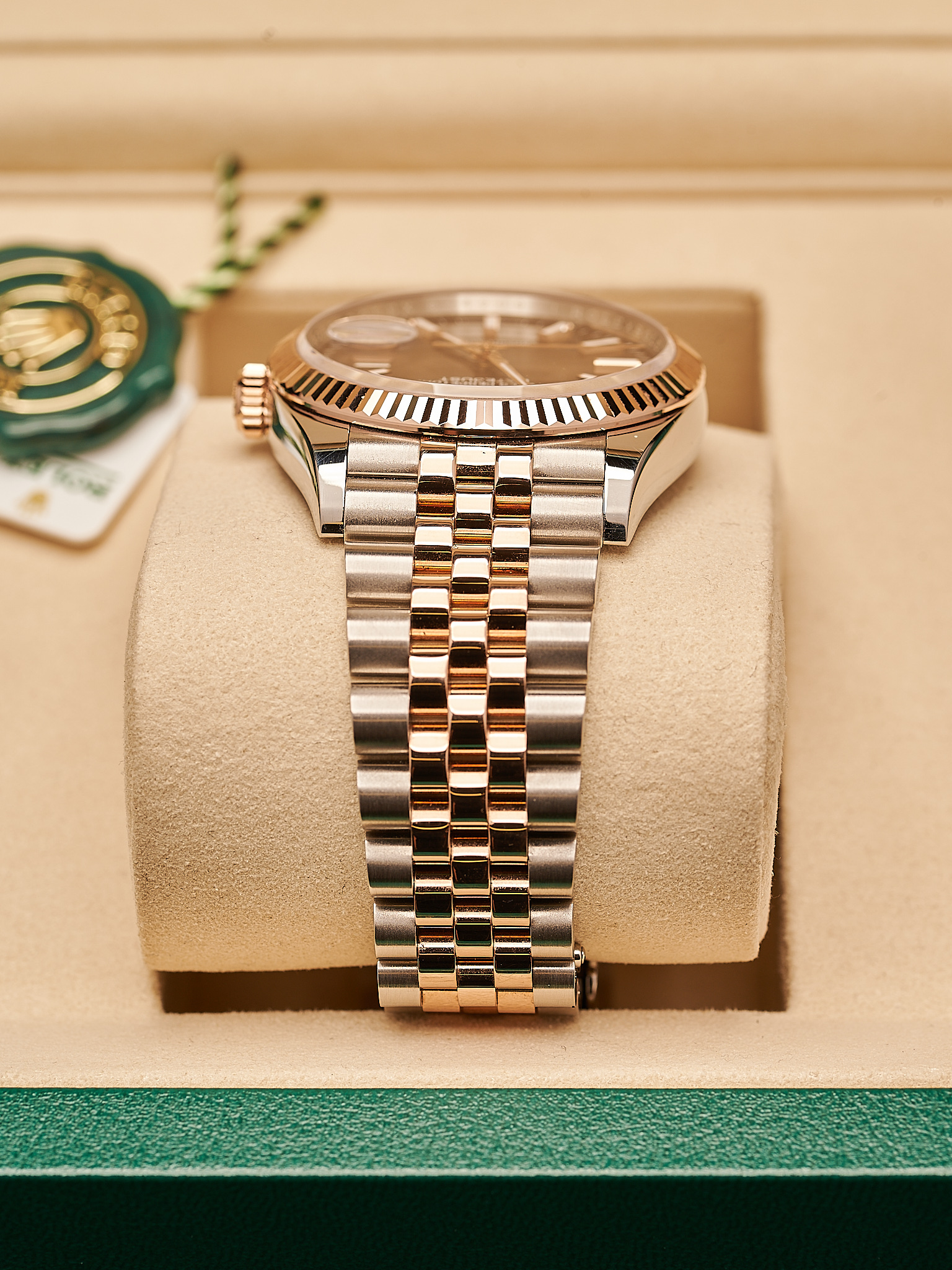 This 2024 Rolex Datejust 126231 features a 36mm stainless steel Oyster case with a classic fluted bezel crafted from solid 18k rose gold, with steel and rose gold bracelet