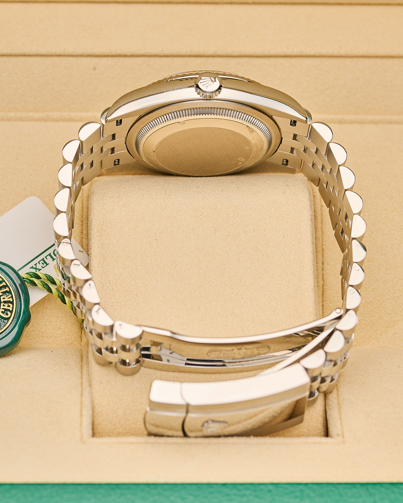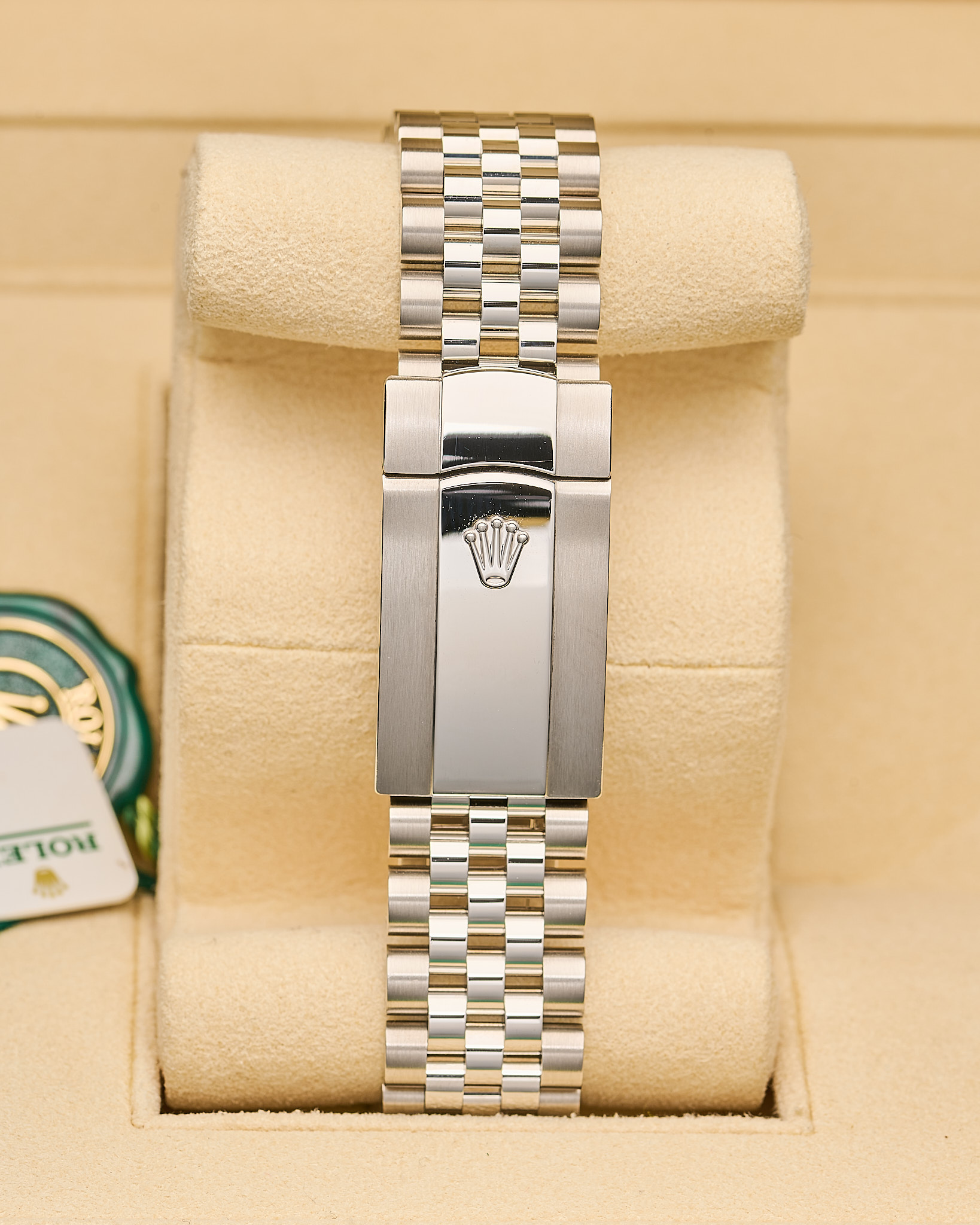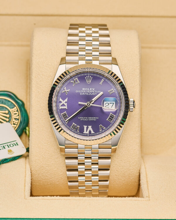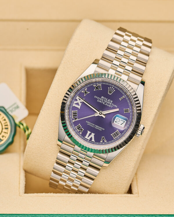 This Rolex Datejust 126234 in Aubergine is a refined 36mm timepiece that combines classic elegance with subtle luxury. Its stainless steel Oyster case is paired with an 18K white gold fluted bezel, accentuating the deep aubergine dial. Diamond hour markers at 6 and 9 o’clock add a touch of sophistication, while the date window at 3 o’clock ensures practicality. Powered by the Caliber 3235 automatic movement, it delivers a 70-hour power reserve and is water-resistant up to 100 meters, offering both performance and timeless style.