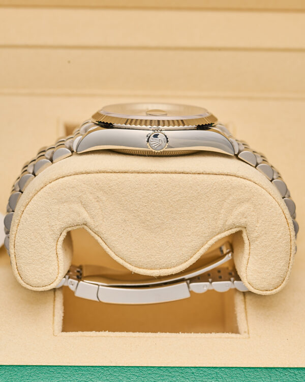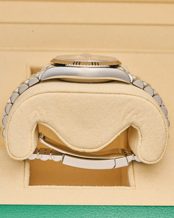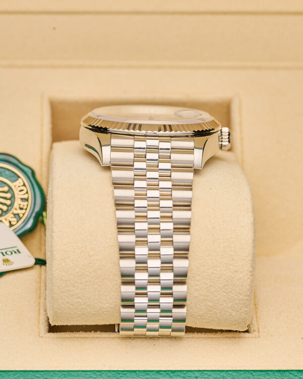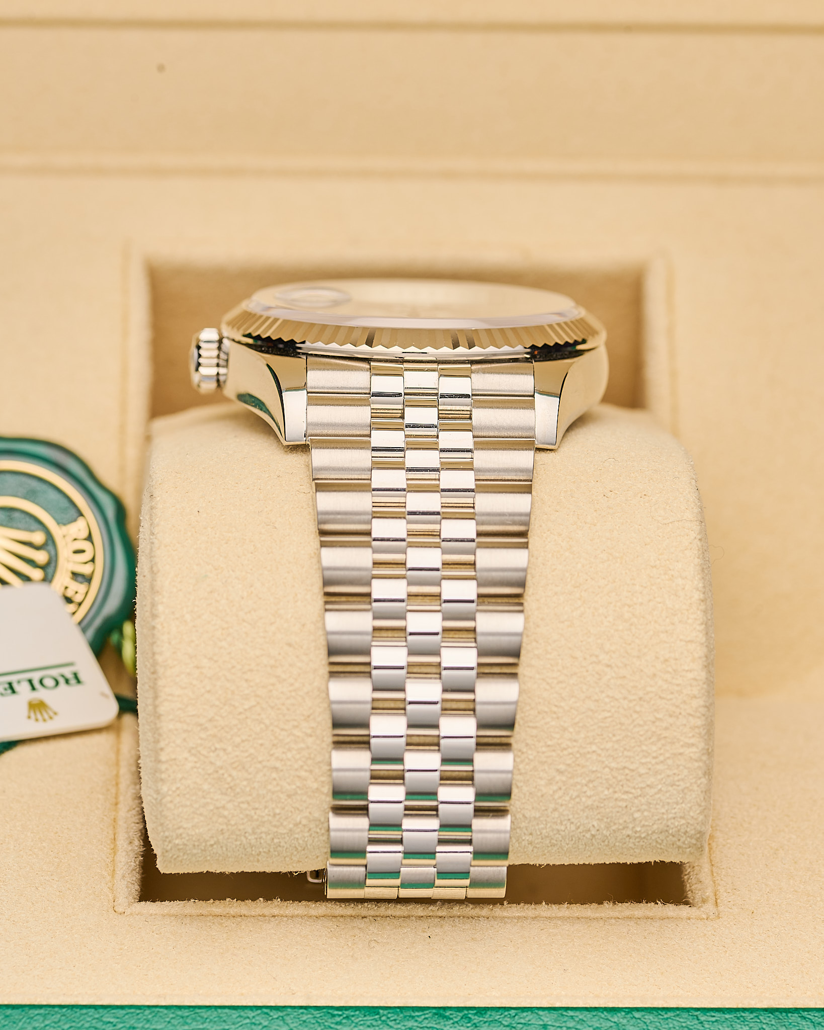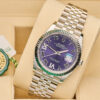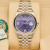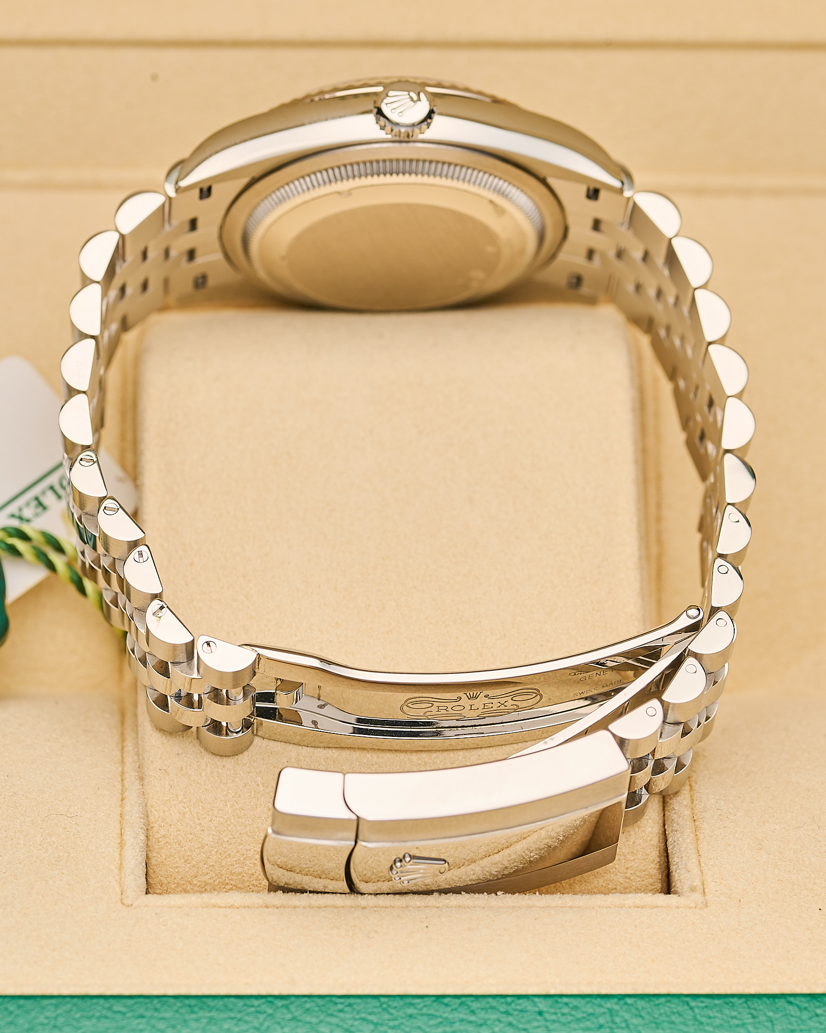 This Rolex Datejust 126234 in Aubergine is a refined 36mm timepiece that combines classic elegance with subtle luxury. Its stainless steel Oyster case is paired with an 18K white gold fluted bezel, accentuating the deep aubergine dial. Diamond hour markers at 6 and 9 o’clock add a touch of sophistication, while the date window at 3 o’clock ensures practicality. Powered by the Caliber 3235 automatic movement, it delivers a 70-hour power reserve and is water-resistant up to 100 meters, offering both performance and timeless style.