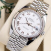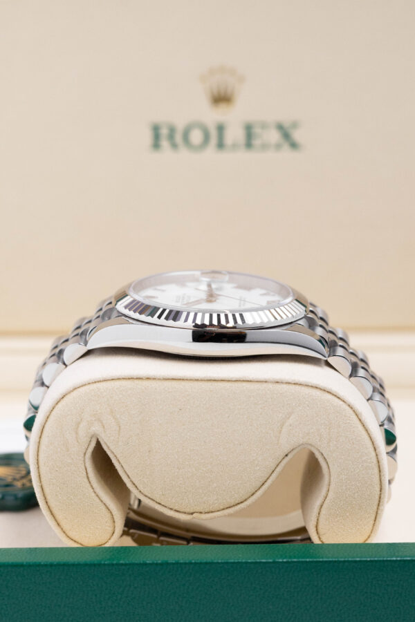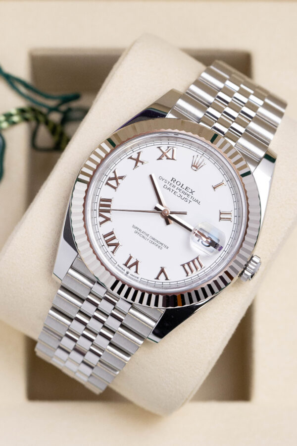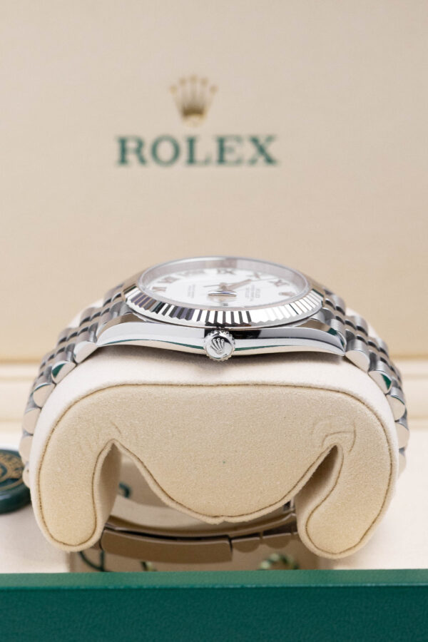 This Rolex 126334 is a 41mm stainless steel Datejust with a white gold fluted bezel, featuring a sleek white roman numeral markers. The iconic Jubilee bracelet ensures comfort and elegance.