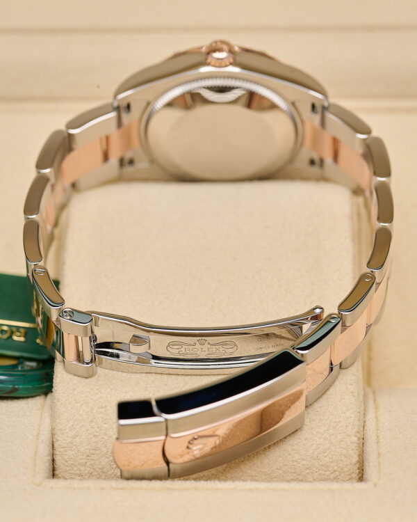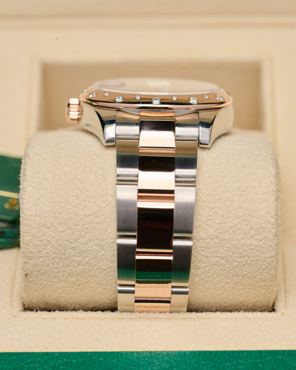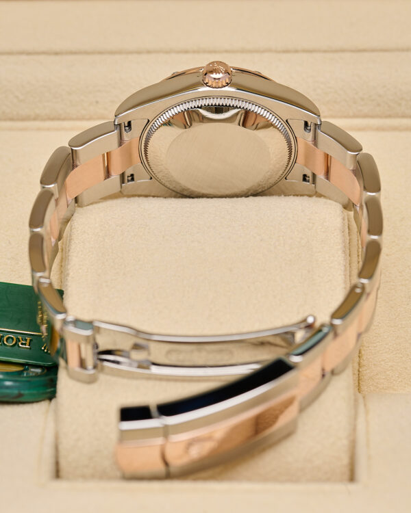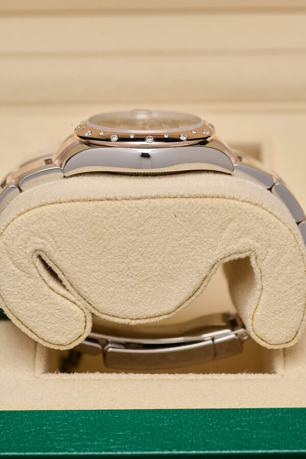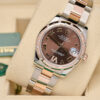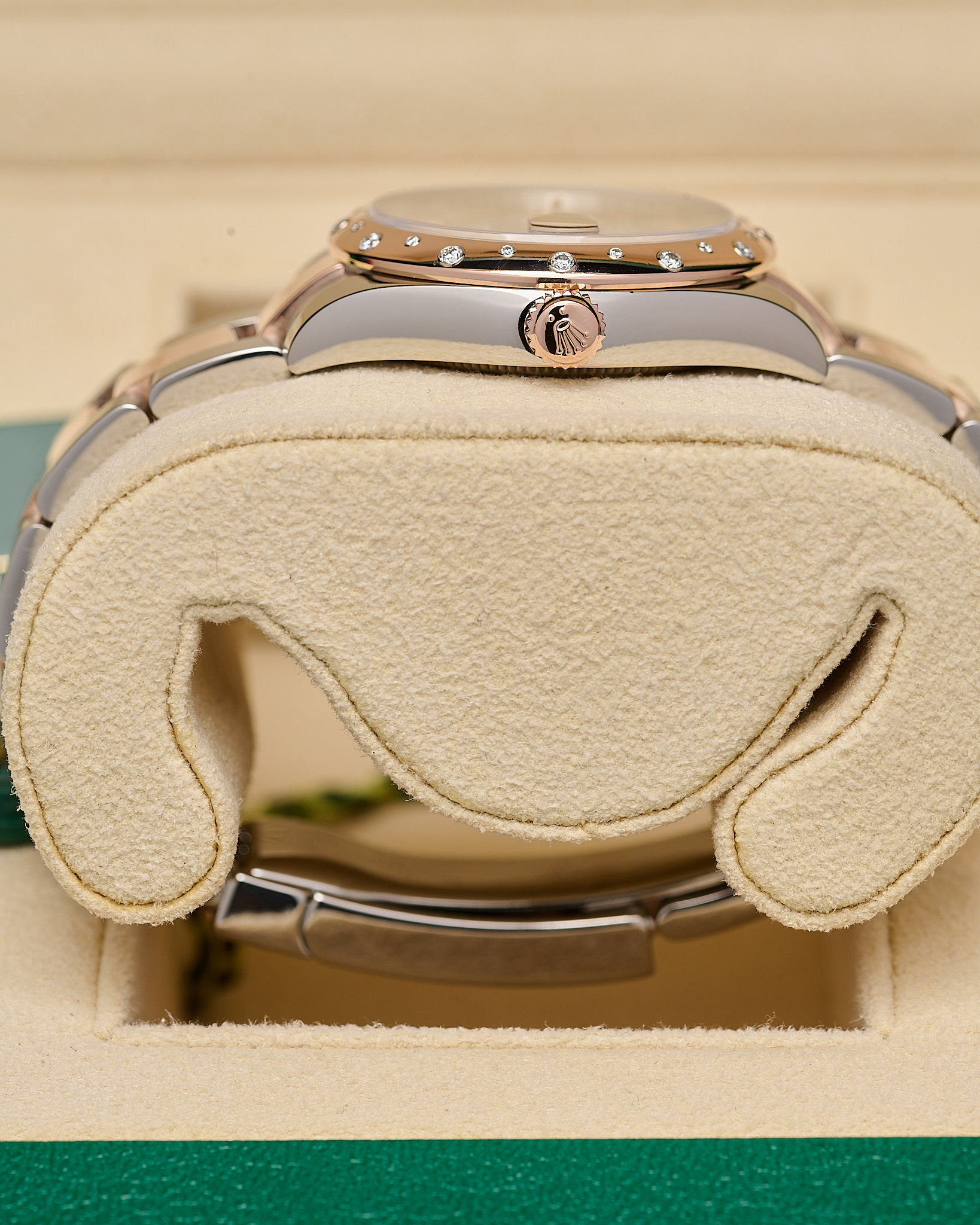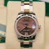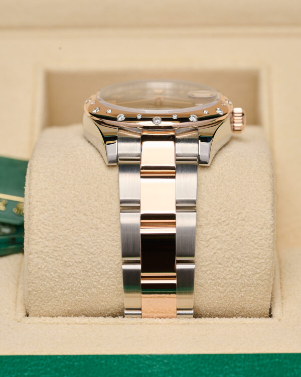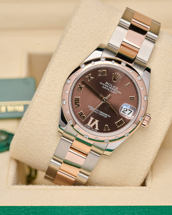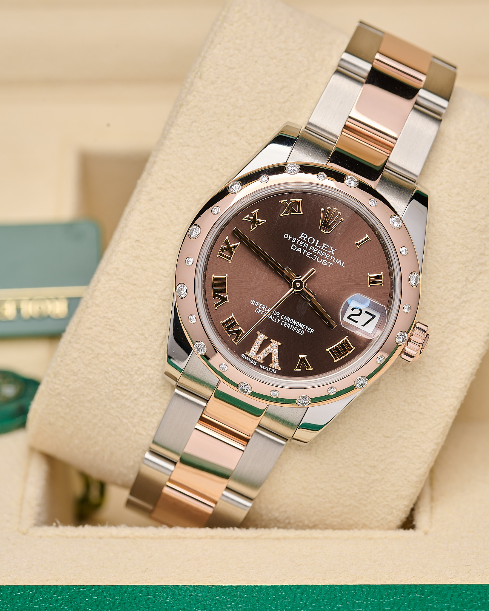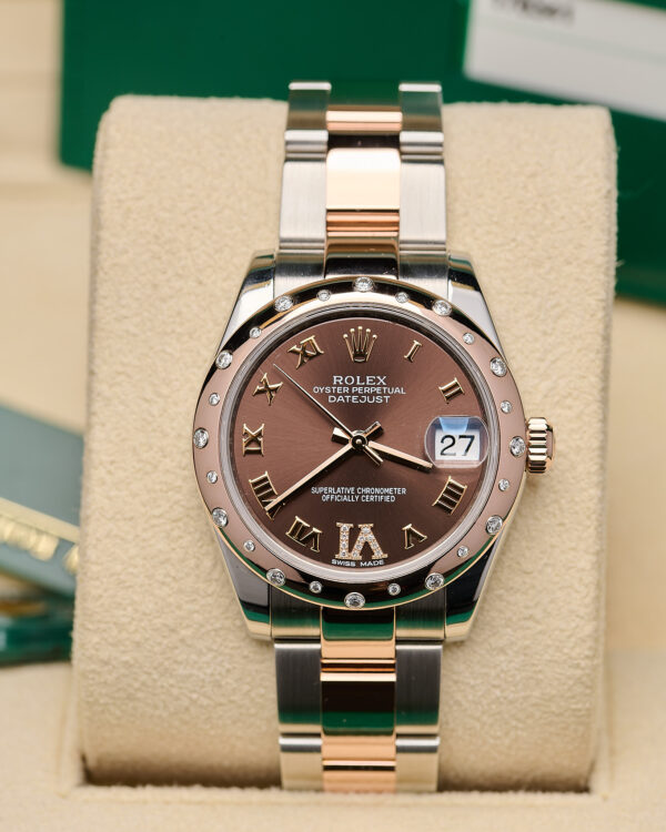 This Rolex Datejust 178341 is a 31mm stainless steel and Everose Rolesor timepiece featuring a diamond-set Everose gold bezel and a chocolate brown dial with Roman numerals with the 6 being diamond set. Powered by the automatic Rolex Calibre 2235 movement, it offers precision and reliability, protected by a scratch-resistant sapphire crystal and water resistance up to 100 meters. Fitted with the classic Oyster bracelet, this model combines everyday durability with refined elegance.