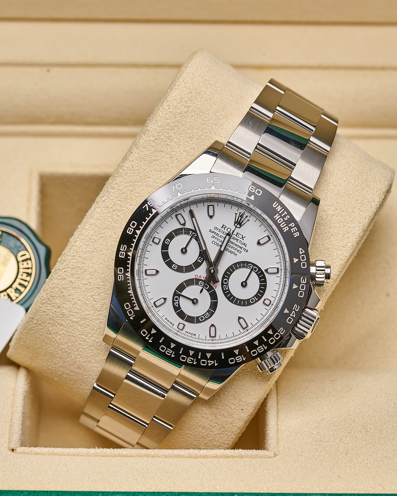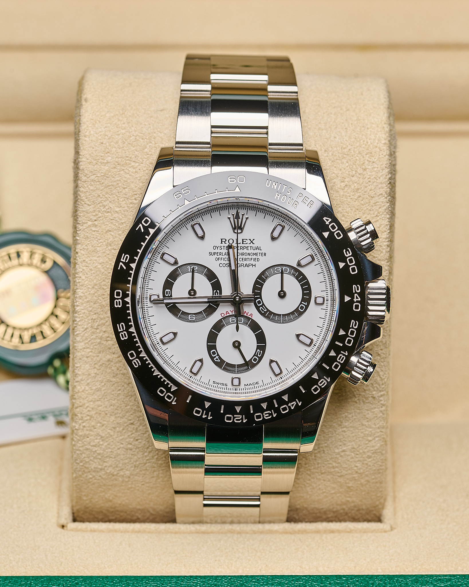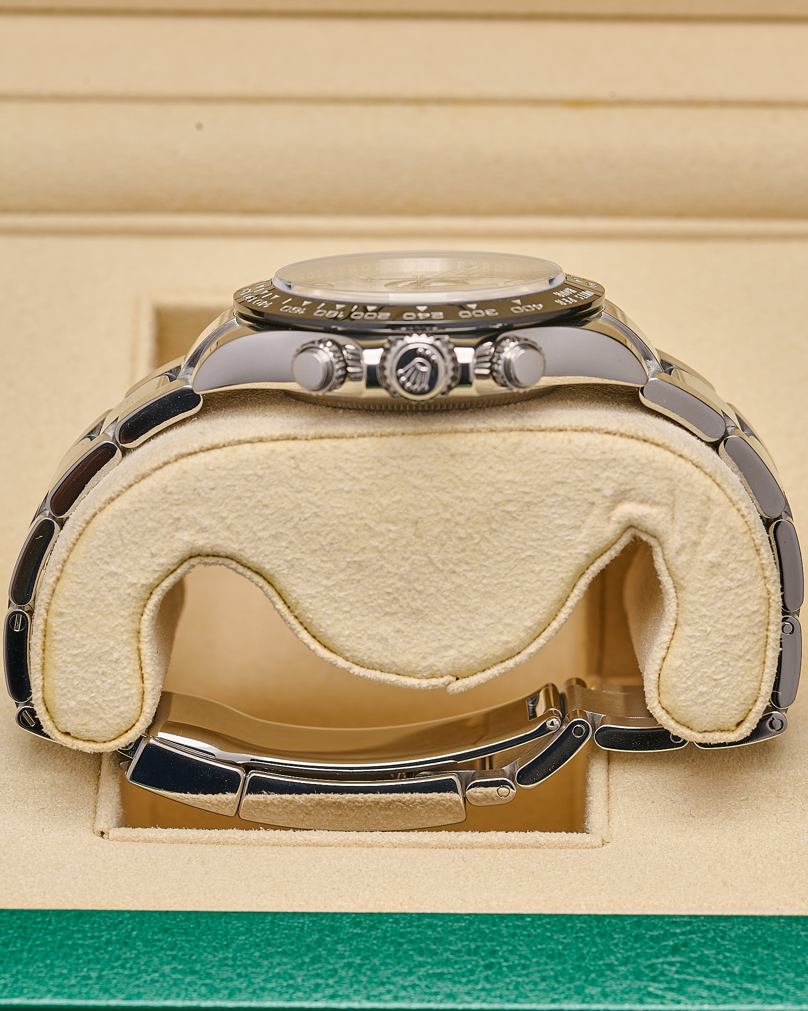 This Rolex Daytona 116500LN Panda embodies racing heritage and refined performance. The crisp white dial with bold black sub-dials, paired with the sleek black Cerachrom bezel, delivers legendary contrast and timeless presence.