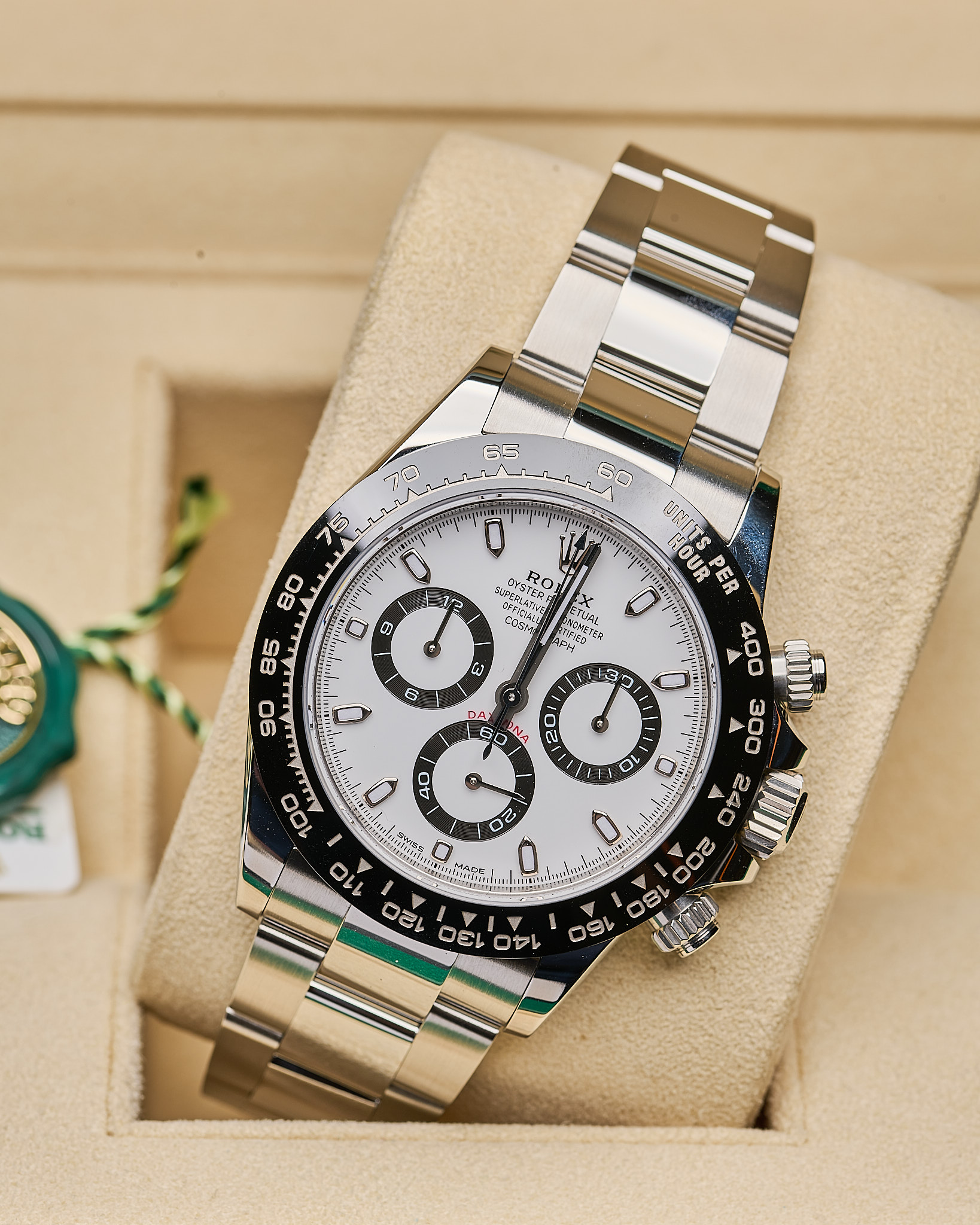 This Rolex Daytona 116500LN Panda embodies racing heritage and refined performance. The crisp white dial with bold black sub-dials, paired with the sleek black Cerachrom bezel, delivers legendary contrast and timeless presence.