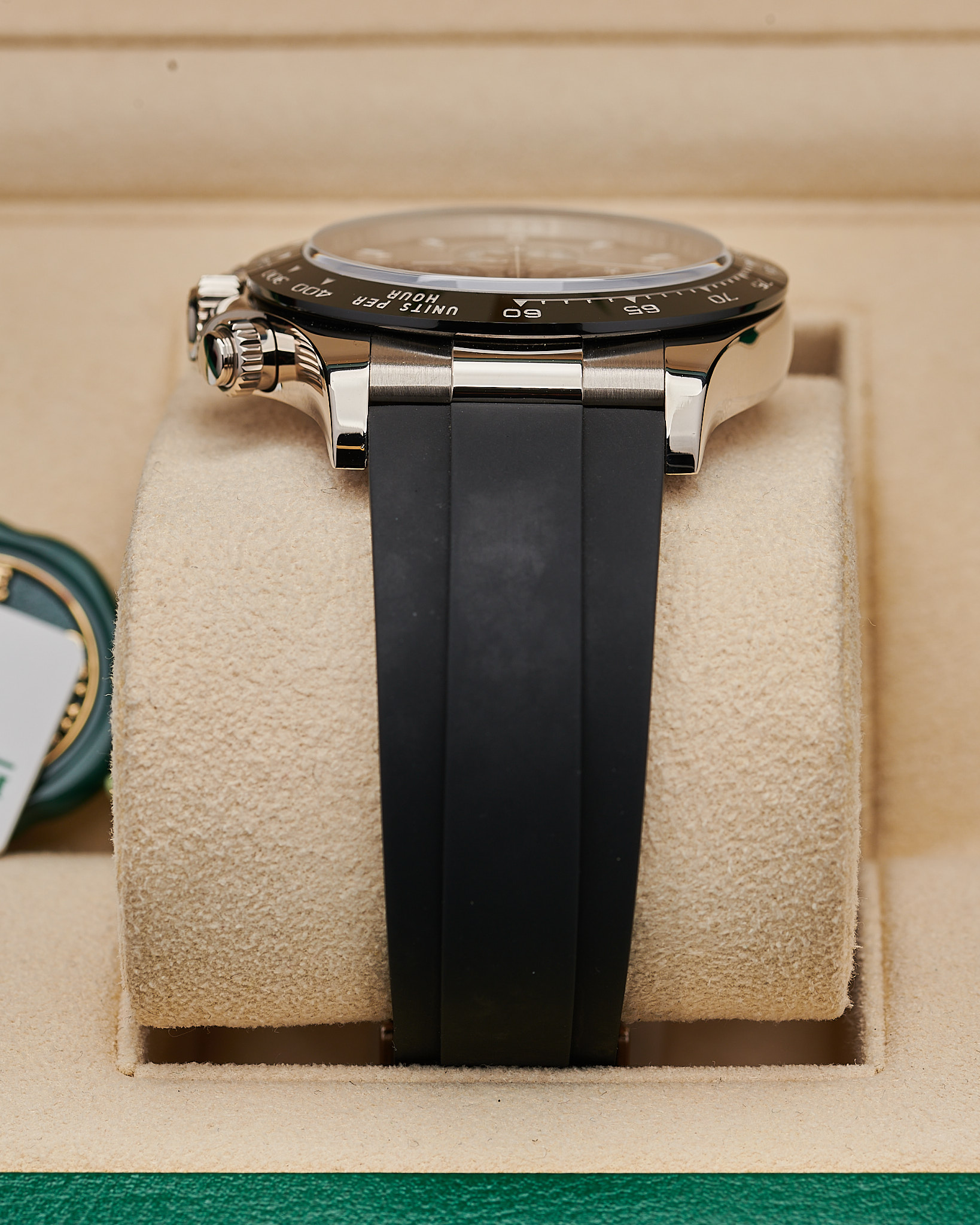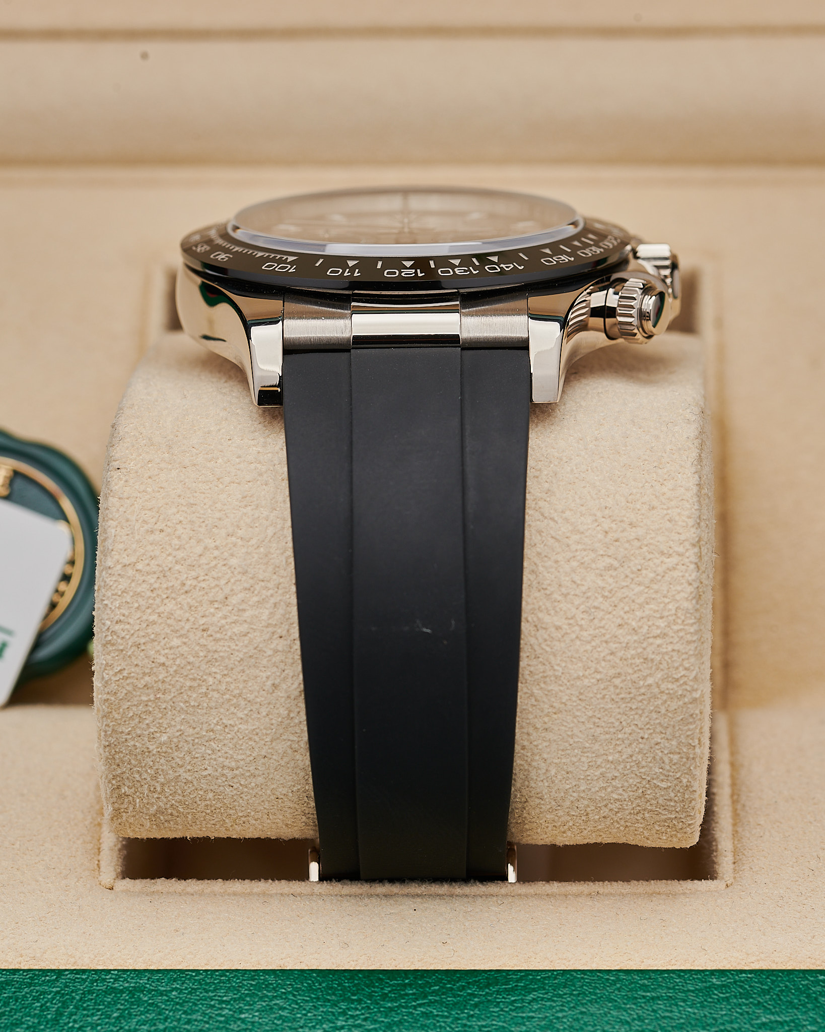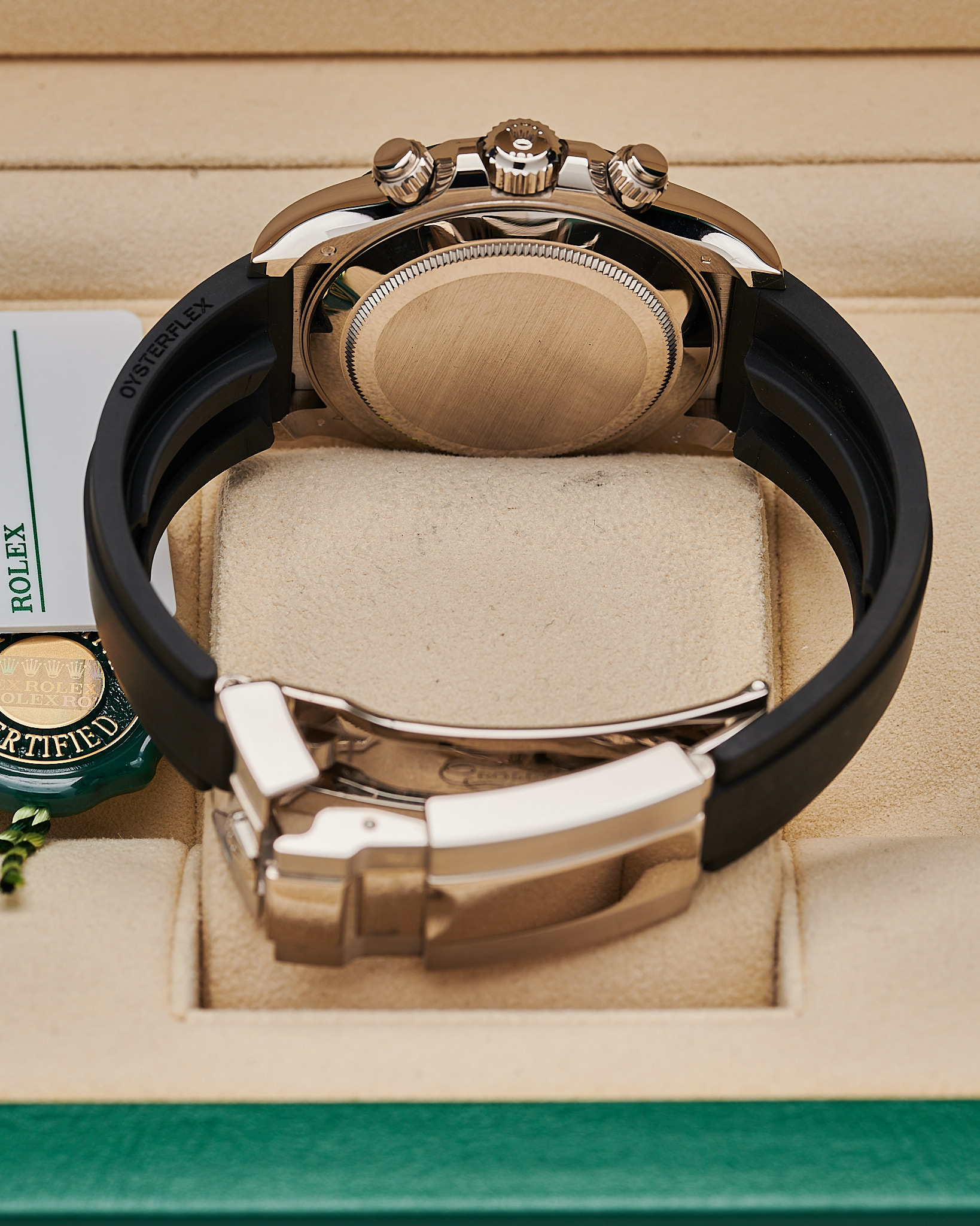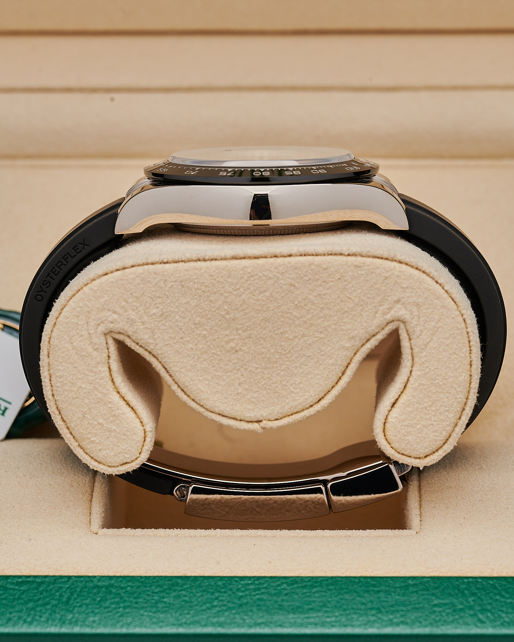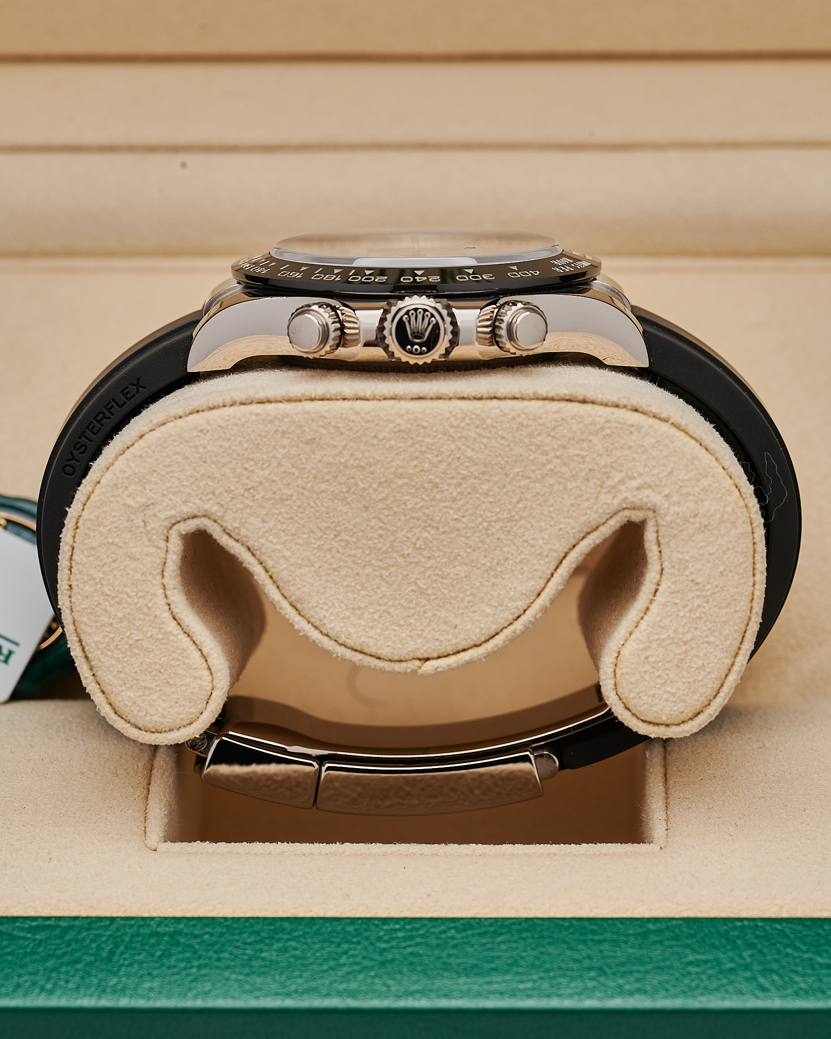 This 2021 Daytona features a 40mm white gold case and distinctive steel-grey dial with contrasting black sub-dials, earning it the “Ghost” nickname. It comes completed with a comfortable Oysterflex bracelet, and white gold double lock clasp.