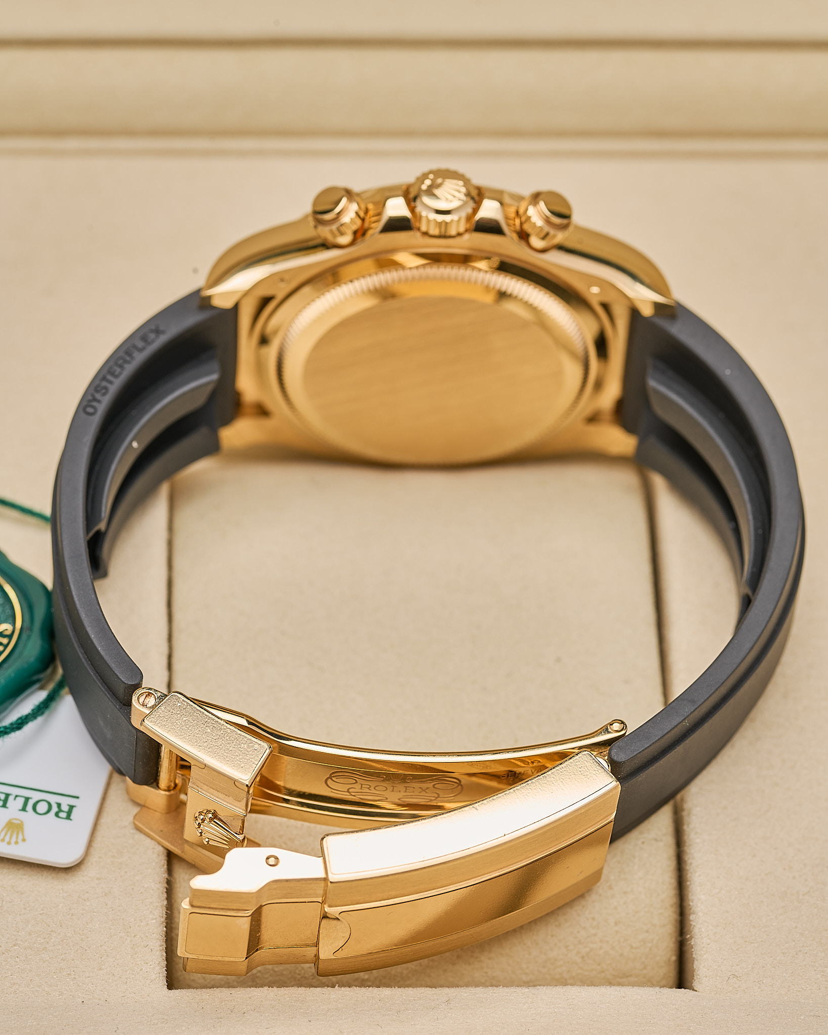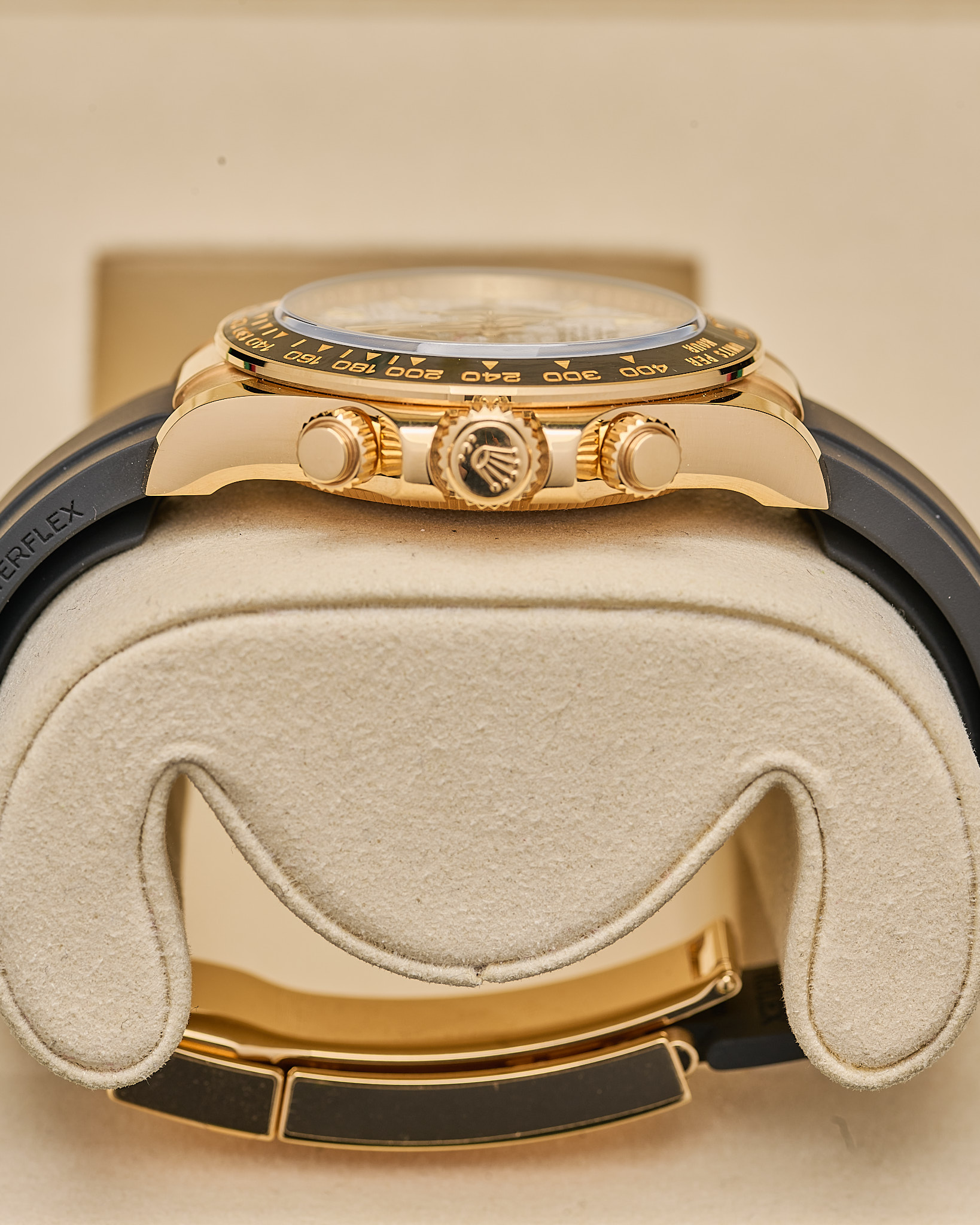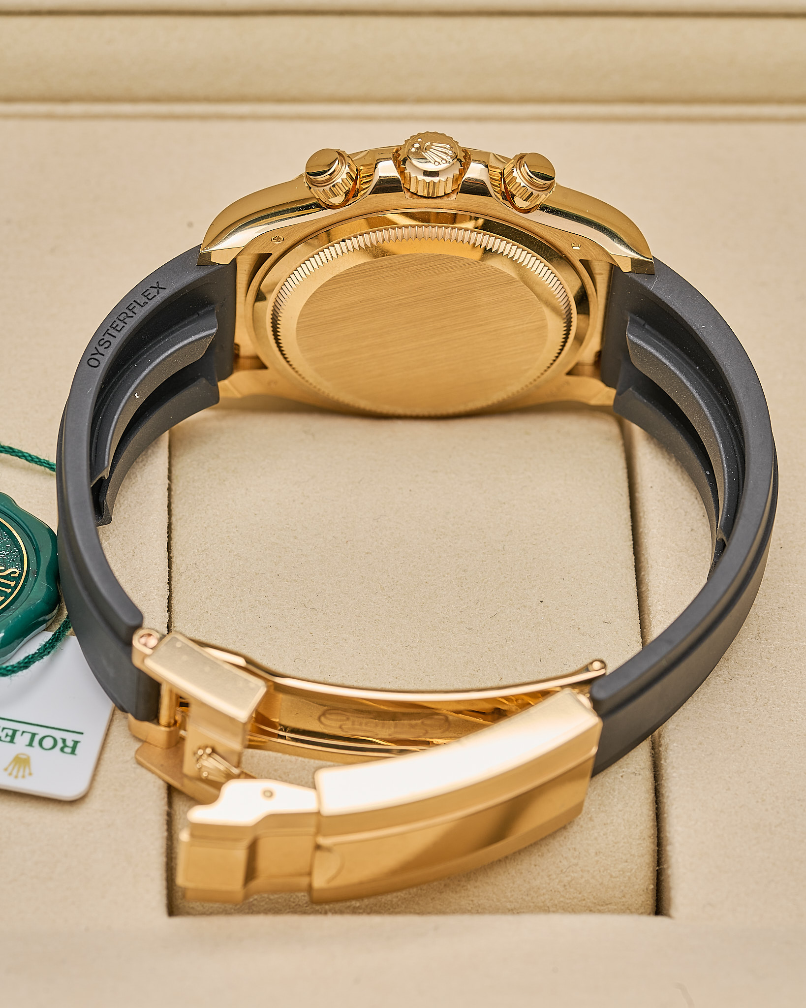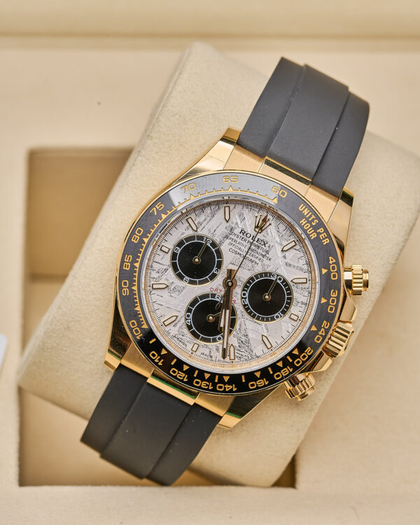 This Rolex 126518LN is a 40mm yellow gold Cosmograph Daytona, fitted with a black Cerachrom bezel engraved with a tachymetric scale. Its rare meteorite dial with contrasting black sub-dials gives each piece a unique natural pattern. The watch is paired with Rolex’s durable Oysterflex bracelet with an 18k yellow gold Oysterclasp, blending sportiness with luxury.