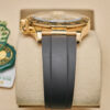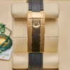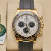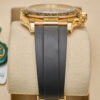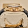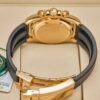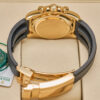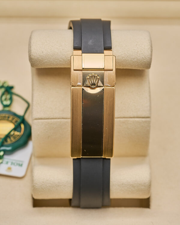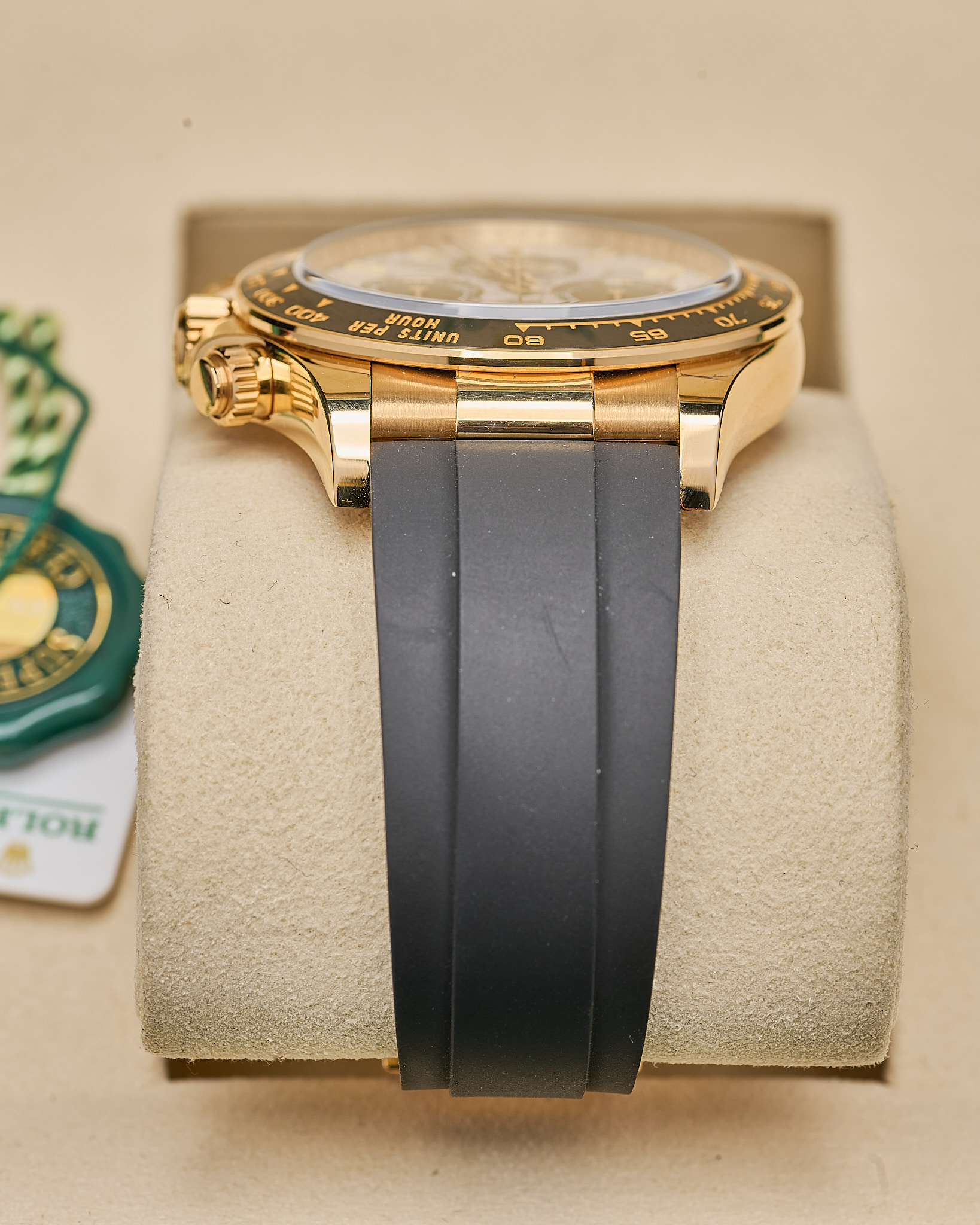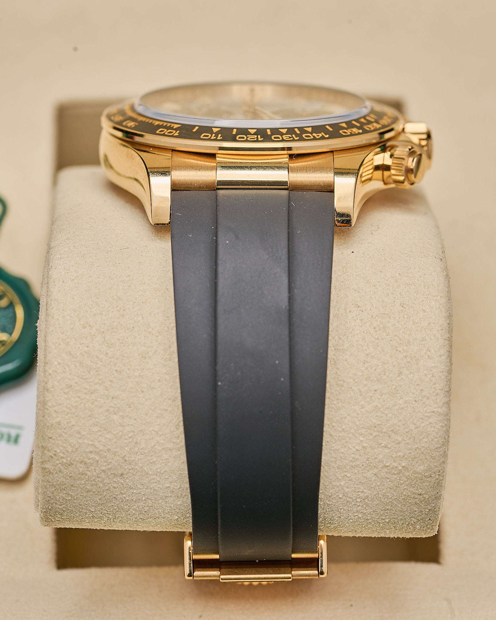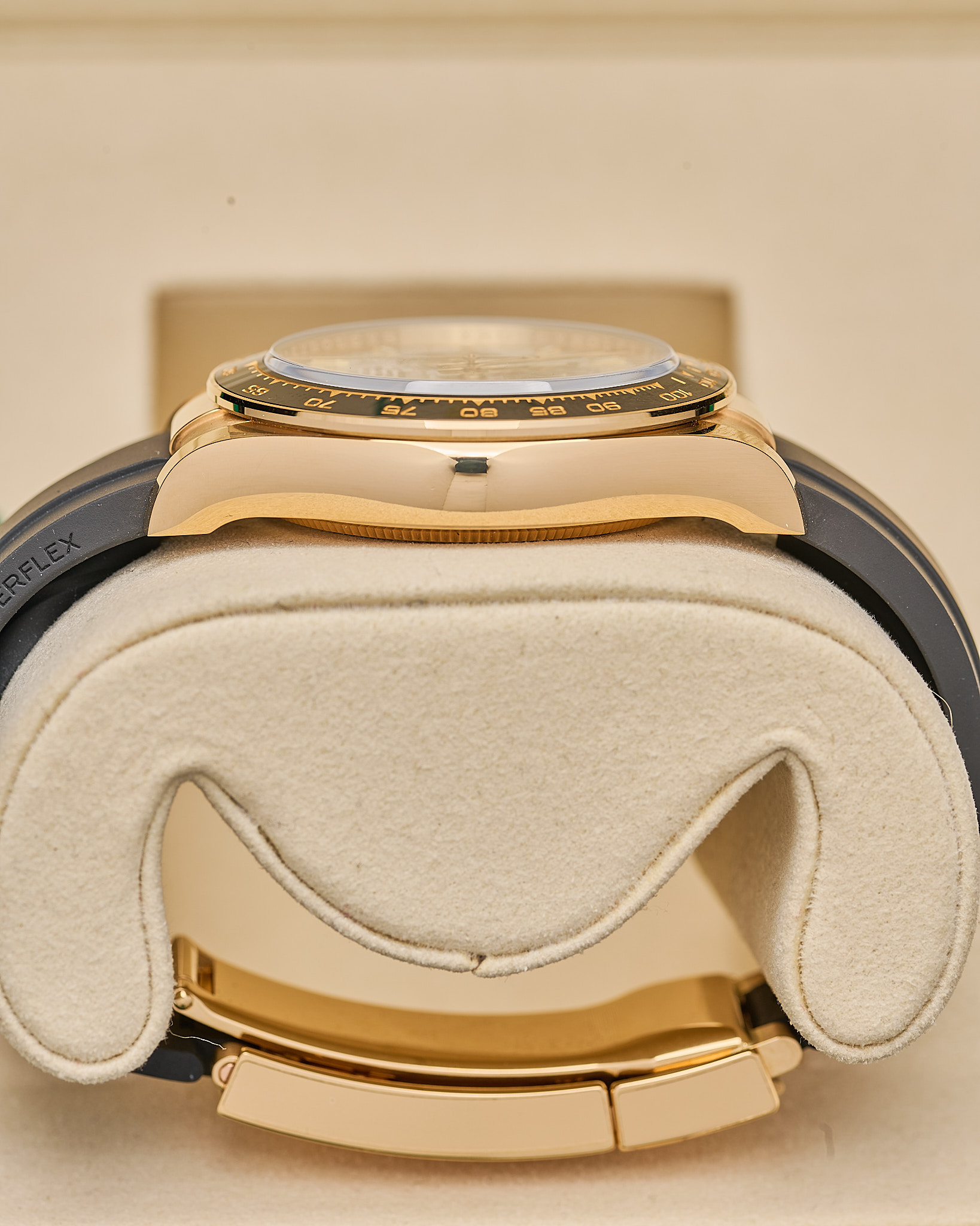 This Rolex 126518LN is a 40mm yellow gold Cosmograph Daytona, fitted with a black Cerachrom bezel engraved with a tachymetric scale. Its rare meteorite dial with contrasting black sub-dials gives each piece a unique natural pattern. The watch is paired with Rolex’s durable Oysterflex bracelet with an 18k yellow gold Oysterclasp, blending sportiness with luxury.