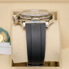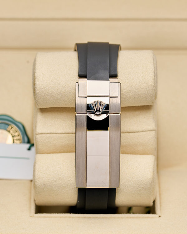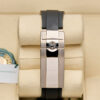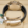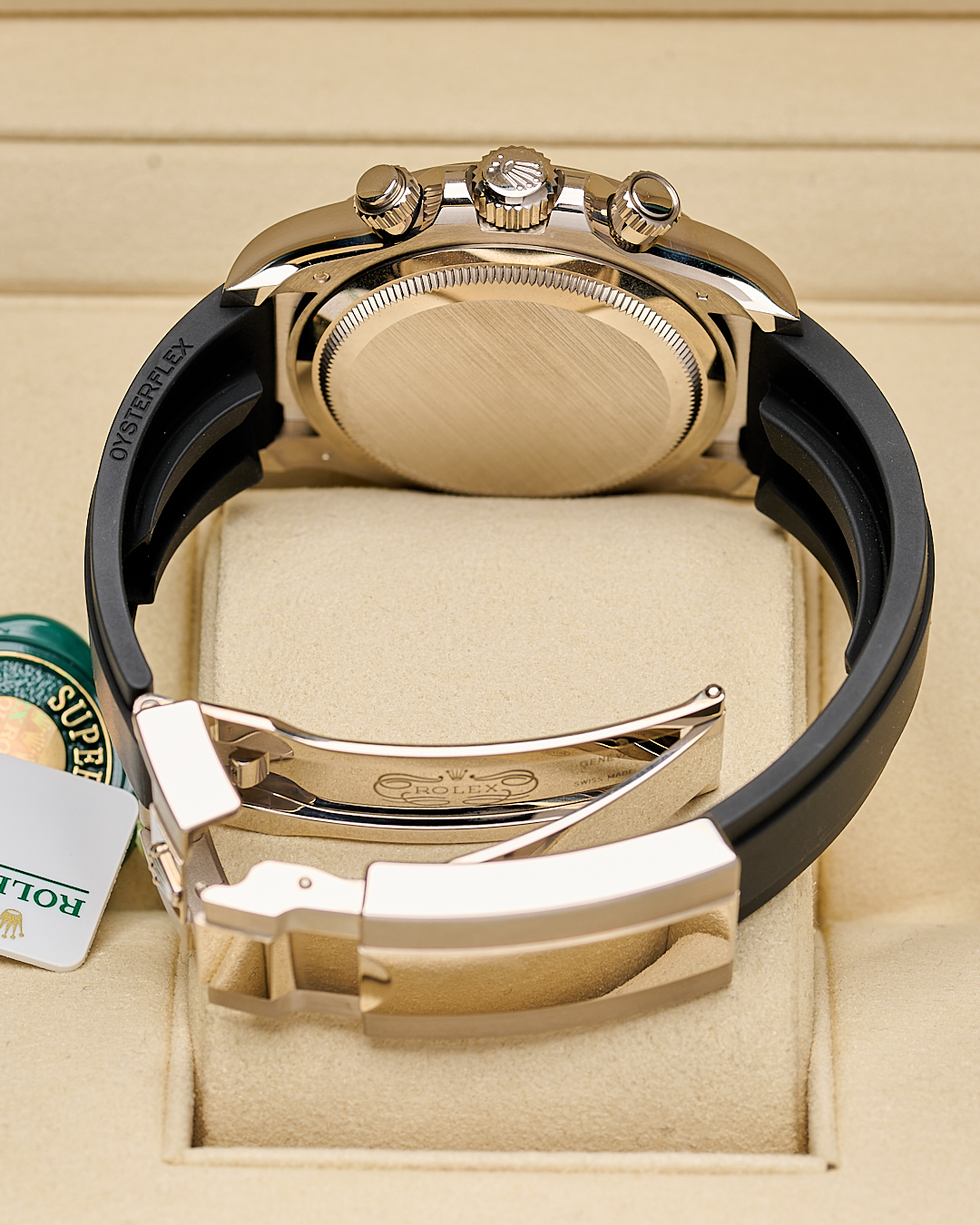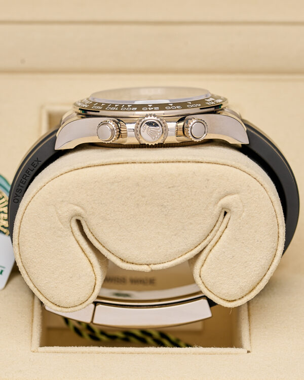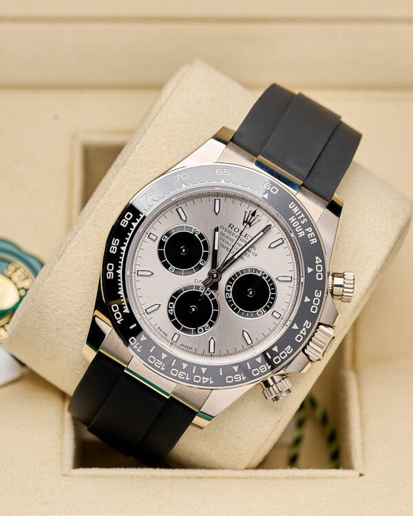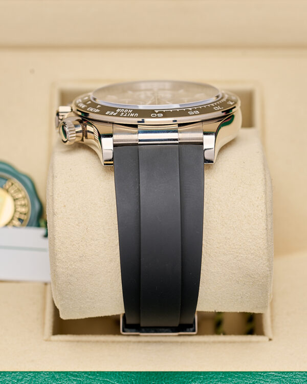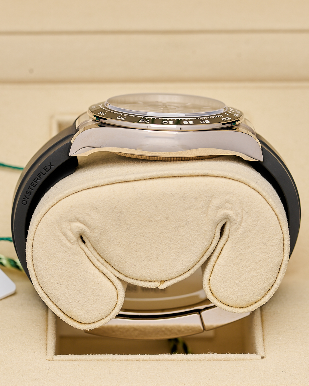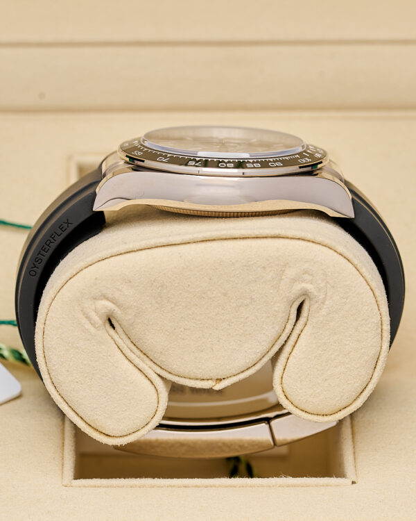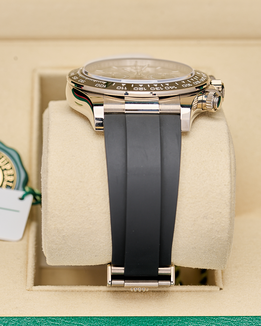 The Rolex Daytona 126519LN ‘Ghost’ is a 40mm chronograph crafted in 18k white gold. It features a black Cerachrom bezel with a tachymetric scale, a grey dial with black subdials. This model is fitted with a black Oysterflex rubber strap and an 18k white gold Oysterlock clasp.