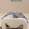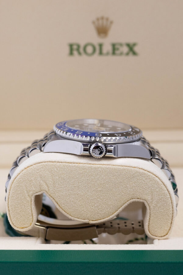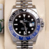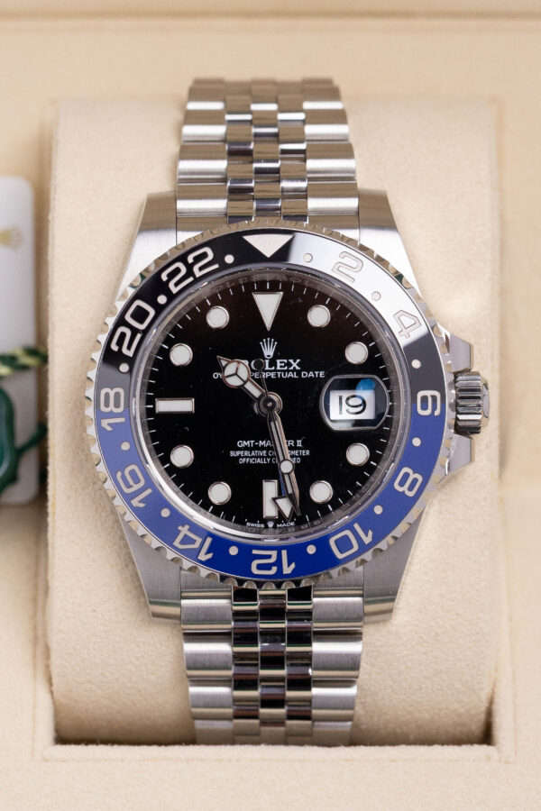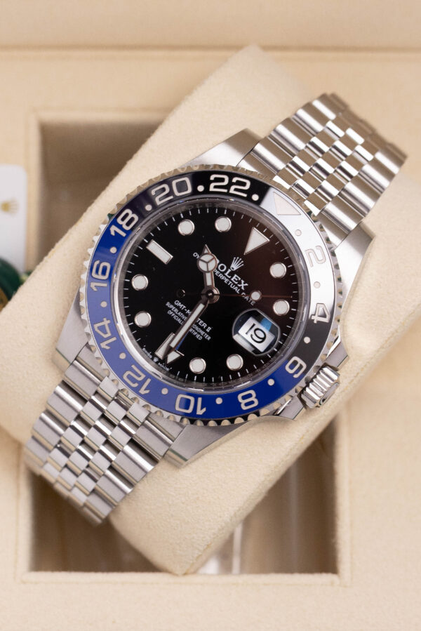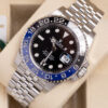 Rolex GMT-Master II ref. 126710BLNR 2021, nicknamed the “Batgirl,” features a 40mm Oystersteel case with a bidirectional rotating bezel in black and blue Cerachrom ceramic. The black dial includes Chromalight luminescent markers and hands. It features an independently adjustable 24-hour GMT hand. This model is paired with a Jubilee bracelet featuring an Oysterlock clasp and Easylink extension. It is water-resistant to 100 meters and blends utility with iconic design.