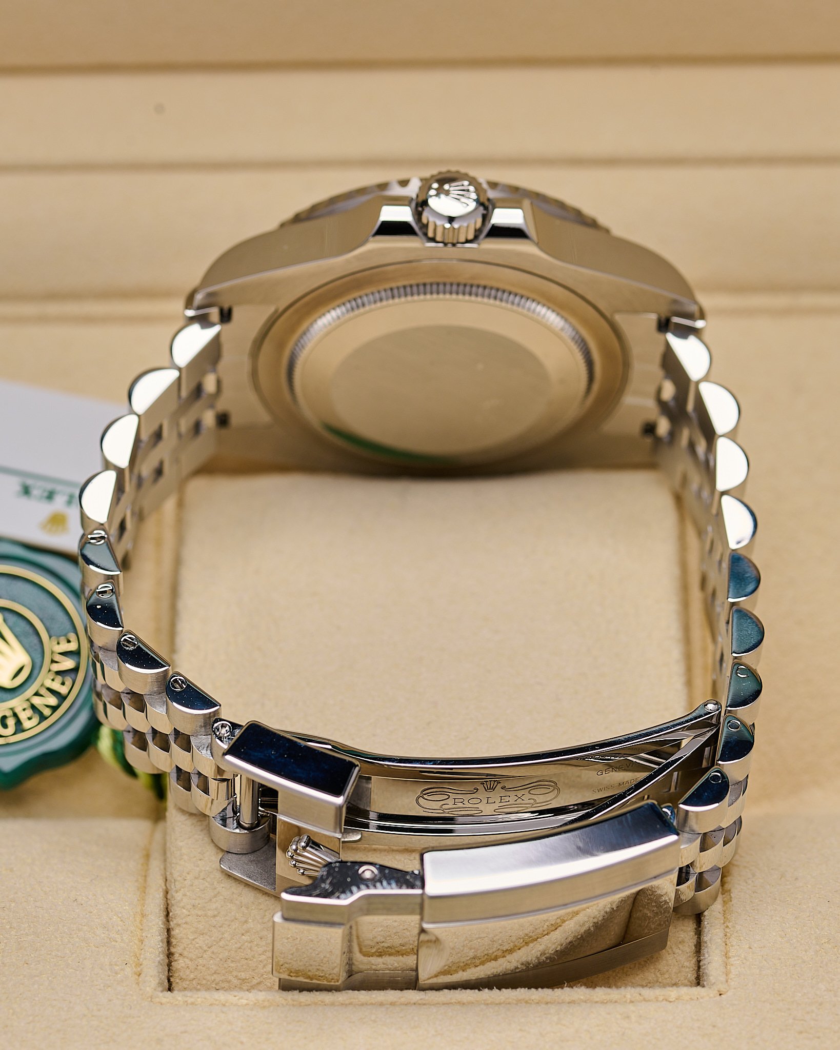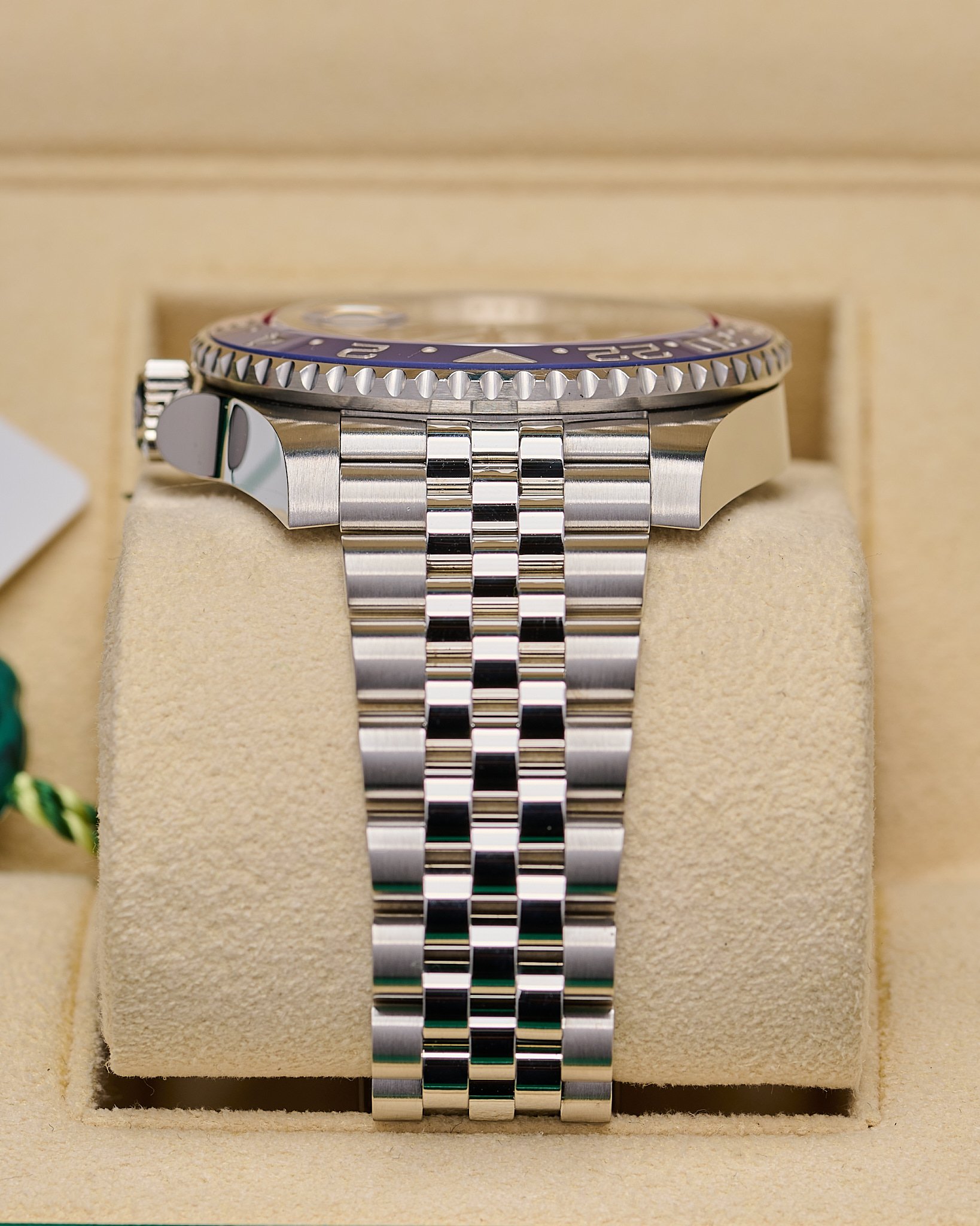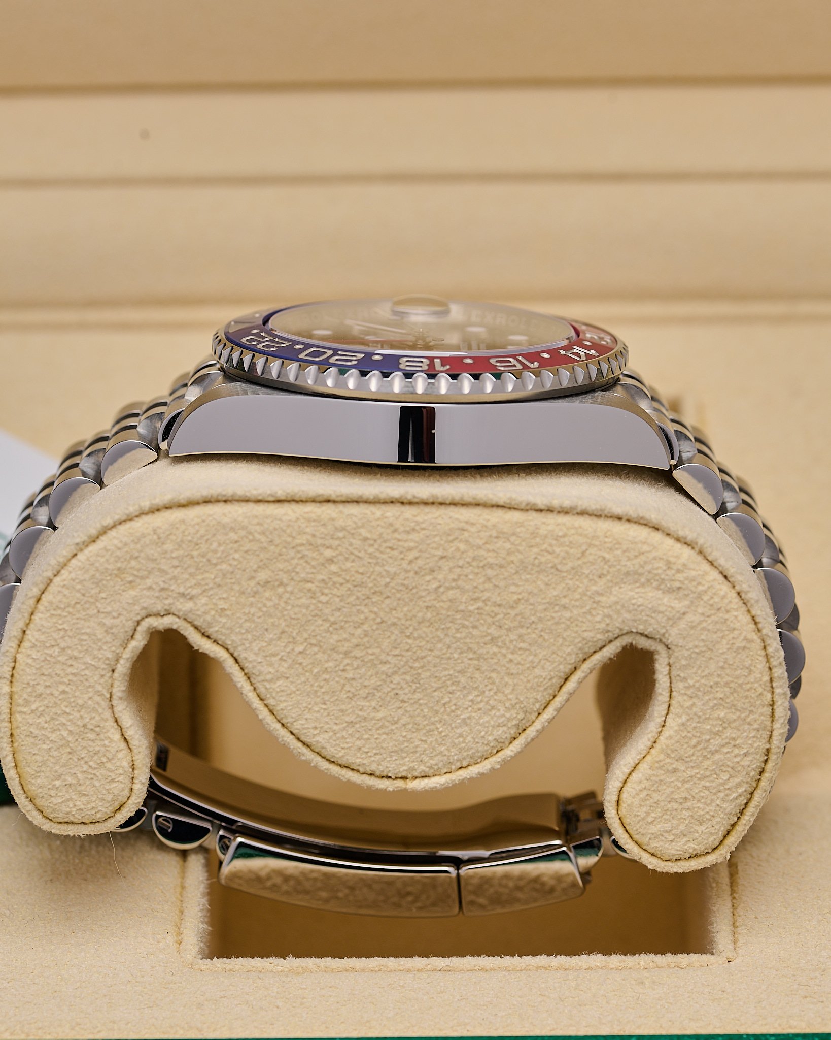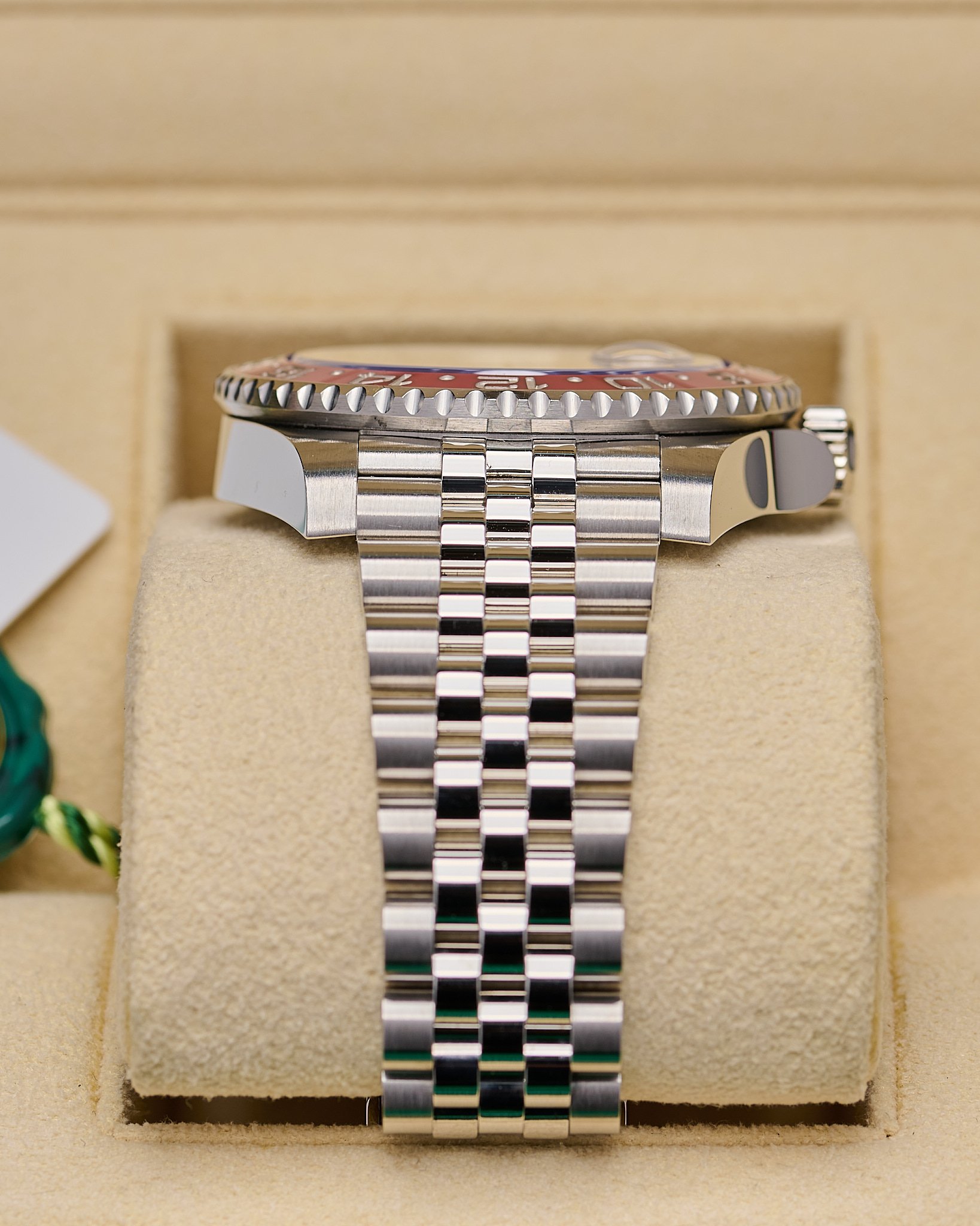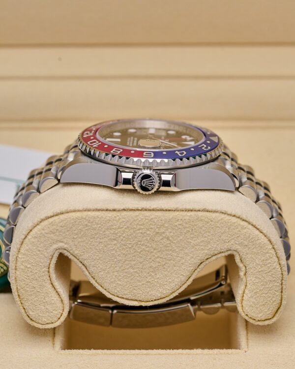 This popular ‘Pepsi’ on Jubilee bracelet features a sleek blue and Red Cerachrom ceramic bezel.