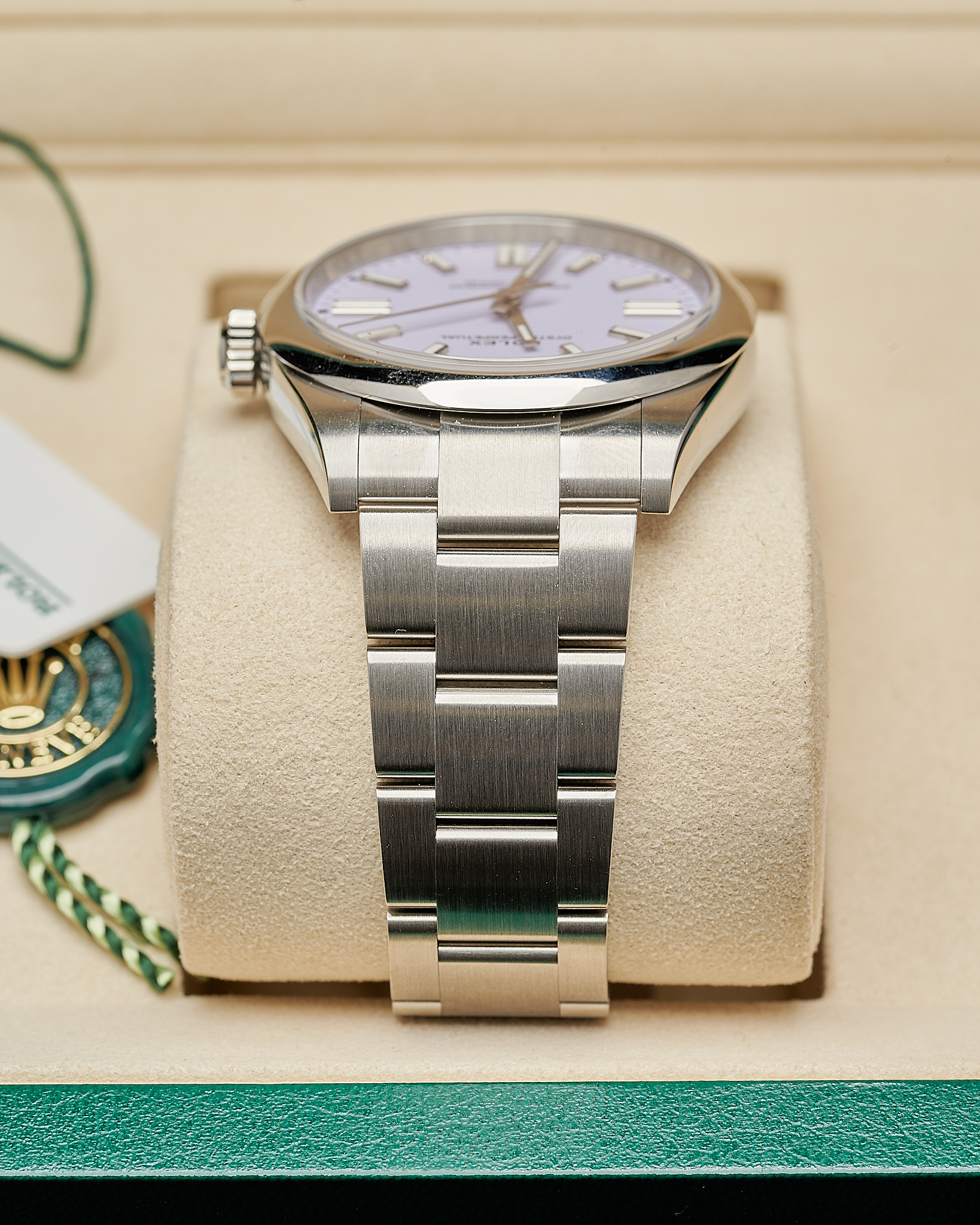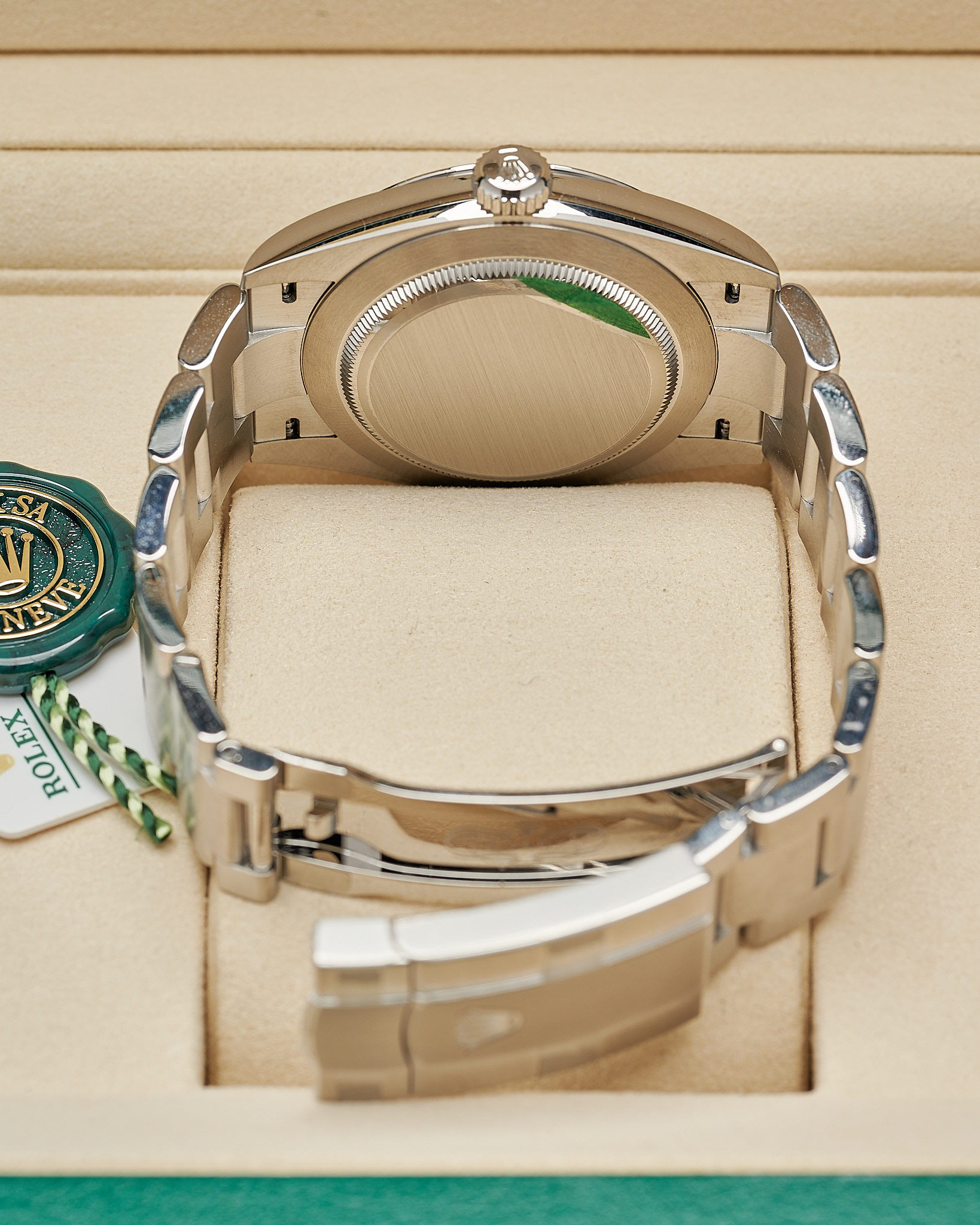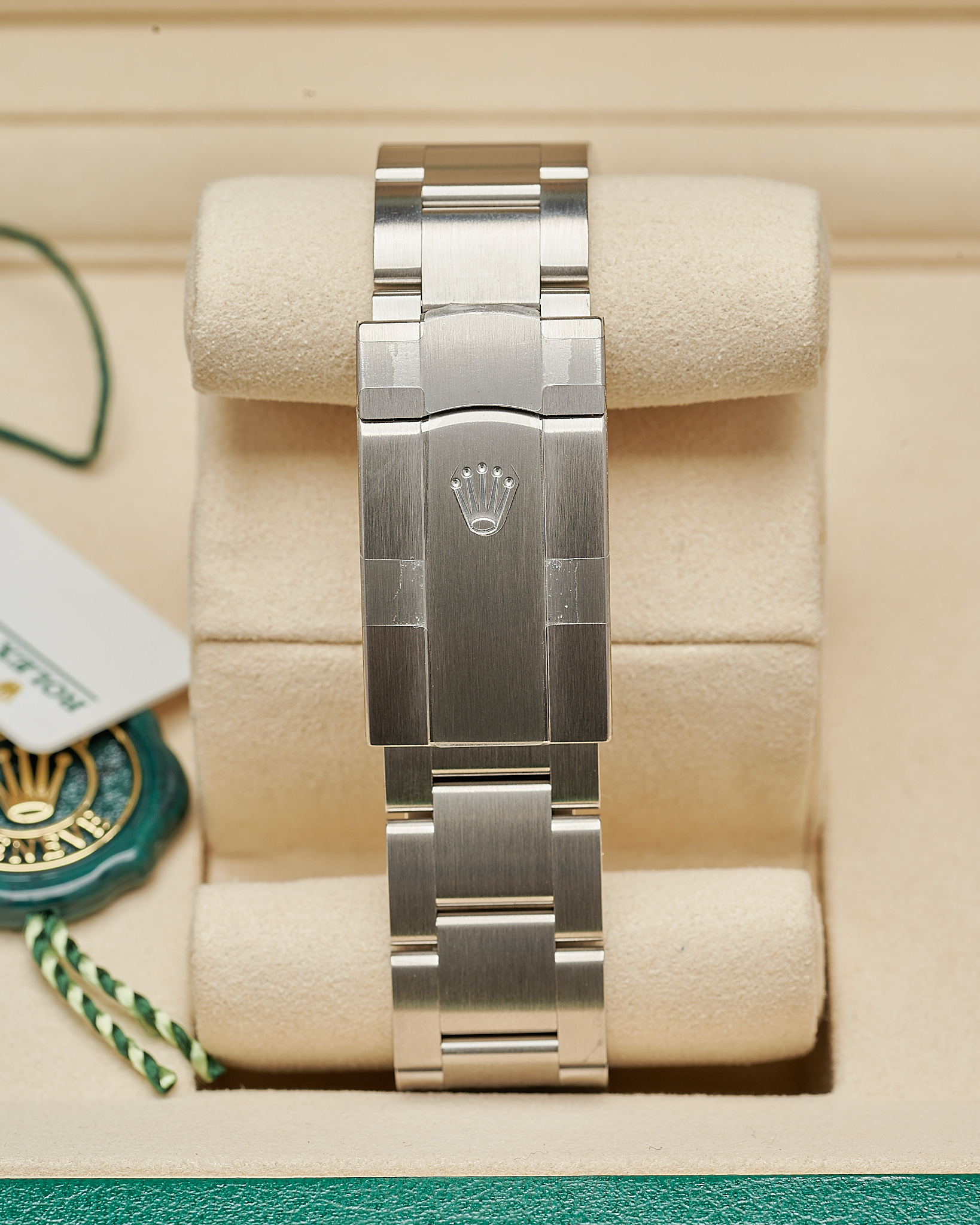 In unworn condition, this Rolex watch comes complete as a full set. Inclusive of both boxes, warranty card, serial tag (most important), round tag, booklet, wallet and original receipt.
