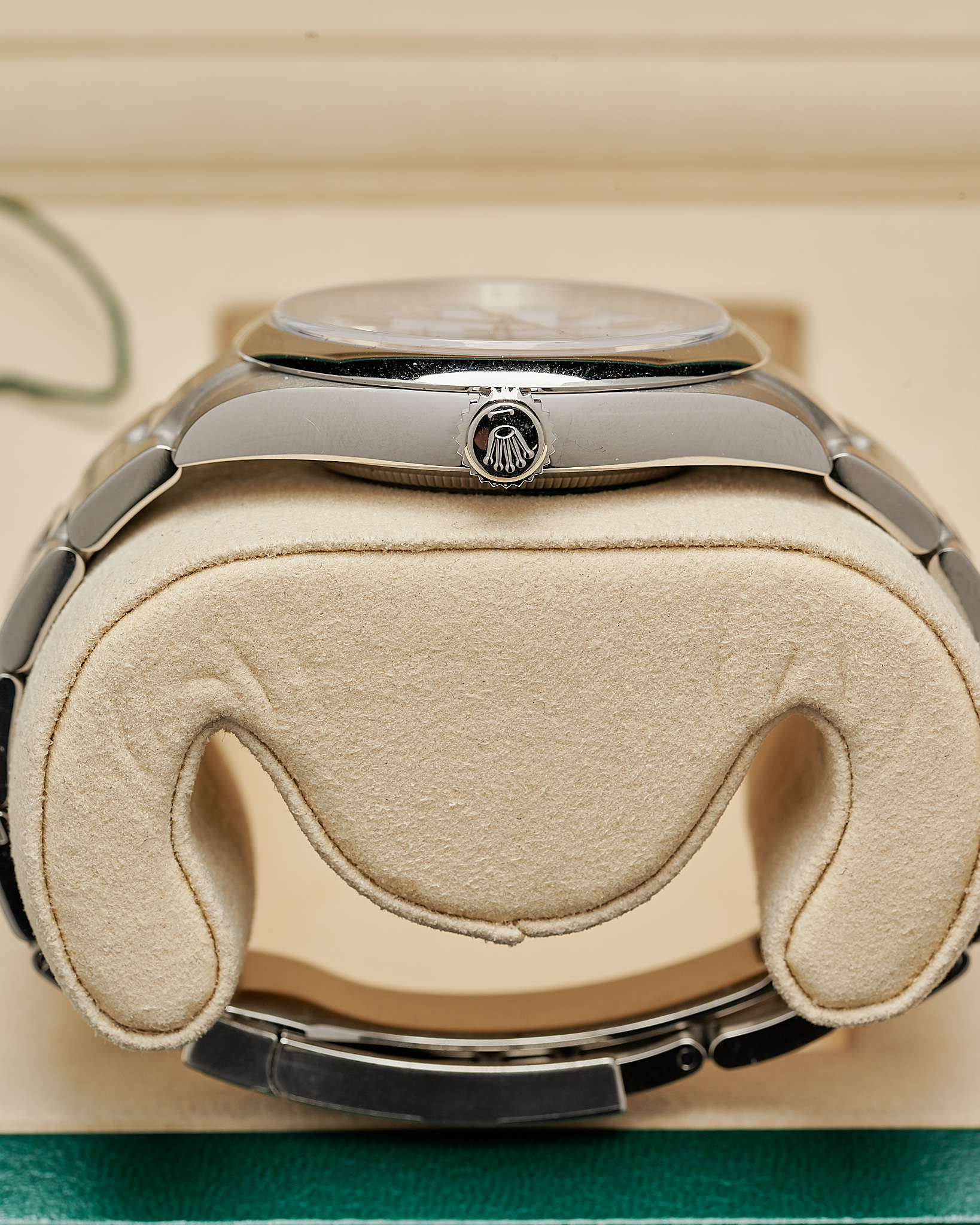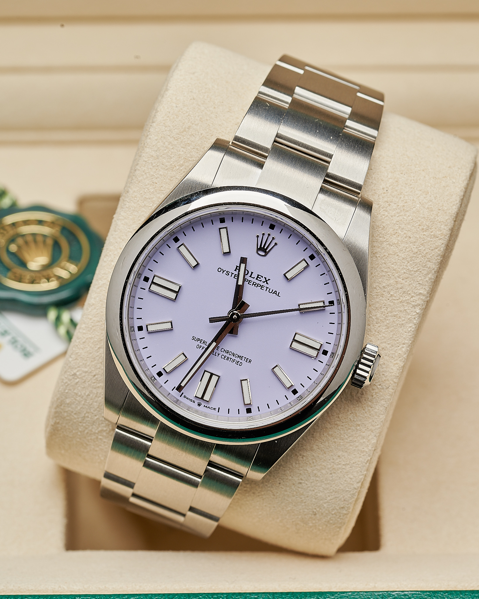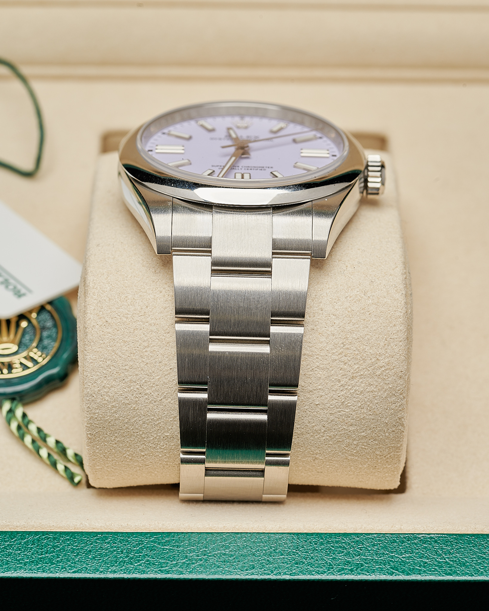 In unworn condition, this Rolex watch comes complete as a full set. Inclusive of both boxes, warranty card, serial tag (most important), round tag, booklet, wallet and original receipt.