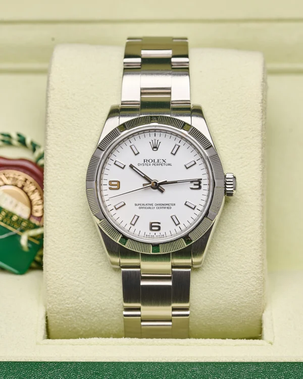 Rolex Oyster Perpetual 177210 with a crisp white dial and classic 31mm Oystersteel case.