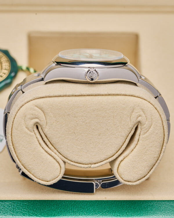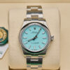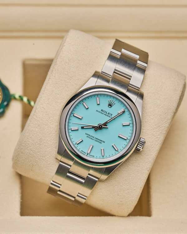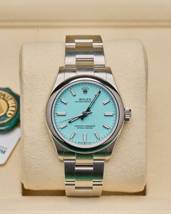 This sleek and contemporary 31mm Oyster Perpetual combines timeless style with Rolex’s renowned precision. Featuring the very popular “Tiffany” blue dial.