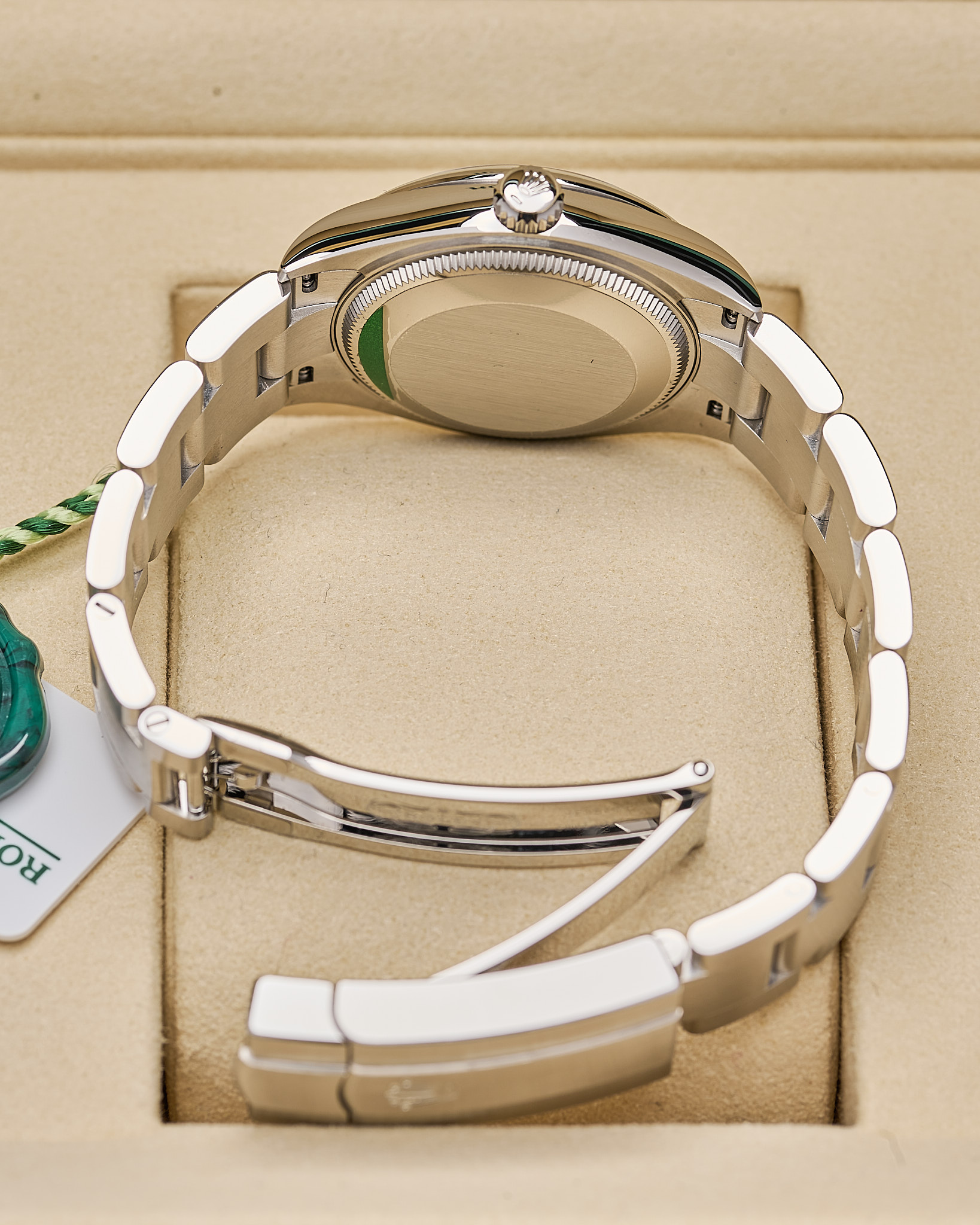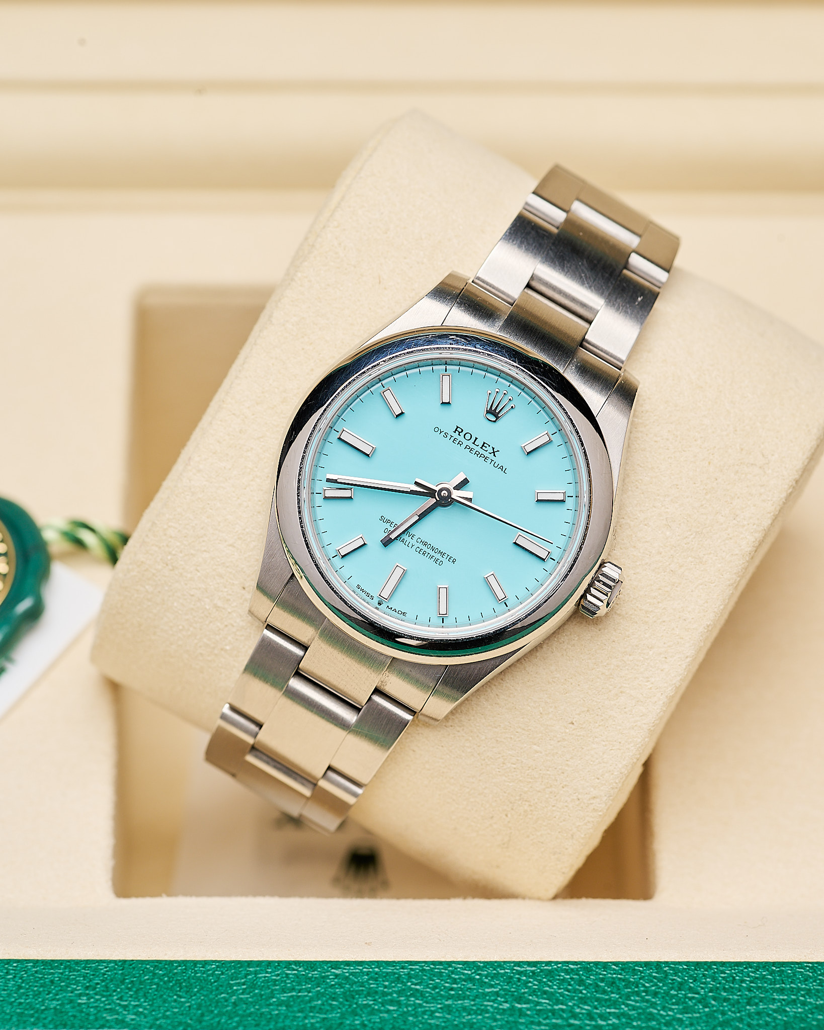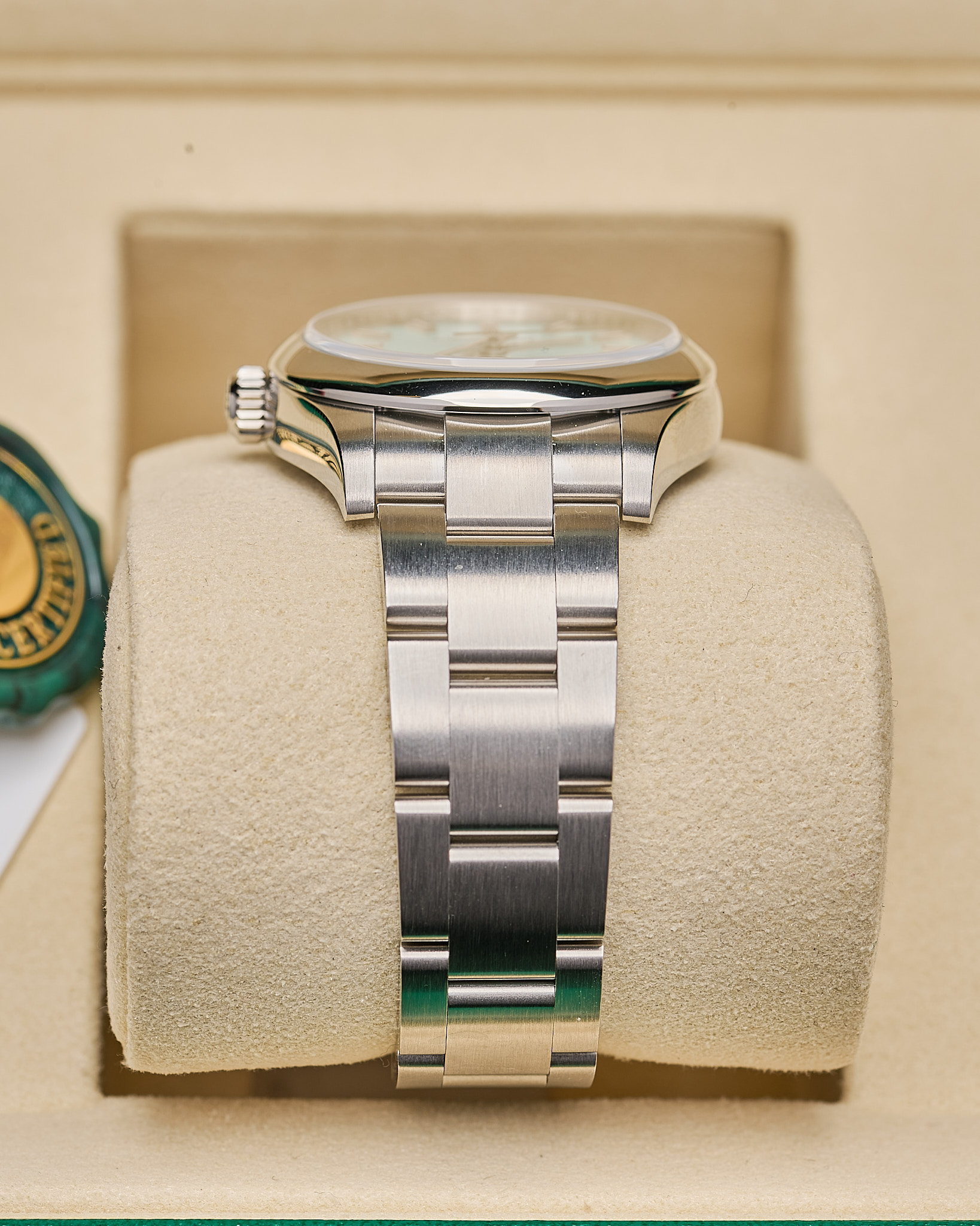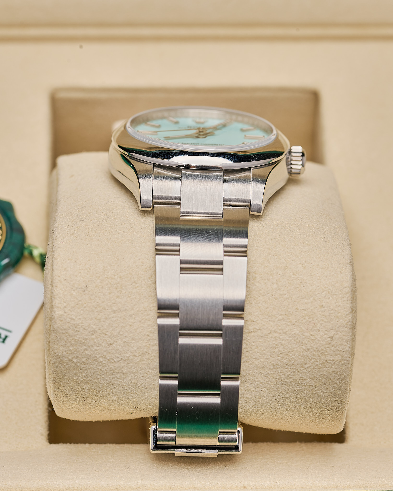 This sleek and contemporary 31mm Oyster Perpetual combines timeless style with Rolex’s renowned precision. Featuring the very popular “Tiffany” blue dial.