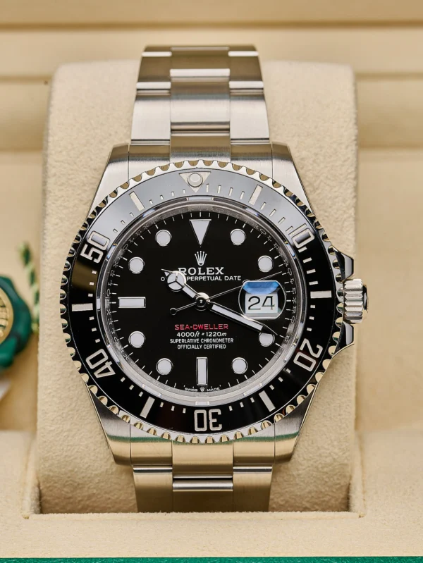 This Rolex Sea-Dweller 126600 2022 is a professional-grade dive watch featuring a 43mm Oystersteel case and a unidirectional rotatable bezel with a black Cerachrom ceramic insert. It is water-resistant to 1,220 meters (4,000 feet) and includes a helium escape valve for saturation diving. The watch is powered by the Rolex Calibre 3235 automatic movement. The black dial includes Chromalight luminescence and a Cyclops lens over the date at 3 o’clock. The red “Sea-Dweller” text references the original 1967 model. It comes with an Oyster bracelet and Glidelock extension system.