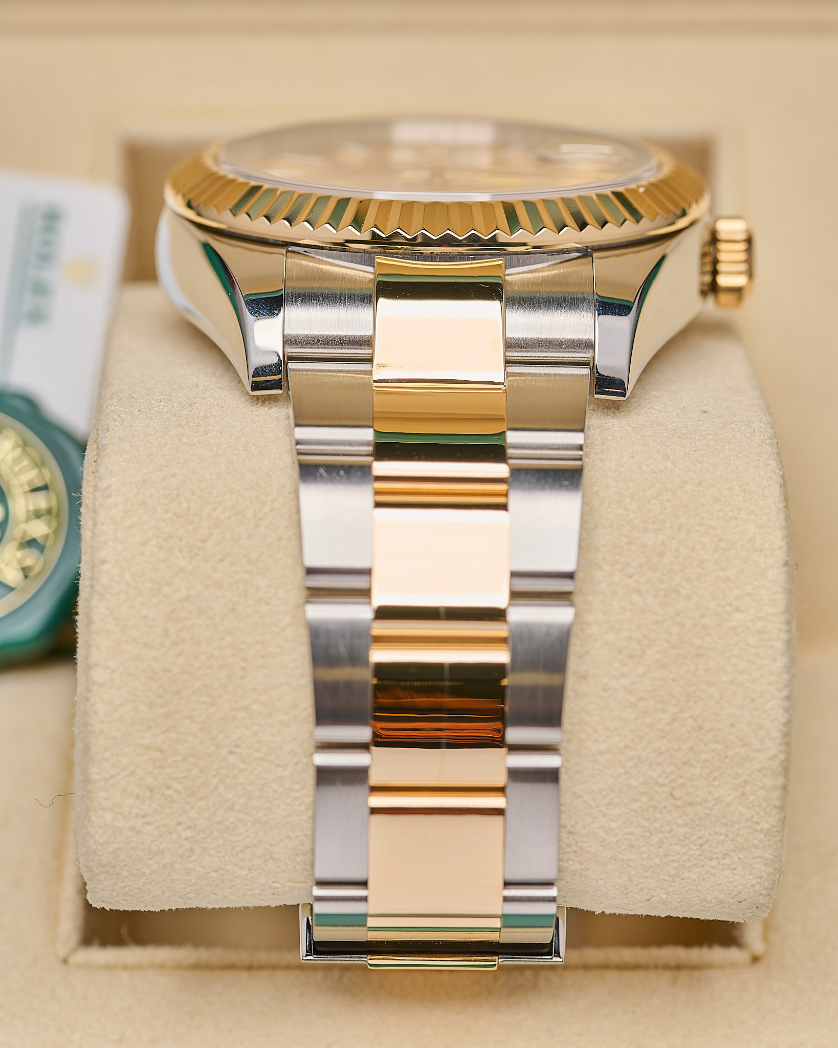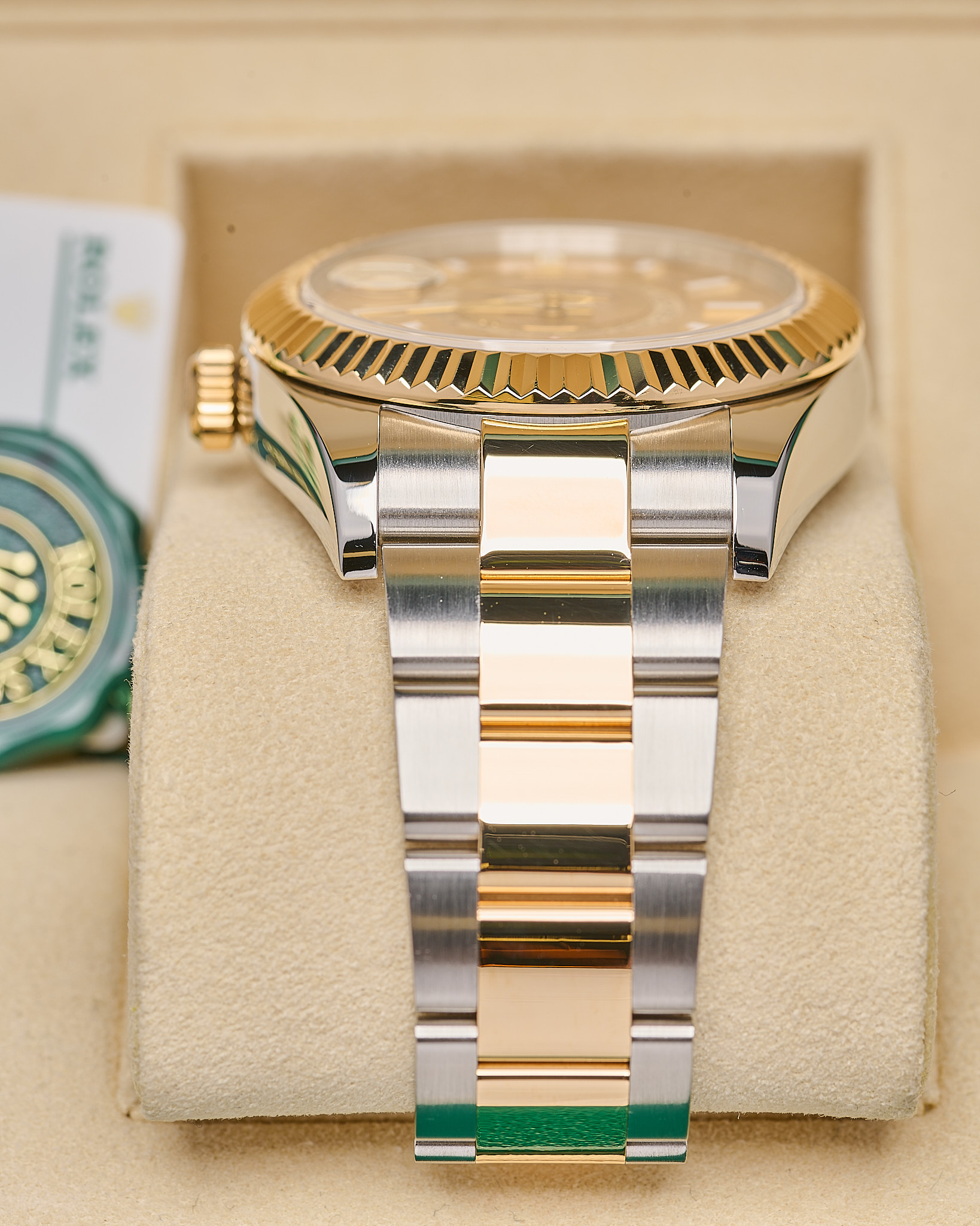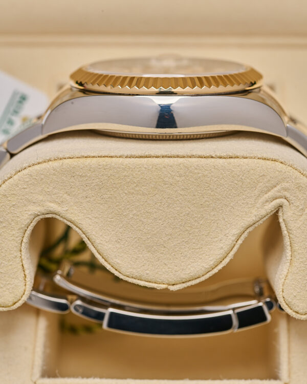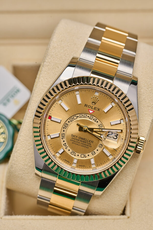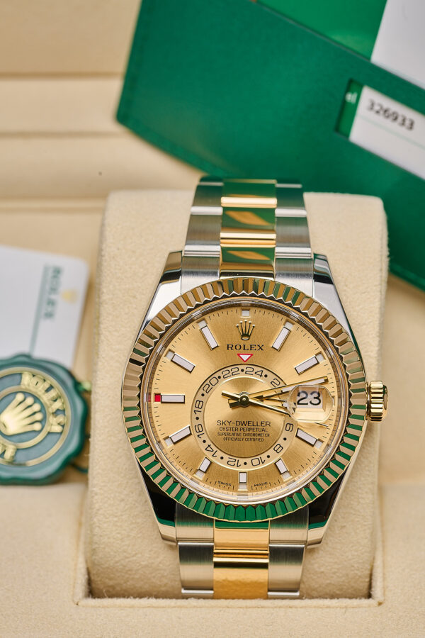 Rolex Sky-Dweller ref. 326933 features a 42mm stainless steel and yellow gold (Rolesor) case, complemented by a fluted 18ct yellow gold bezel.