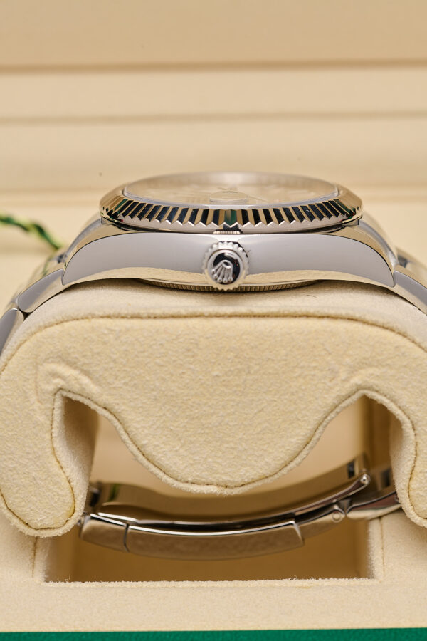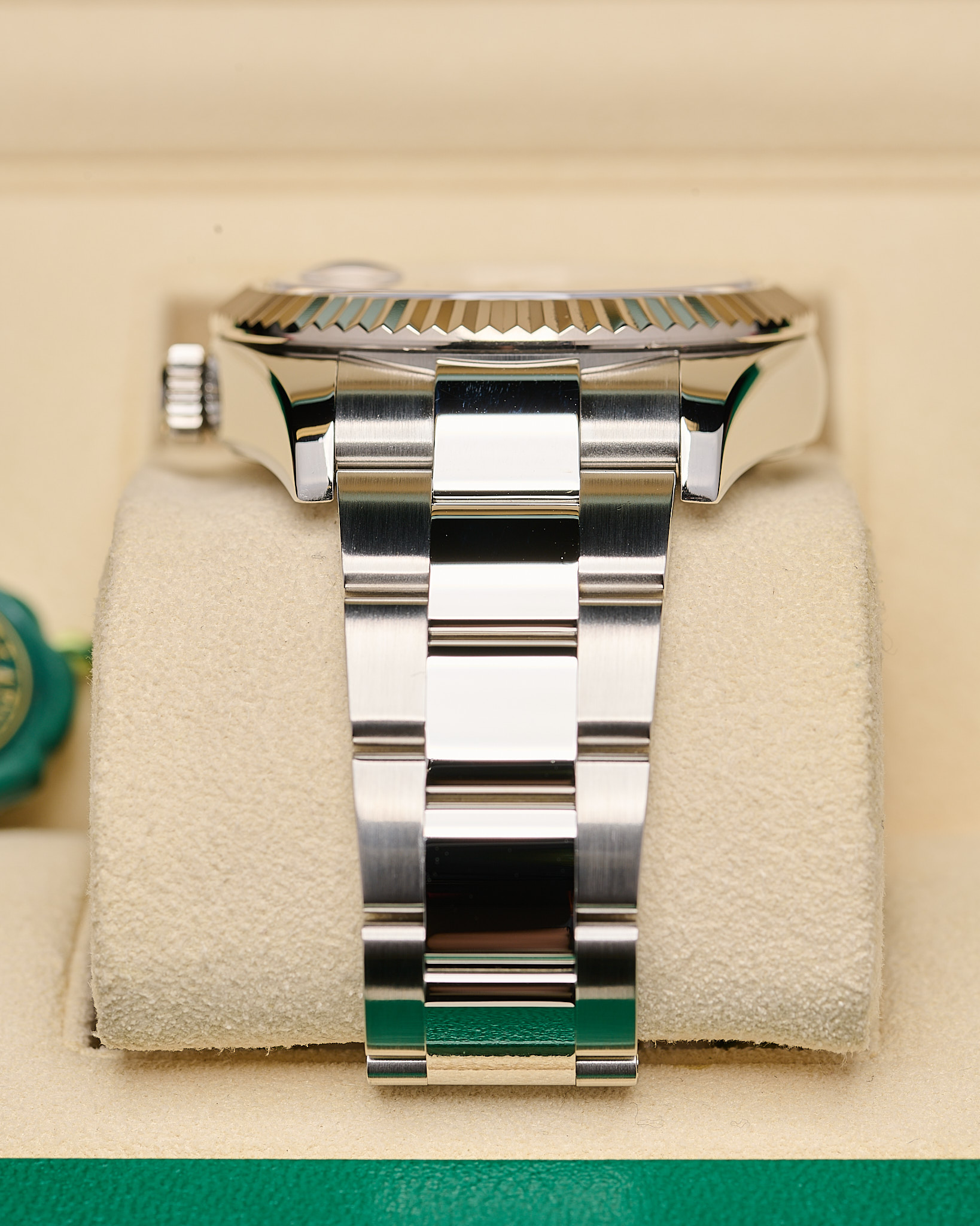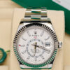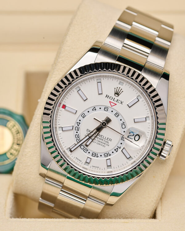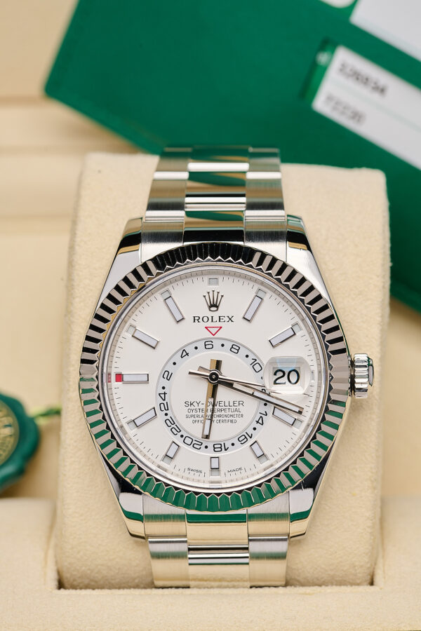 This Rolex Sky-Dweller 326934 features a 42mm stainless steel case with an 18ct white gold fluted bezel, paired with a clean white dial for excellent legibility. It displays dual time zones via an off-center 24-hour disc and includes an annual calendar function with the month indicated discreetly around the dial. Powered by the self-winding Rolex Calibre 9001, it offers outstanding precision and a 72-hour power reserve. Completed with the robust Oyster bracelet and water resistance to 100 meters, the 326934 is both technically advanced and unmistakably elegant.