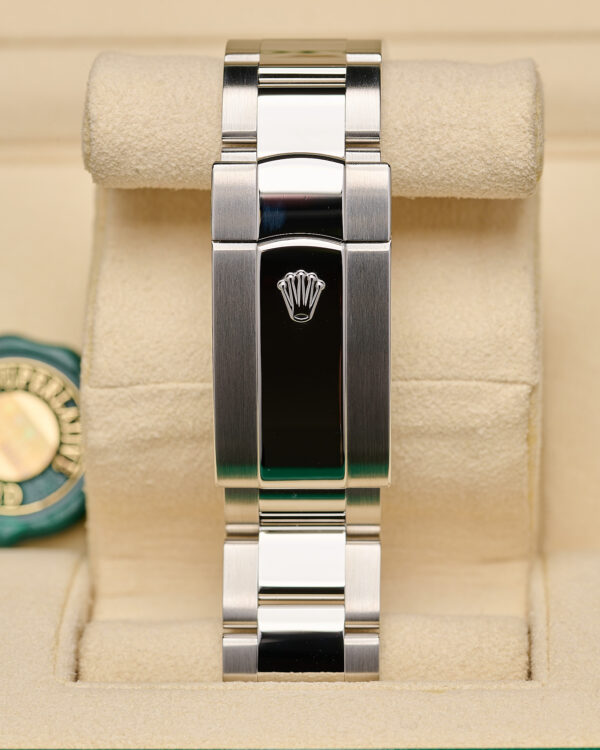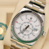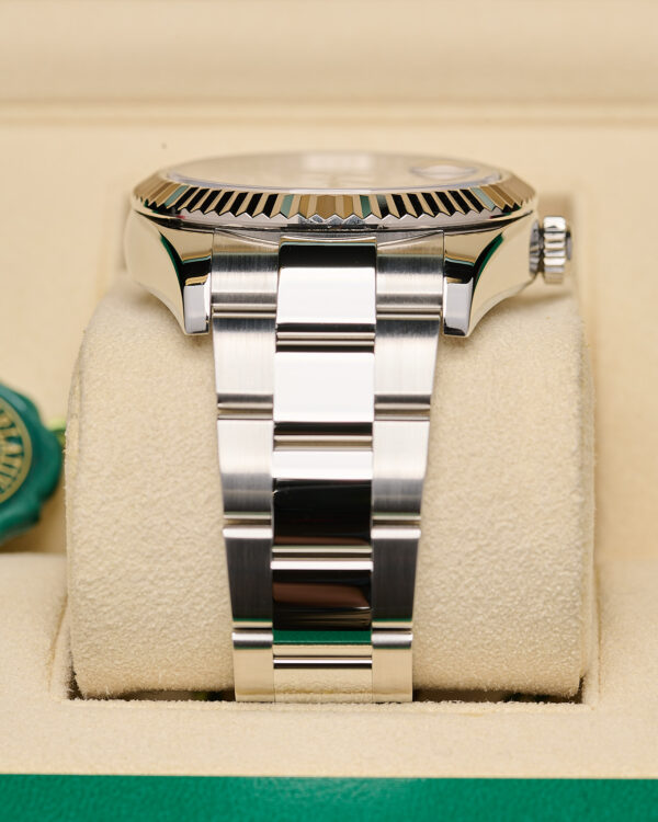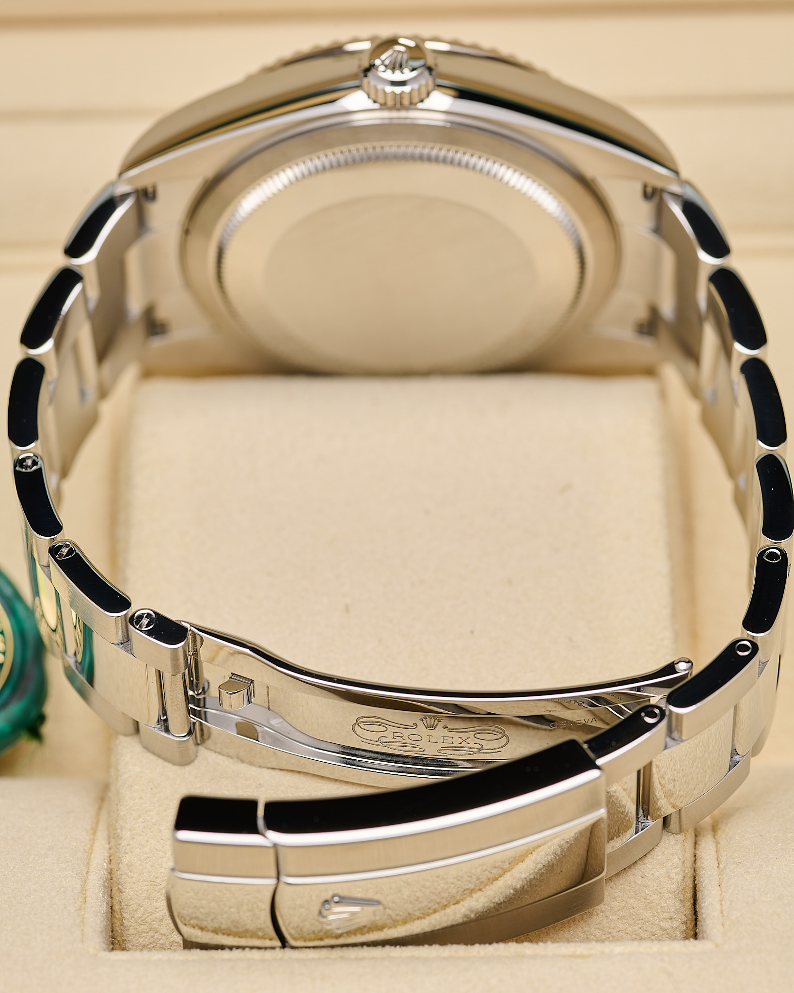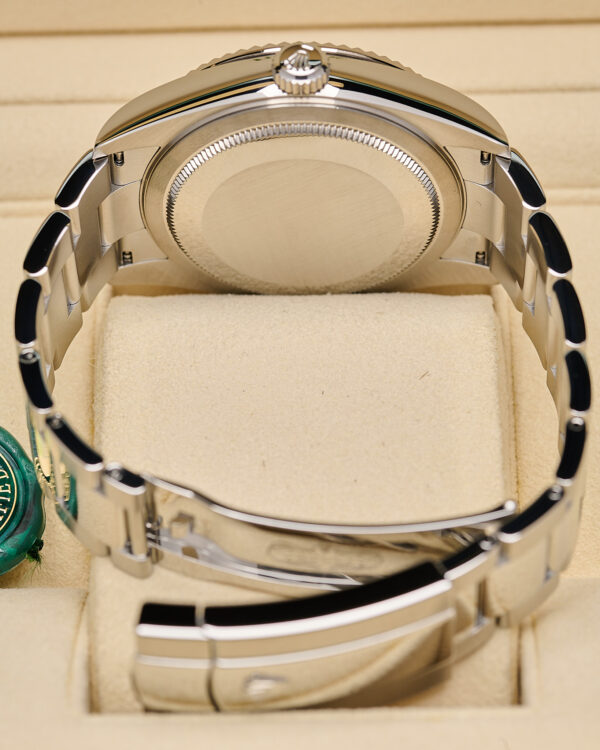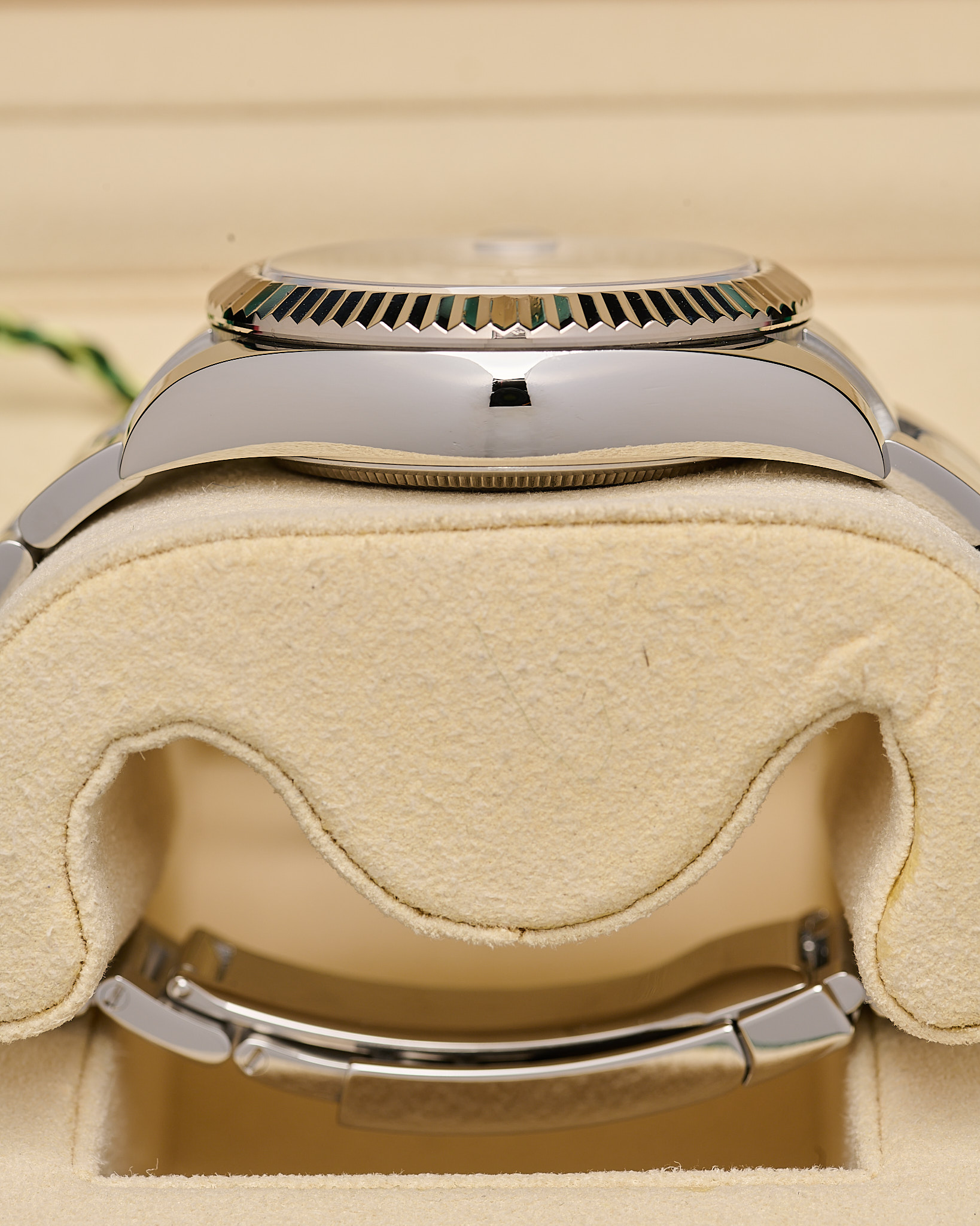 This Rolex Sky-Dweller 326934 features a 42mm stainless steel case with an 18ct white gold fluted bezel, paired with a clean white dial for excellent legibility. It displays dual time zones via an off-center 24-hour disc and includes an annual calendar function with the month indicated discreetly around the dial. Powered by the self-winding Rolex Calibre 9001, it offers outstanding precision and a 72-hour power reserve. Completed with the robust Oyster bracelet and water resistance to 100 meters, the 326934 is both technically advanced and unmistakably elegant.