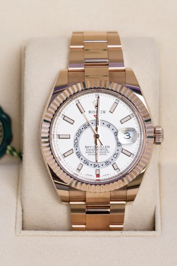 The Rolex Sky-Dweller 326935 combines 18ct Everose gold with a clean, sophisticated white dial for a look that’s both modern and timeless. Featuring dual time zones and an annual calendar, this 42mm icon is crafted from solid 18ct rose gold.