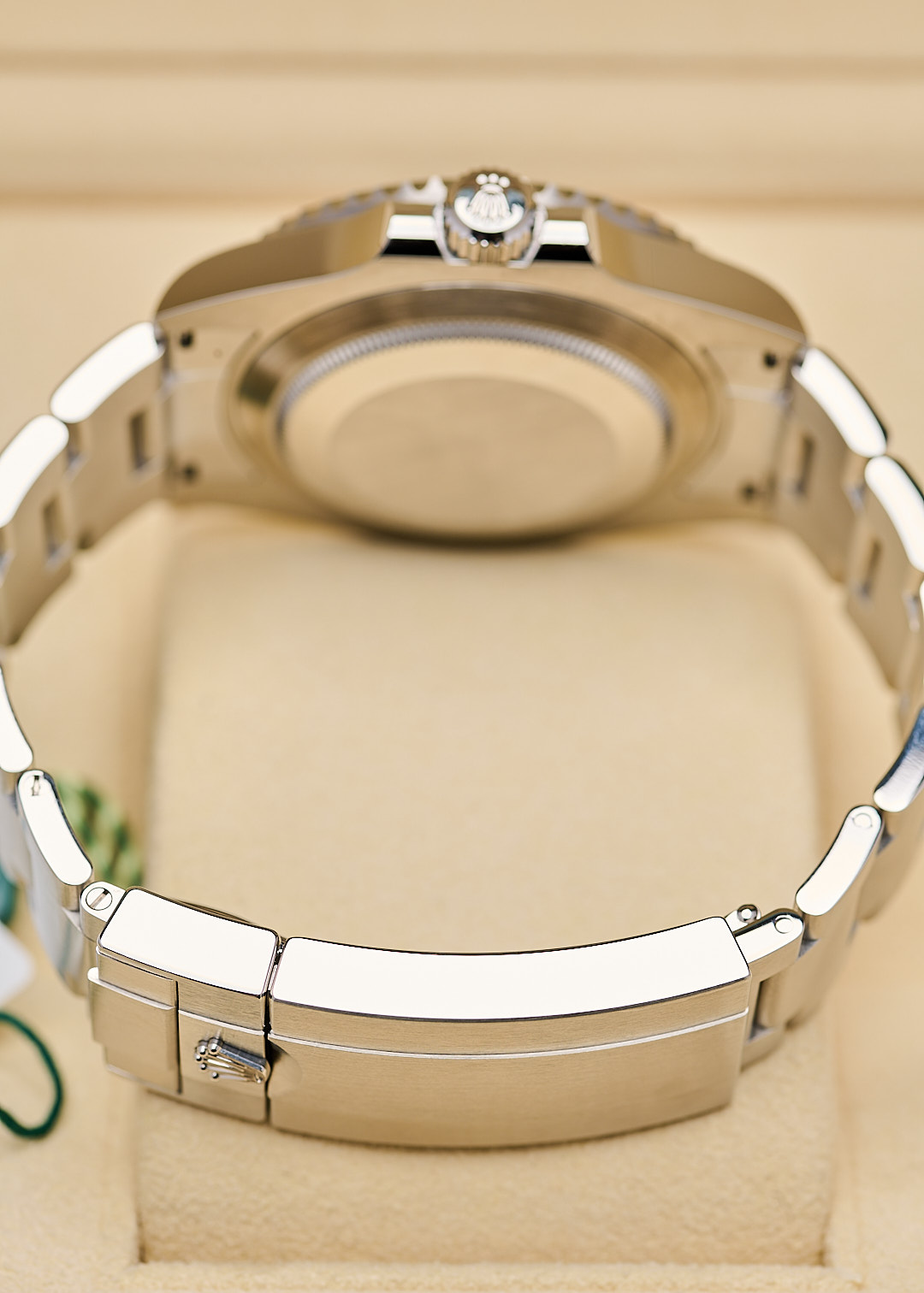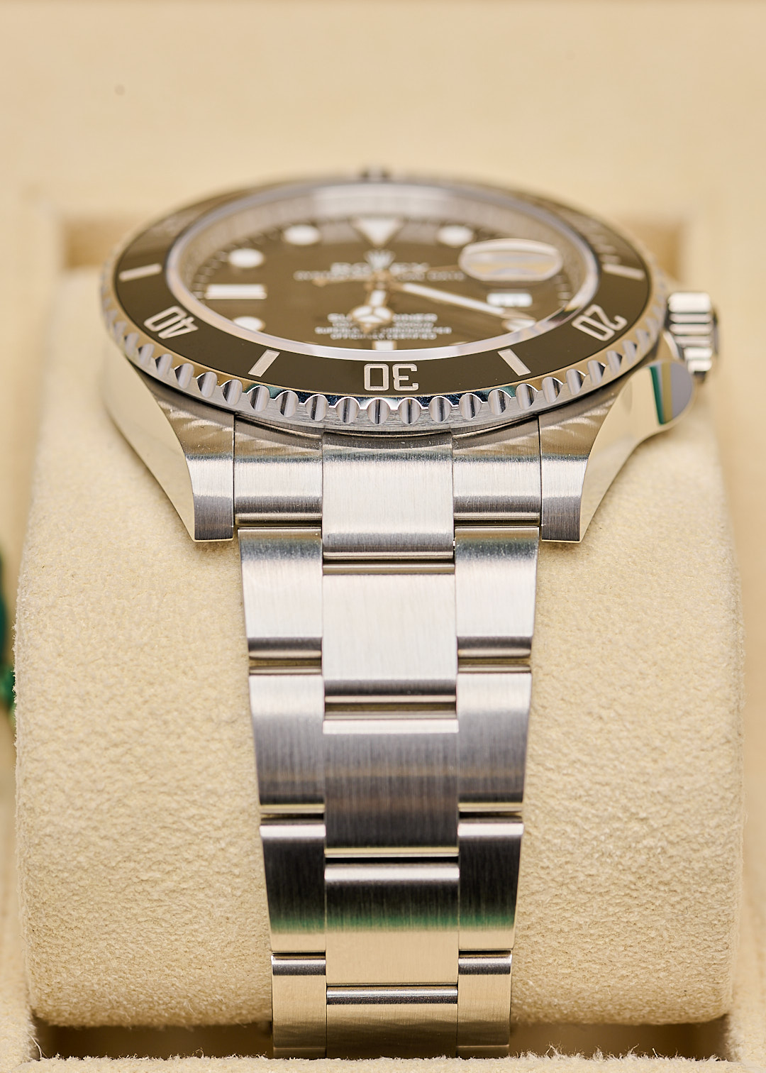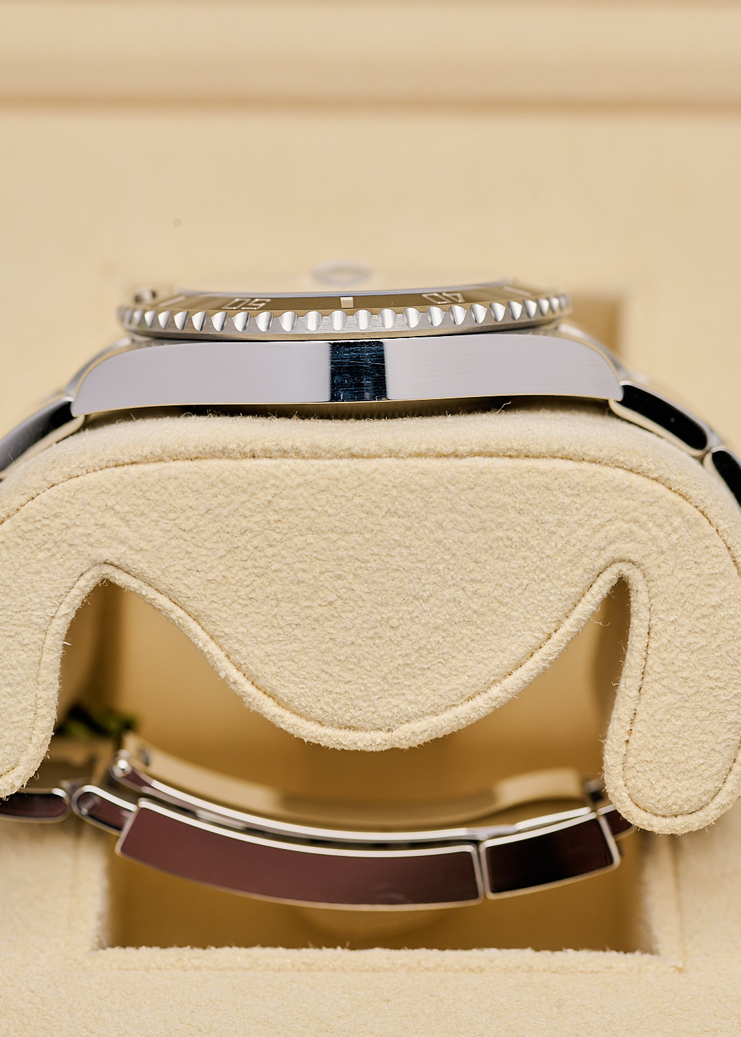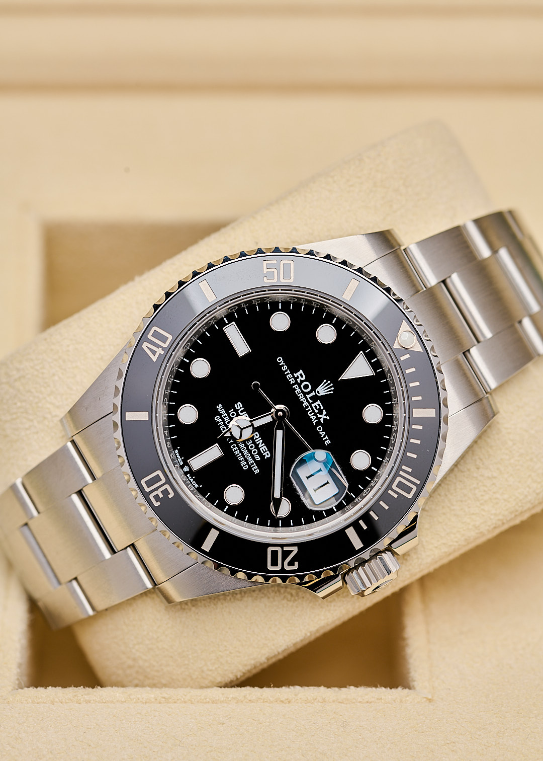 The Rolex Submariner 126610LN, features a 41mm stainless steel case with a black Cerachrom unidirectional bezel and black dial. Powered by the automatic calibre 3136 movement, it offers a date function at 3 o’clock with a Cyclops lens. Fitted with an Oyster bracelet and Glidelock clasp for tool-free adjustment.