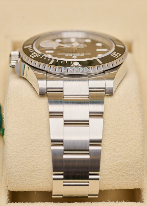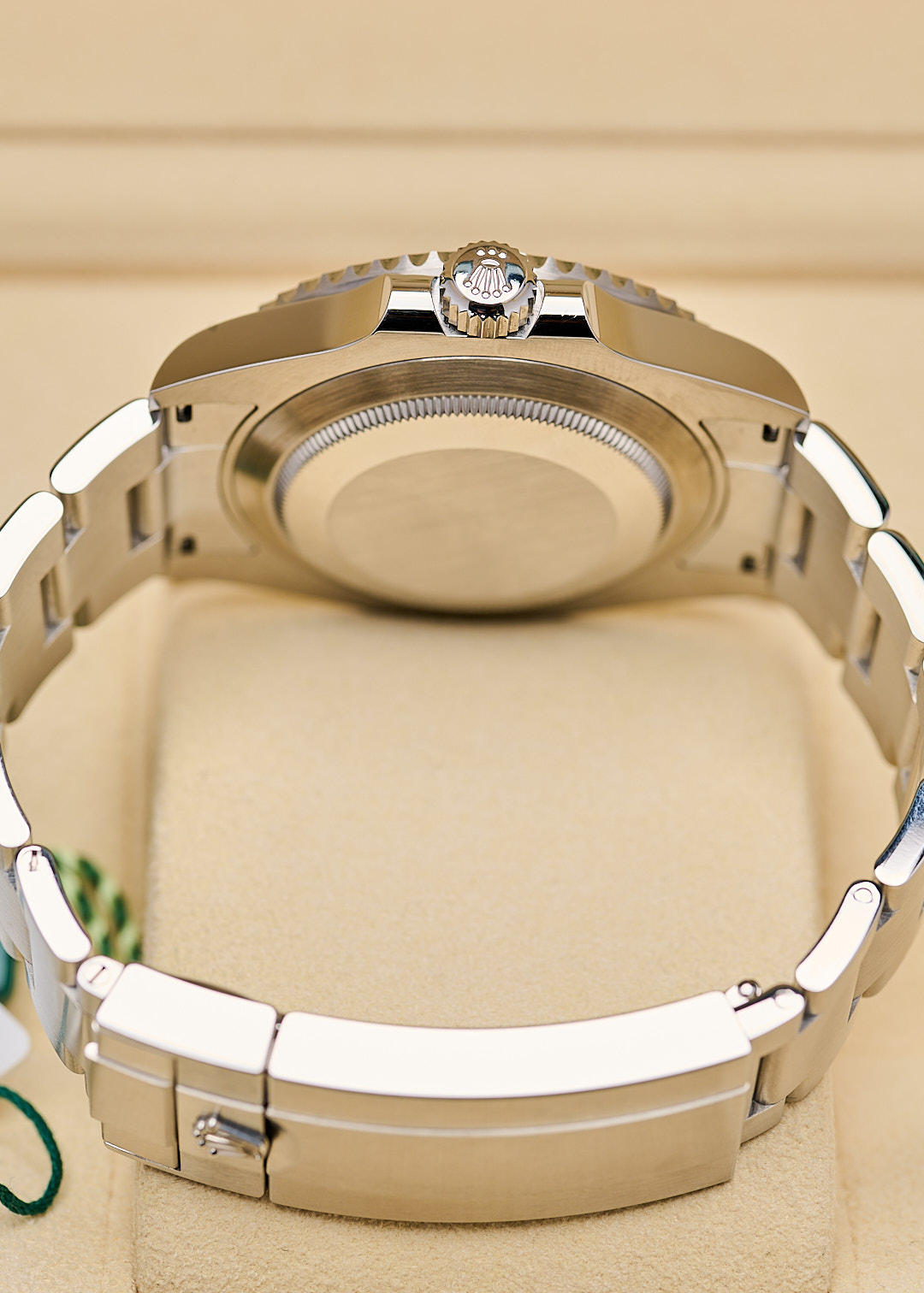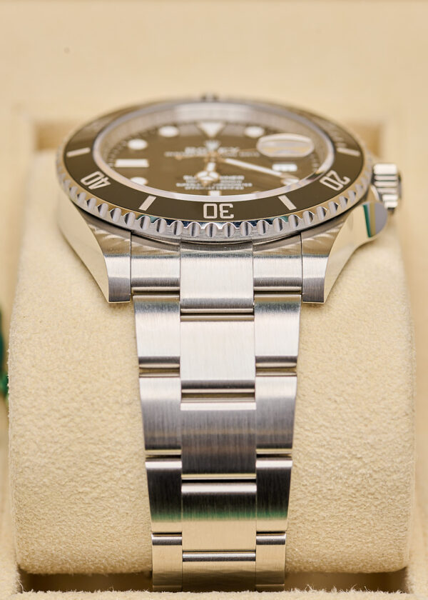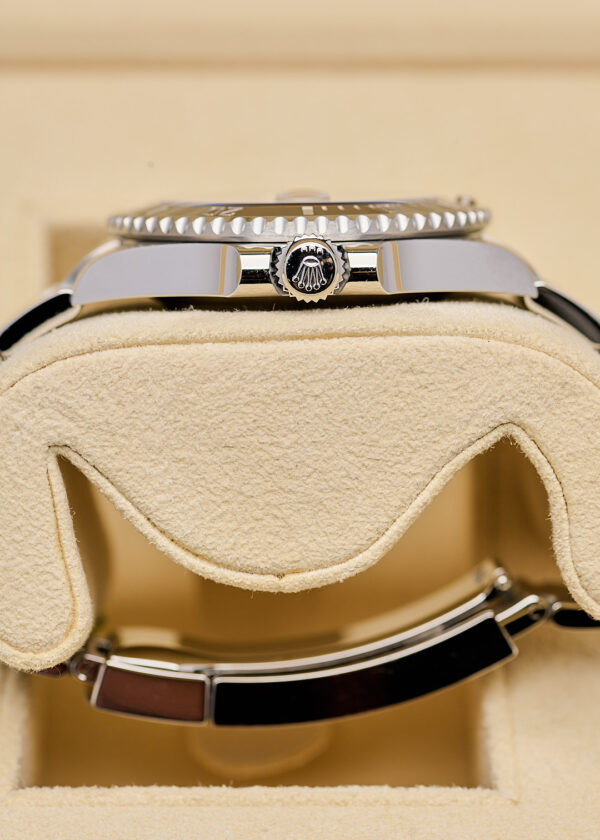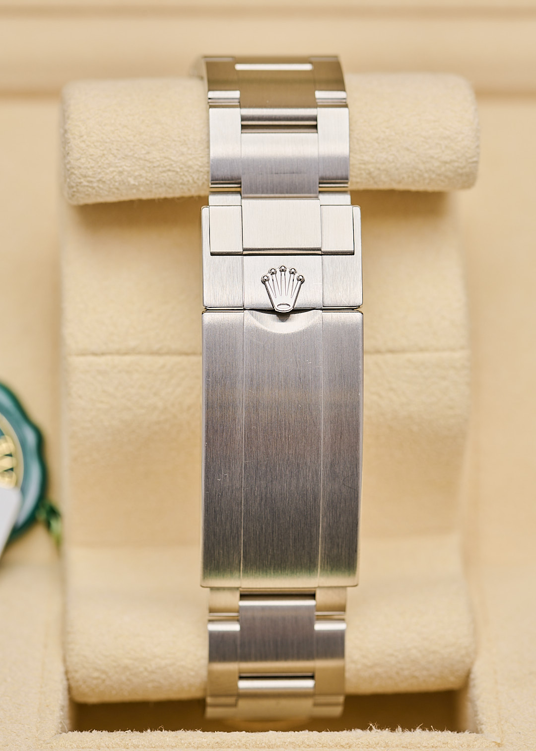 The Rolex Submariner 126610LN, features a 41mm stainless steel case with a black Cerachrom unidirectional bezel and black dial. Powered by the automatic calibre 3136 movement, it offers a date function at 3 o’clock with a Cyclops lens. Fitted with an Oyster bracelet and Glidelock clasp for tool-free adjustment.