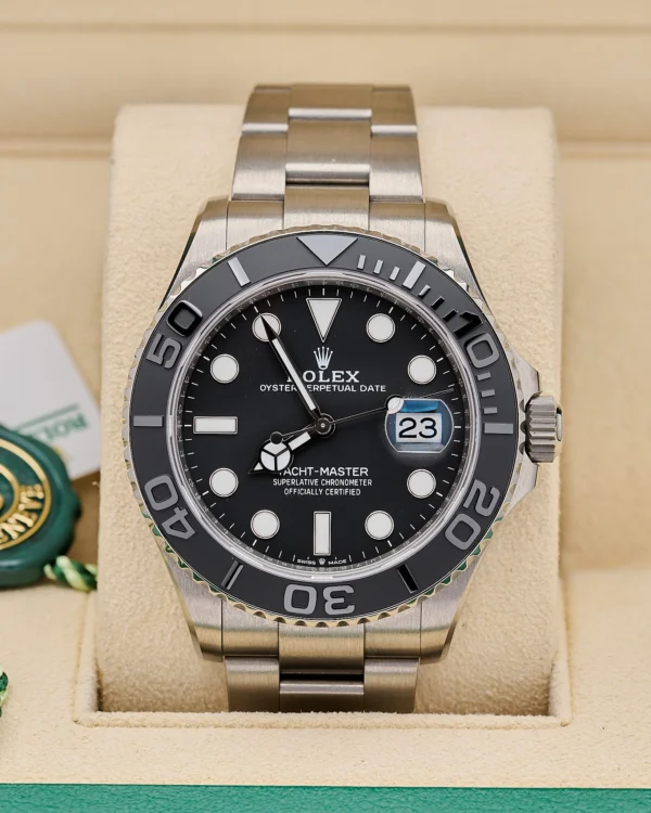 This rare Rolex Yacht-Master ref. 226627 from 2024 features a 42mm RLX titanium case with a matching bidirectional bezel and matte black dial.