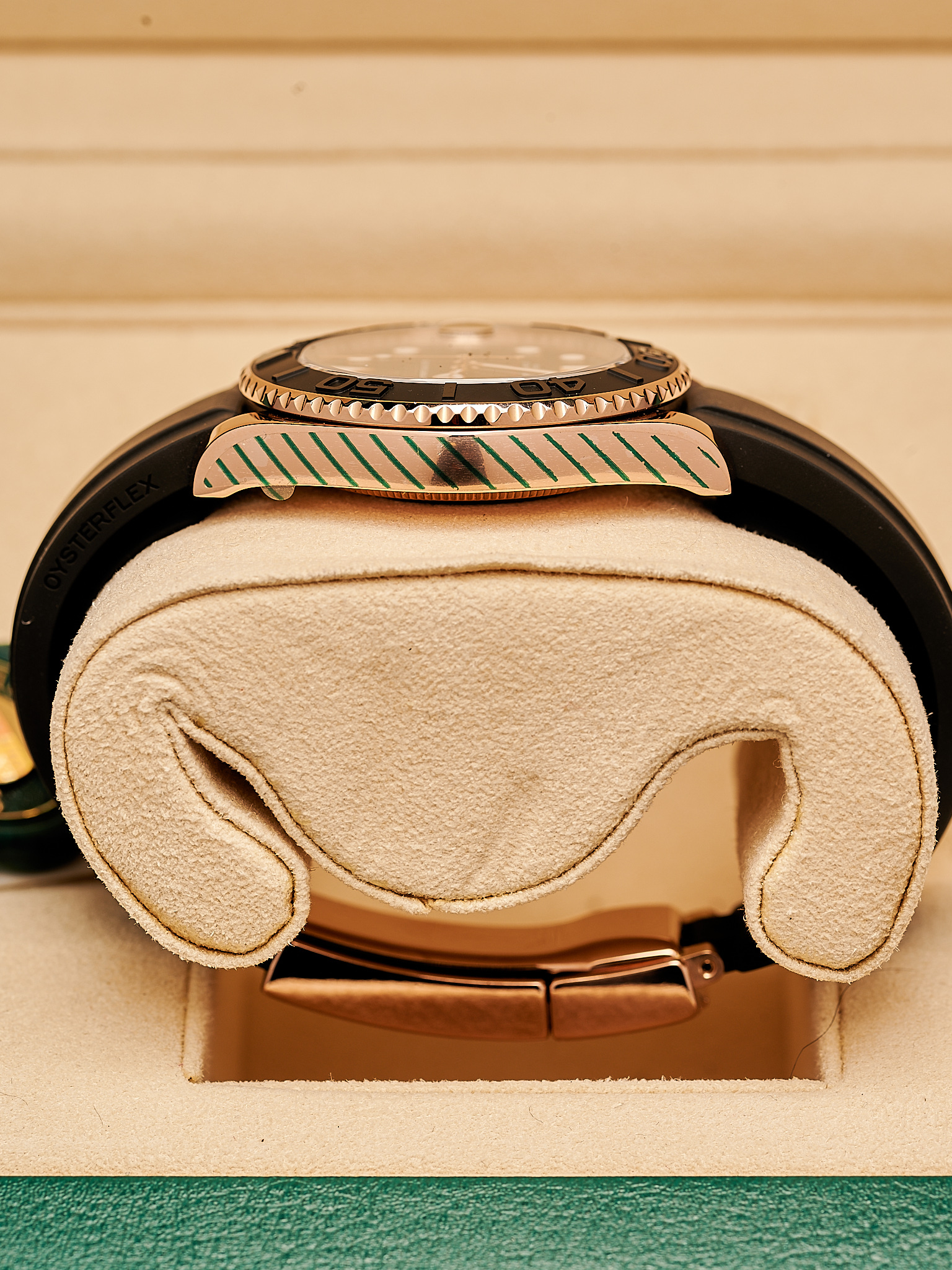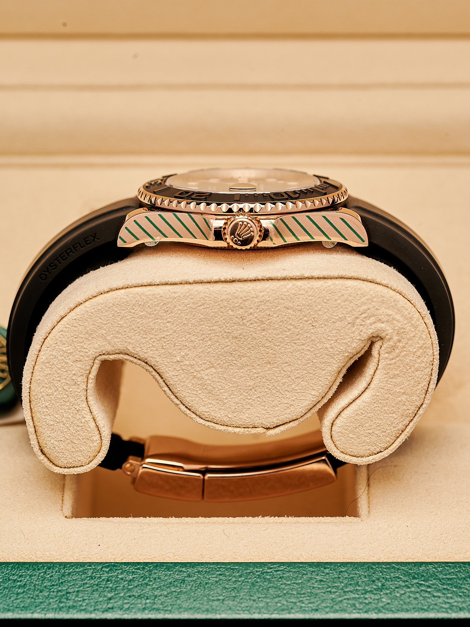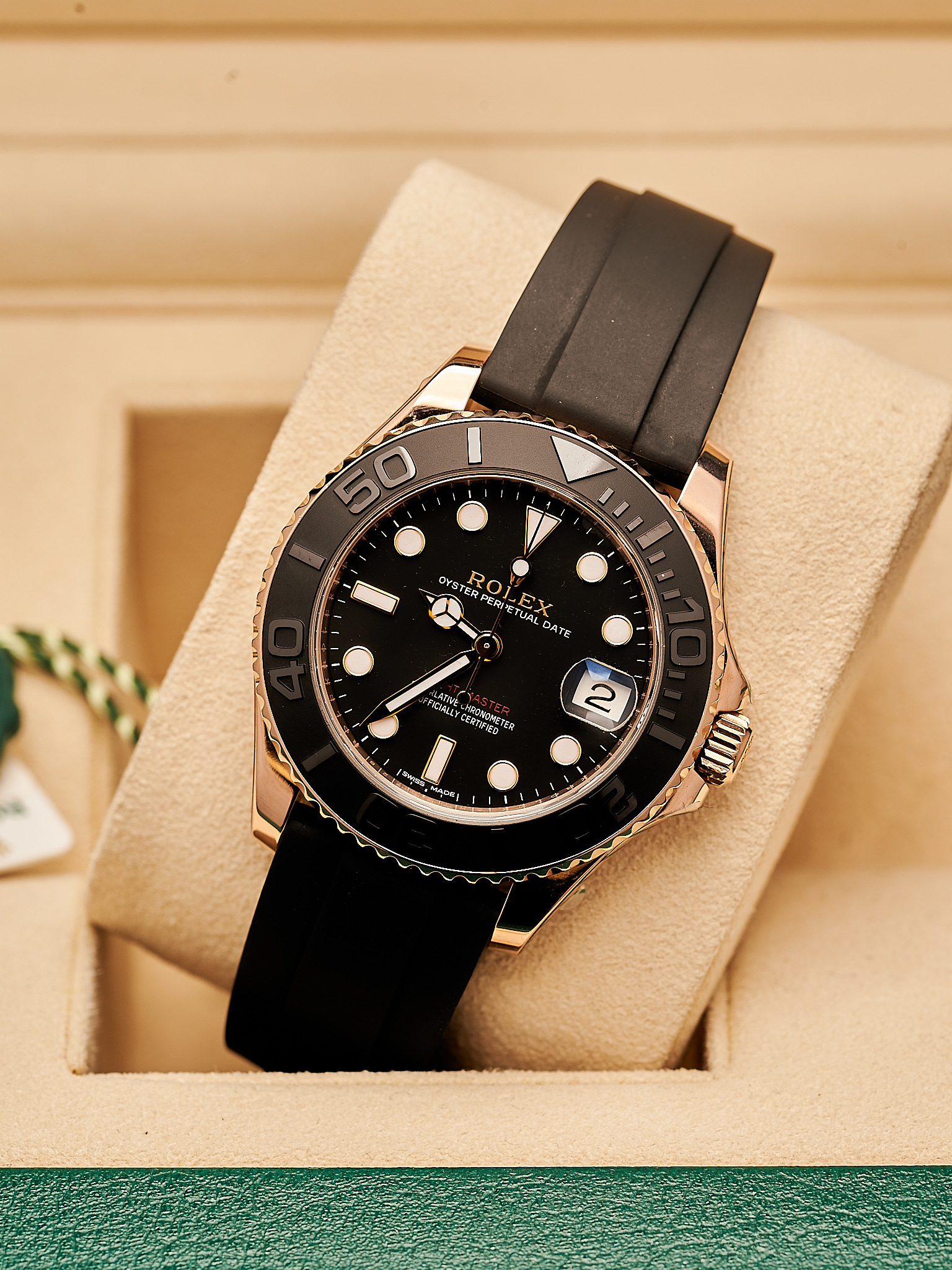 Crafted in 18ct Everose gold, This watch features a striking black Cerachrom bezel and matching Oysterflex bracelet, offering exceptional durability with a sporty, contemporary edge. The 37mm case provides a versatile fit, while the black dial with luminous hour markers ensures clear readability in any setting.