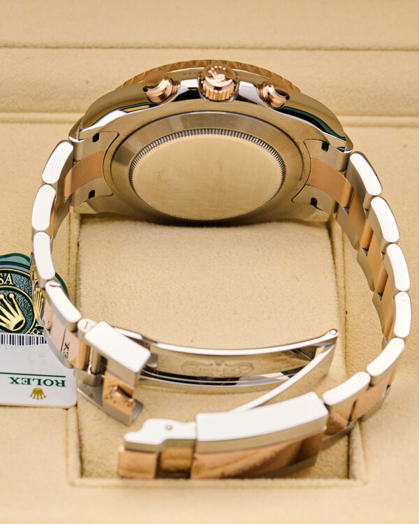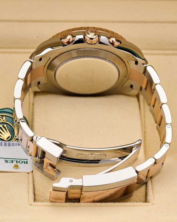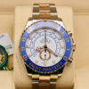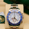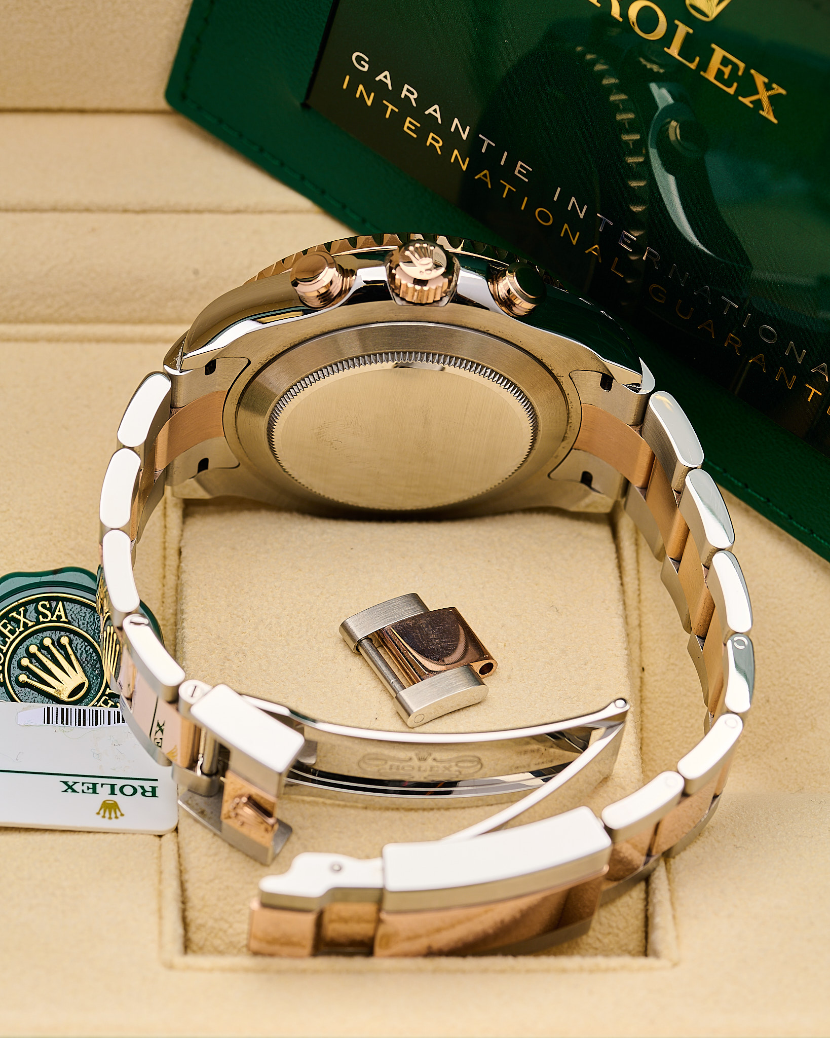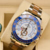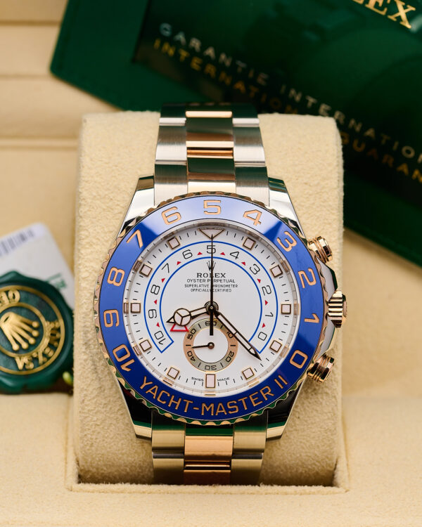 Driven by the Rolex Calibre 4161, an in-house automatic chronograph movement, it features the exclusive regatta countdown function—a programmable, mechanical marvel designed for professional sailors. The white lacquer dial, accented with blue Cerachrom bezel and Everose gold markers, delivers legibility and style in any light.
