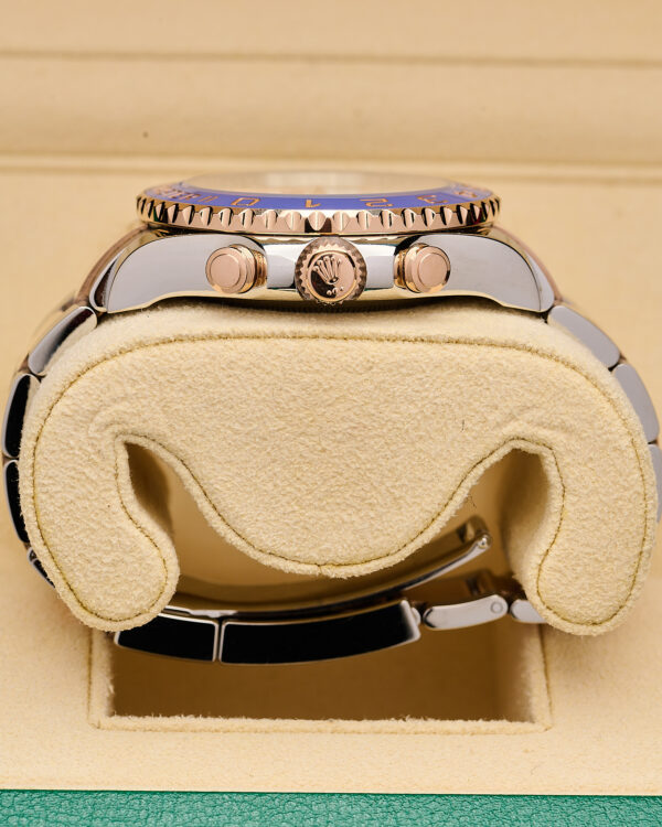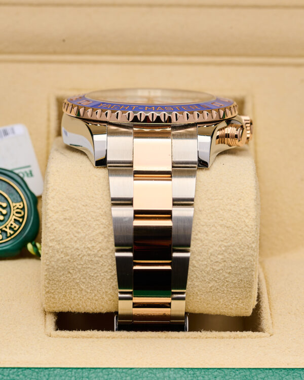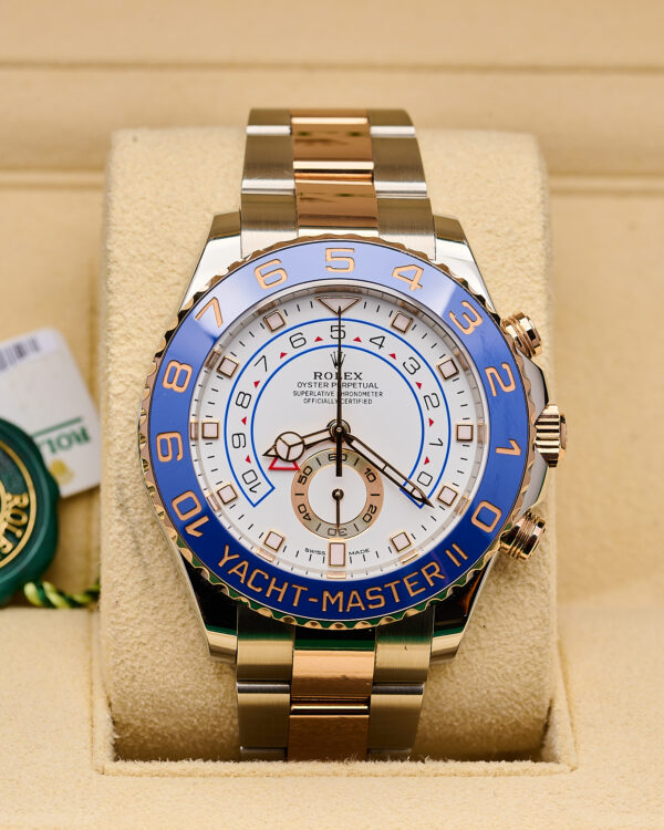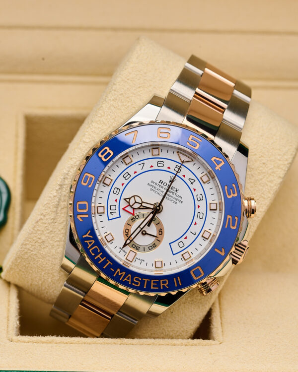 Crafted for those who navigate with purpose, the Rolex Yacht-Master II 116681 (2022) blends technical brilliance with refined luxury. Its 44mm Oyster case, forged from Rolesor Everose (stainless steel and 18k Everose gold), embodies strength and sophistication in perfect harmony.